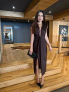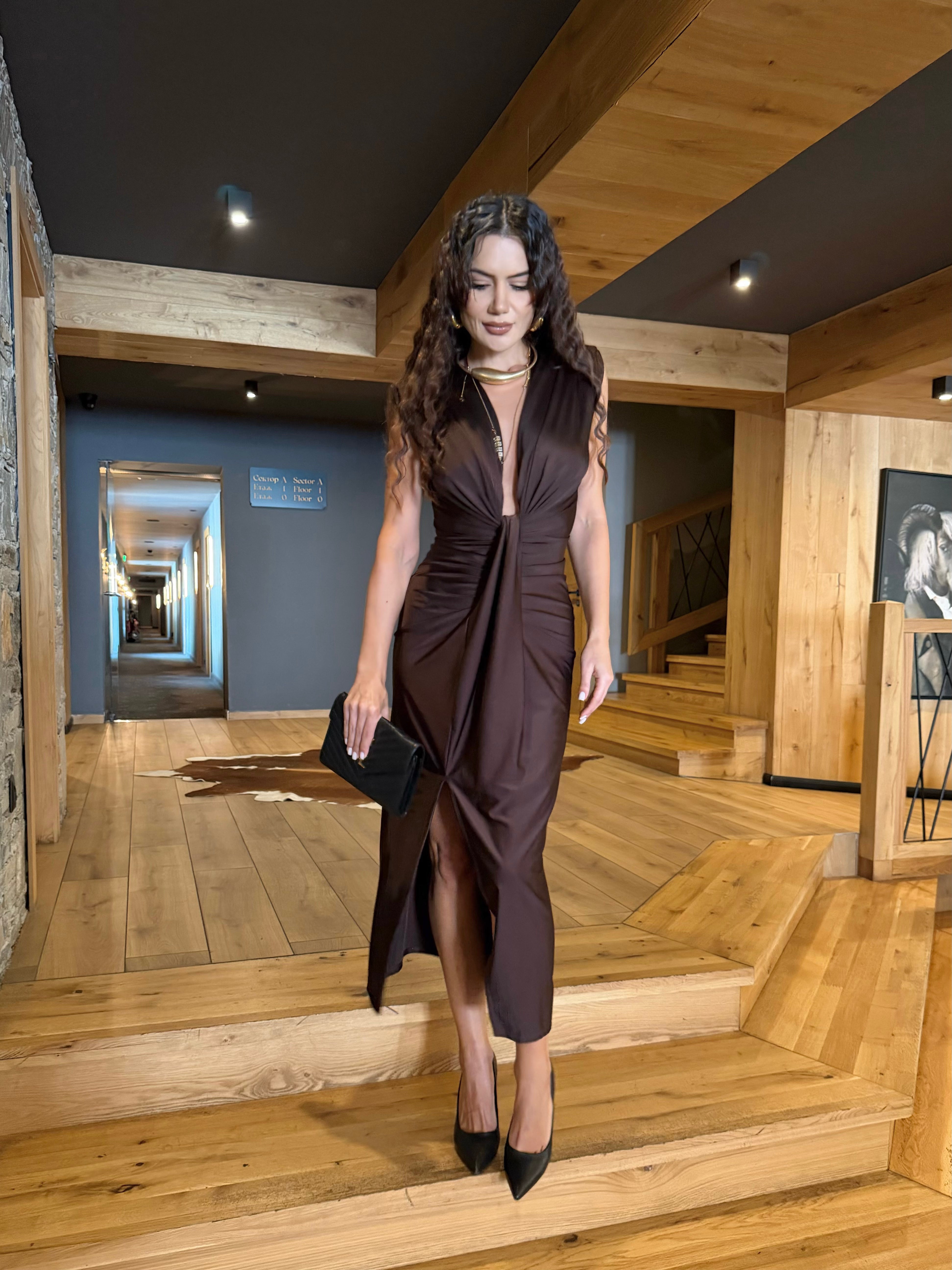 Роклята KIM е създадена за жени, които не се страхуват да бъдат забелязани. С елегантна драпировка, подчертана талия и дълбоко V-деколте, този модел комбинира сексапил с изисканост. Изработена от лека, еластична материя с луксозен сатениран финиш, роклята подчертава силуета и се адаптира към тялото благодарение на универсалния си размер.