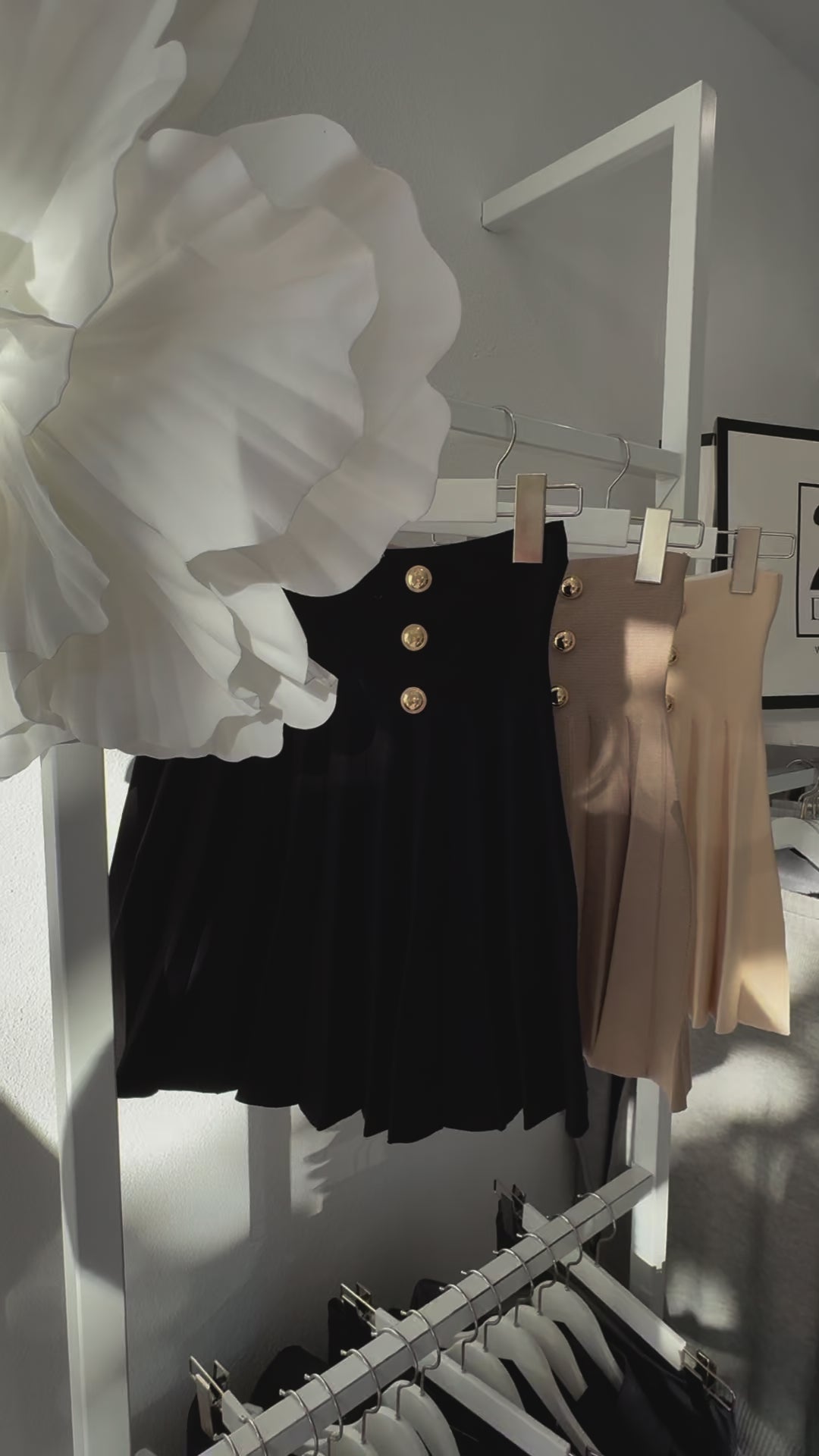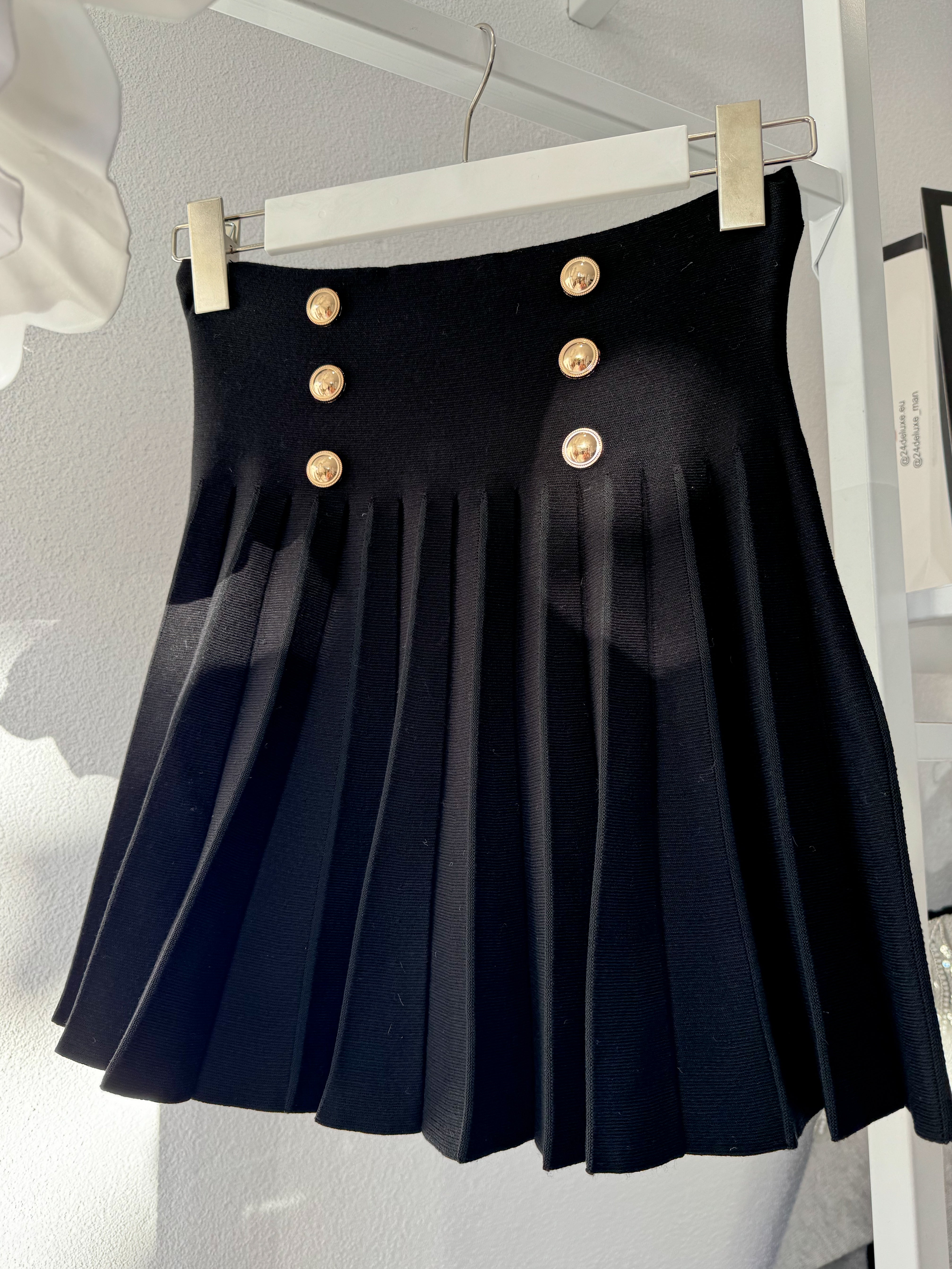 Стилна и секси пола от стегнато еластично плетиво, златни копчета и дължина над коляното!