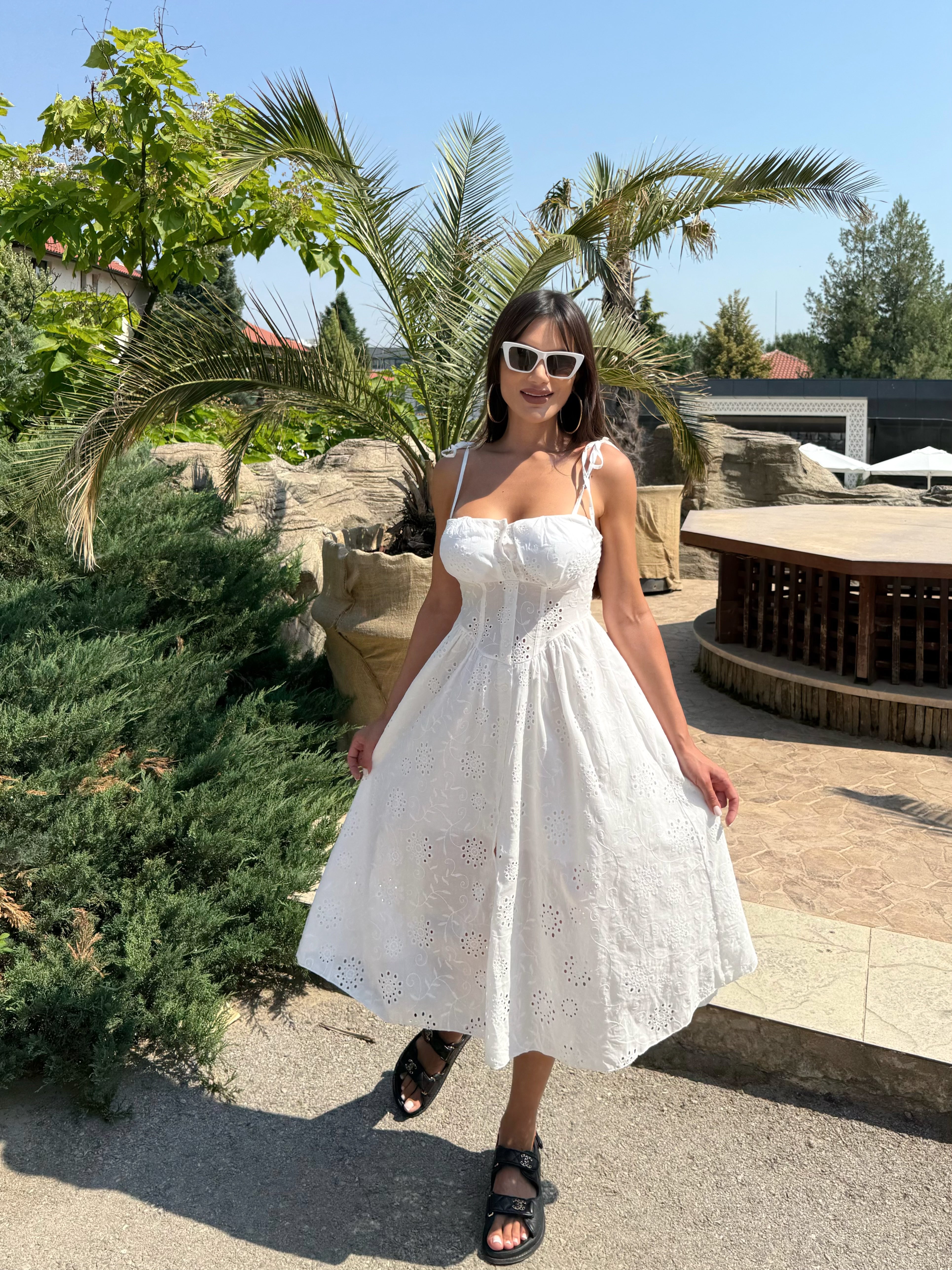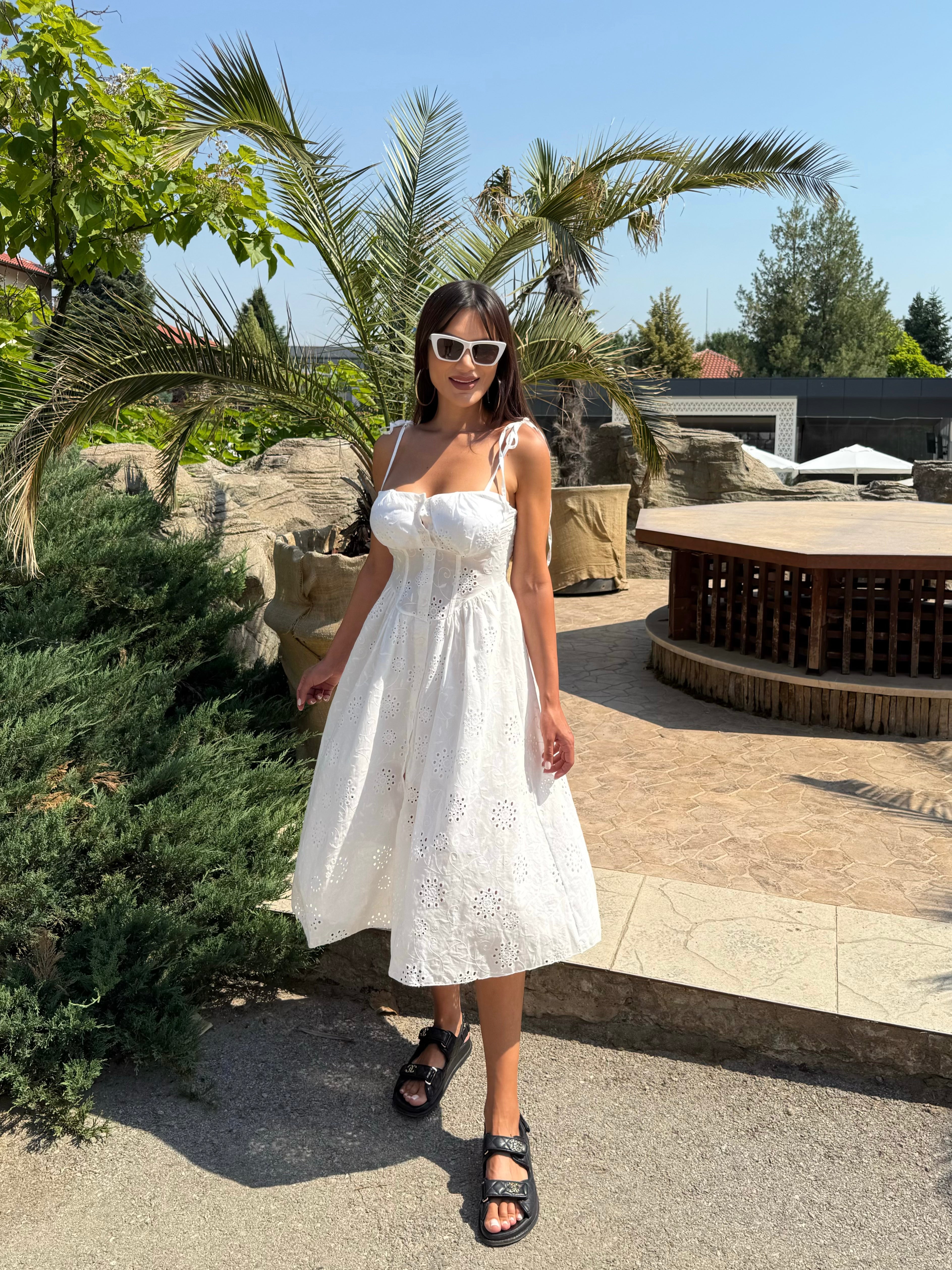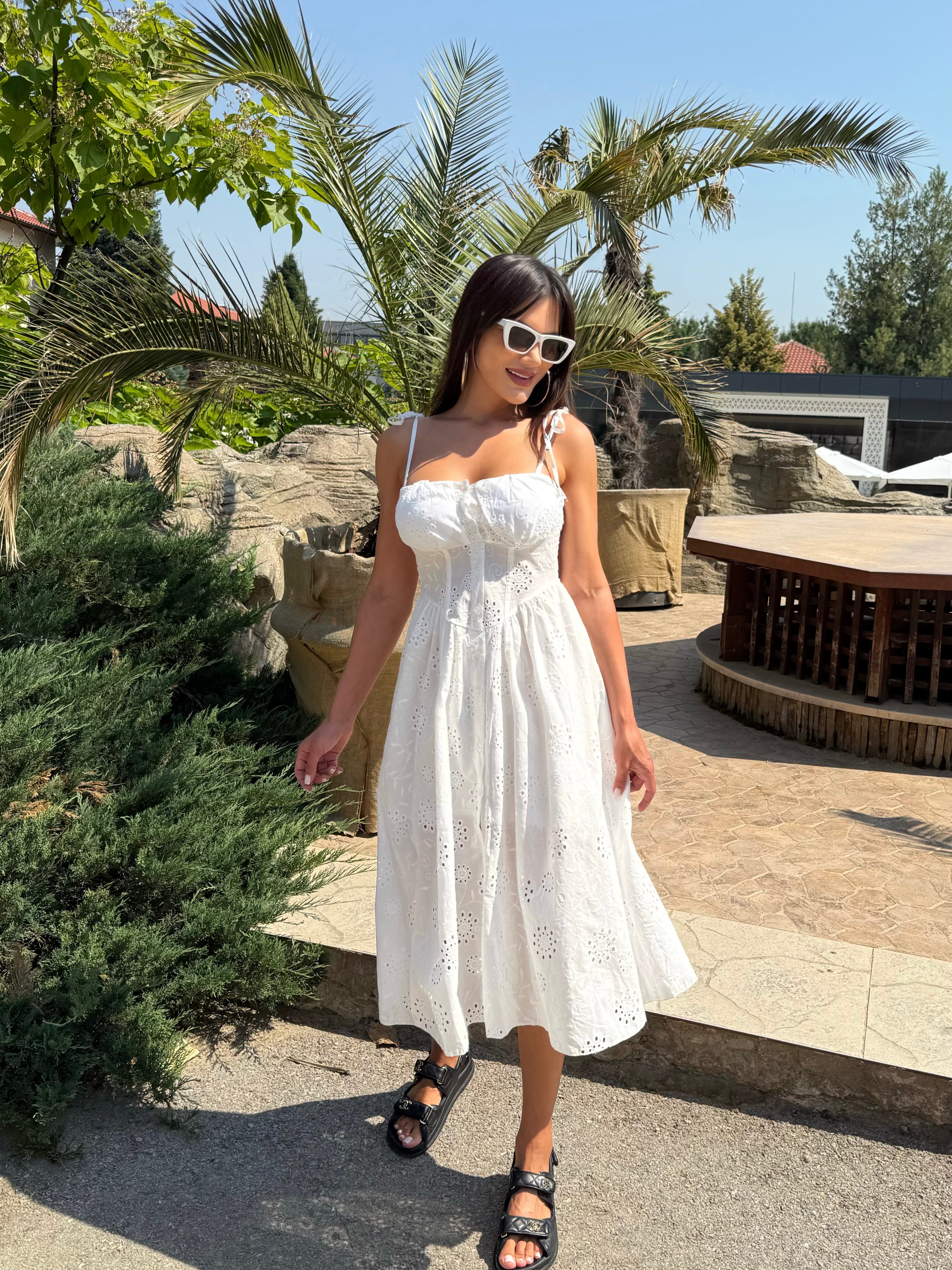 Изработена от висококачествен памук с елегантна broderie anglaise бродерия, тази рокля впечатлява със своята нежност и женствена линия. Регулируемите връзки на раменете позволяват перфектно прилягане, а вталеният силует с разкроена долна част подчертава талията и създава ефирно движение при всяка стъпка.