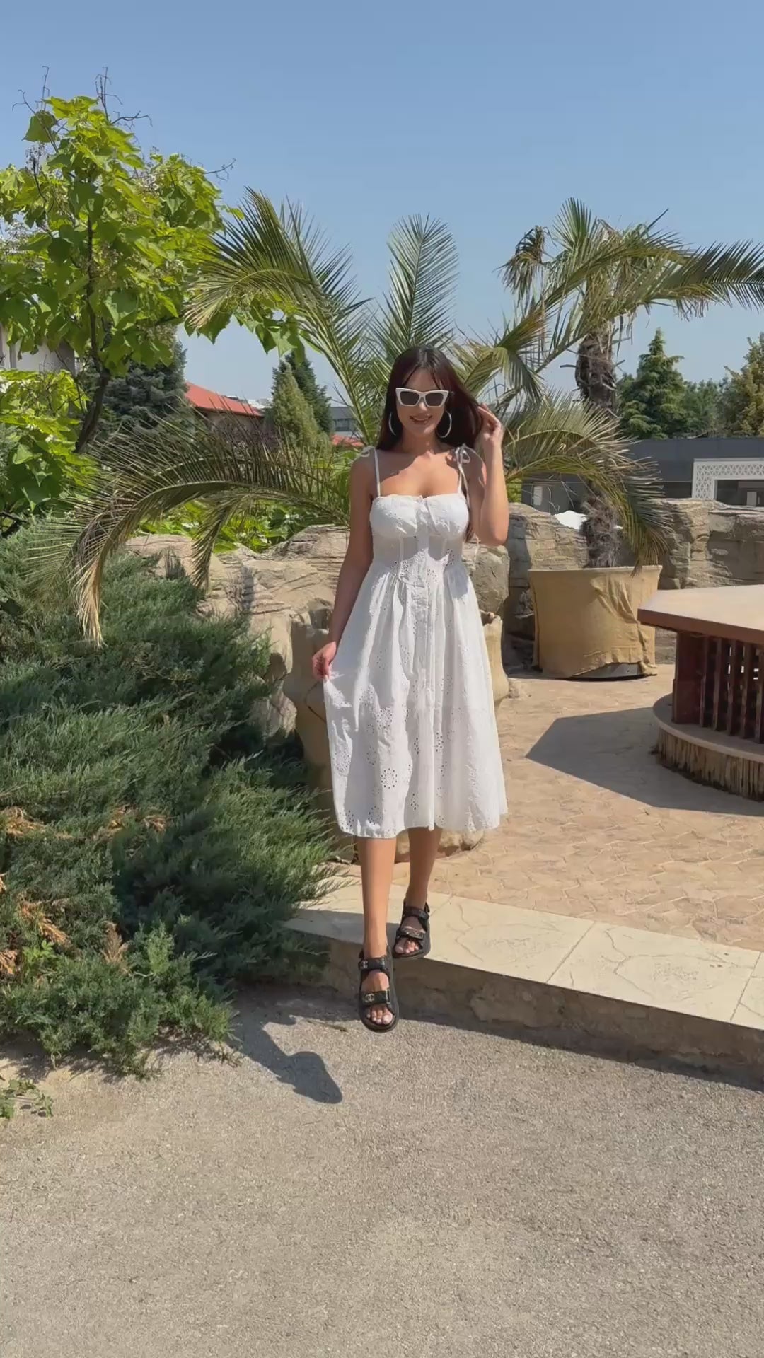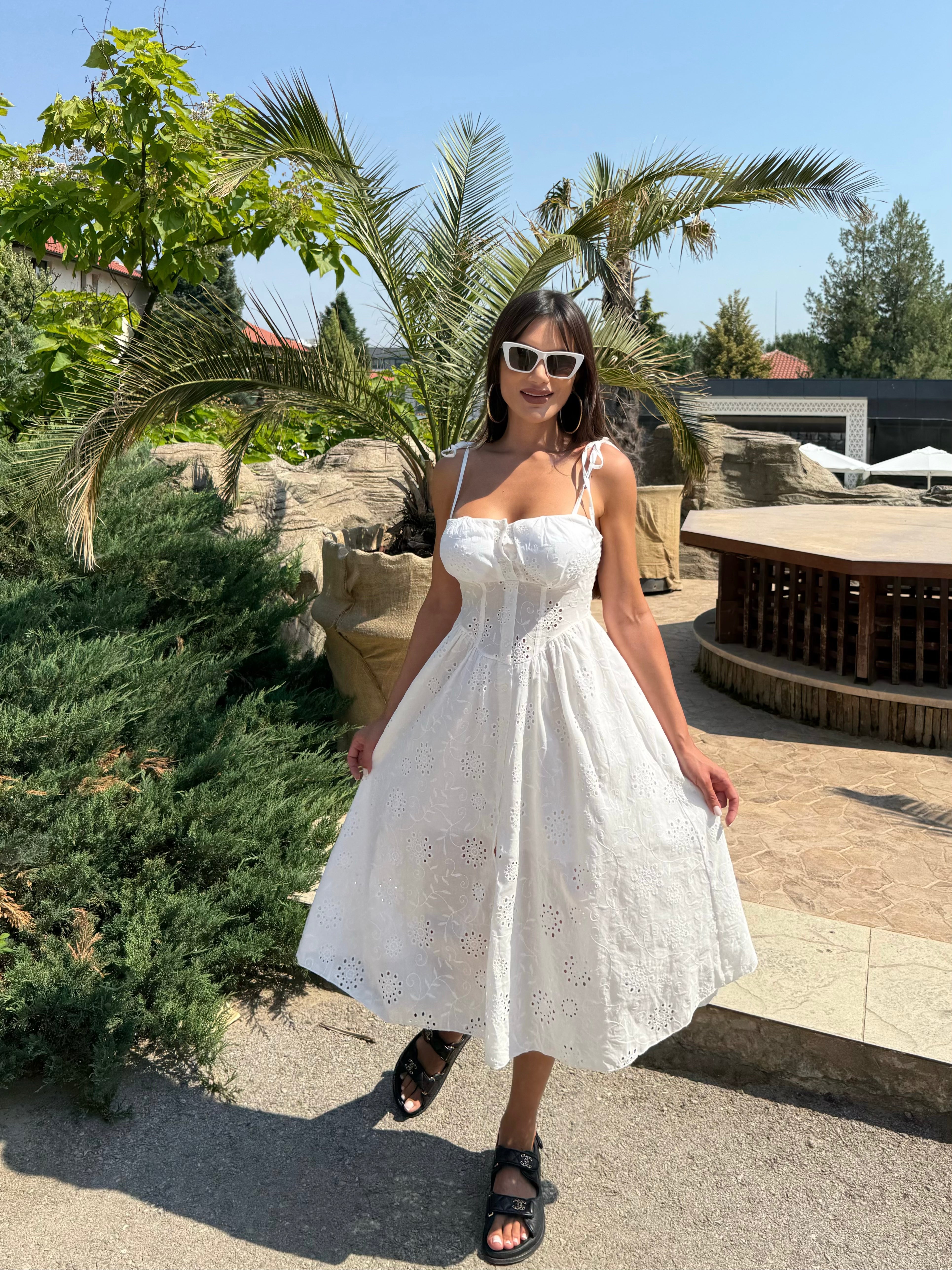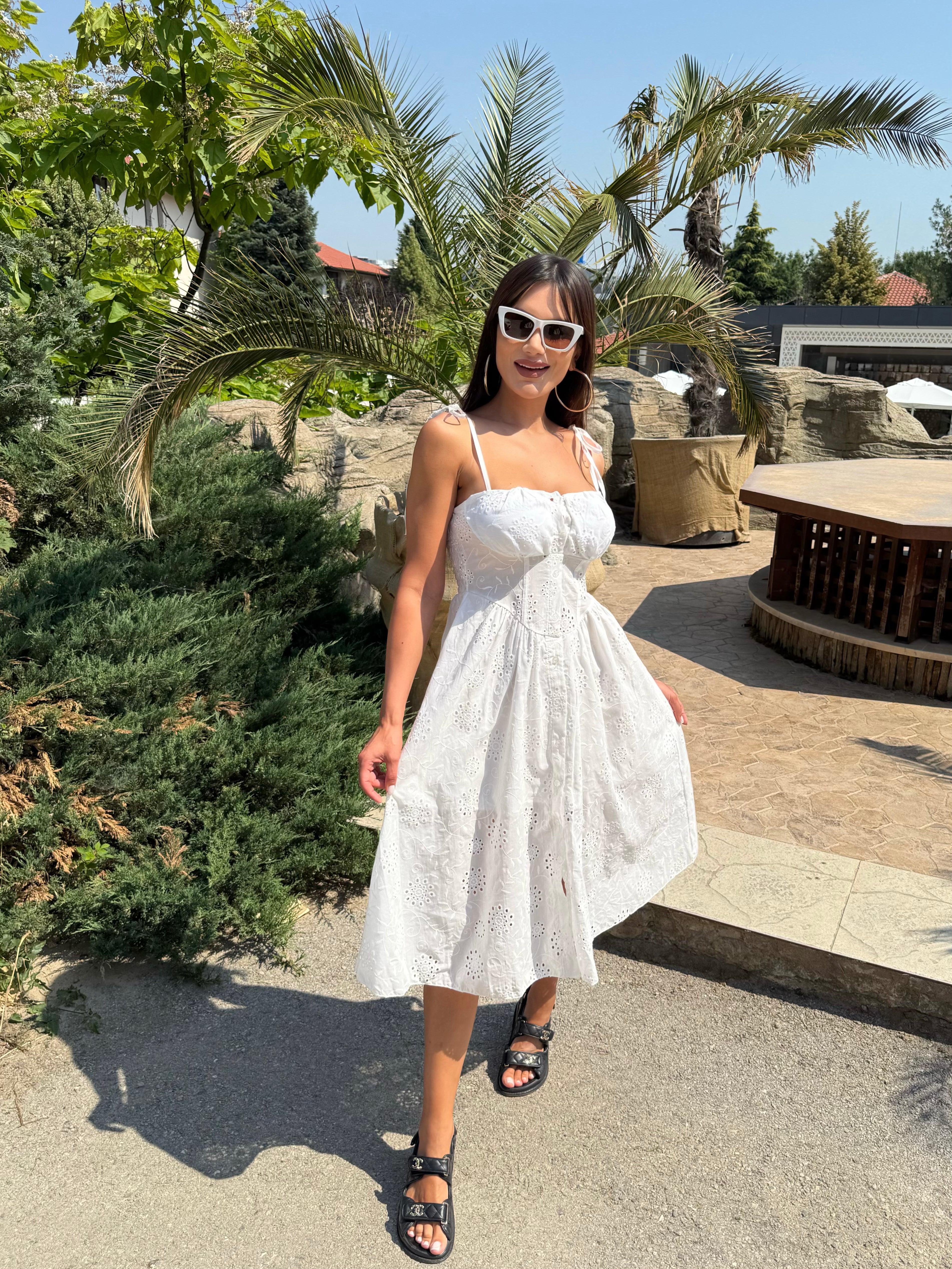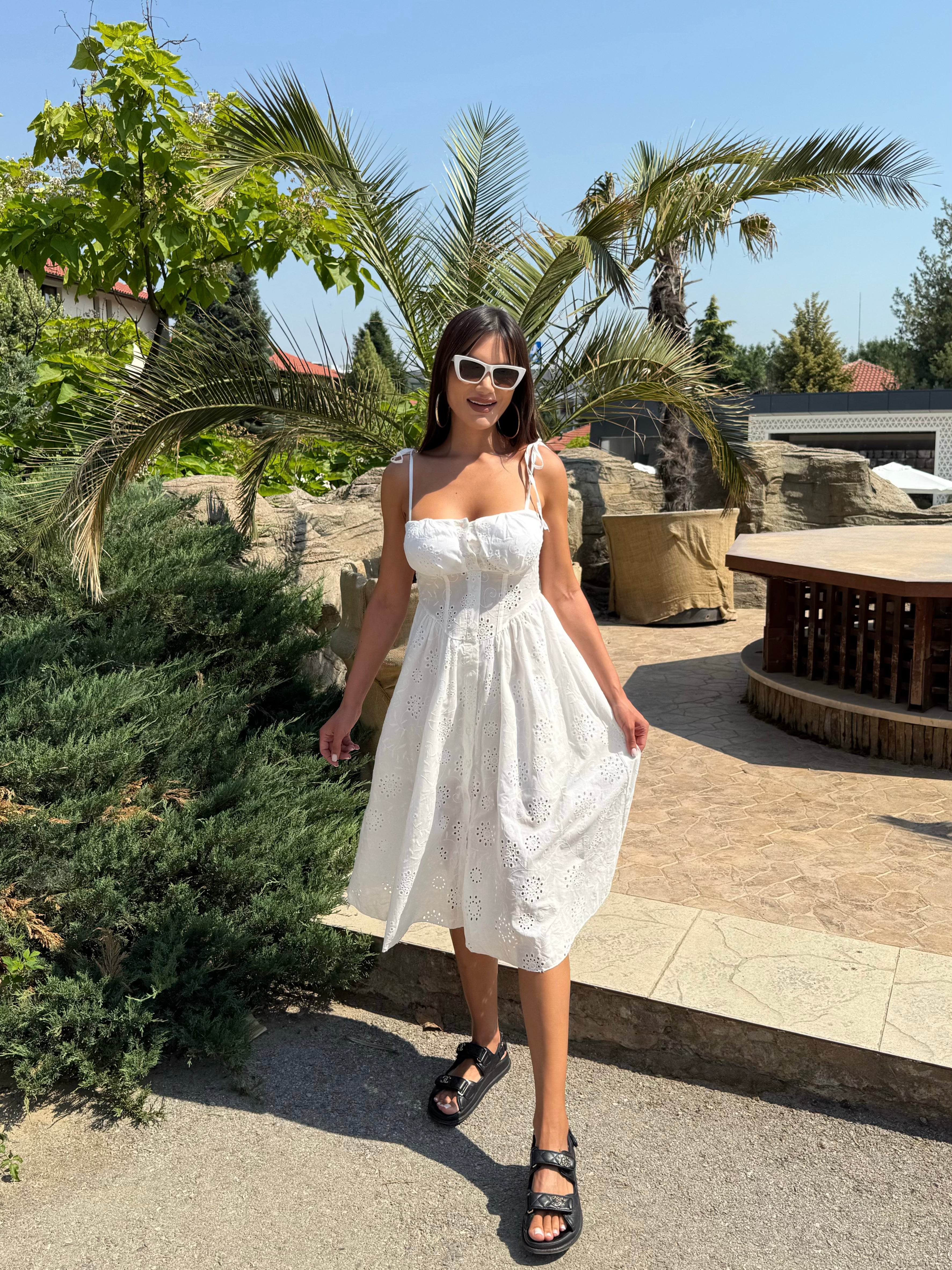 Изработена от висококачествен памук с елегантна broderie anglaise бродерия, тази рокля впечатлява със своята нежност и женствена линия. Регулируемите връзки на раменете позволяват перфектно прилягане, а вталеният силует с разкроена долна част подчертава талията и създава ефирно движение при всяка стъпка.