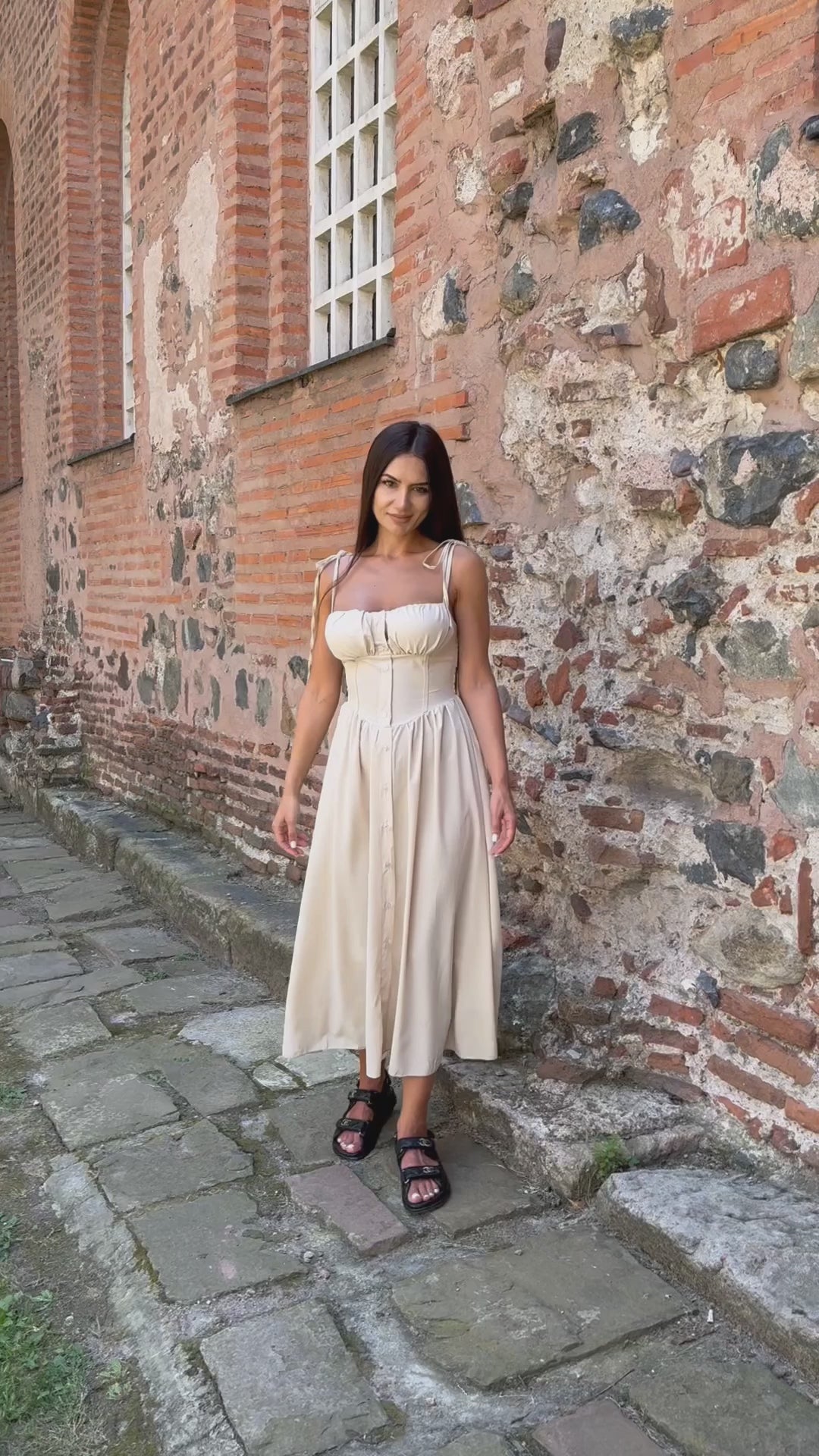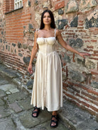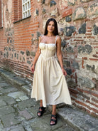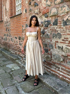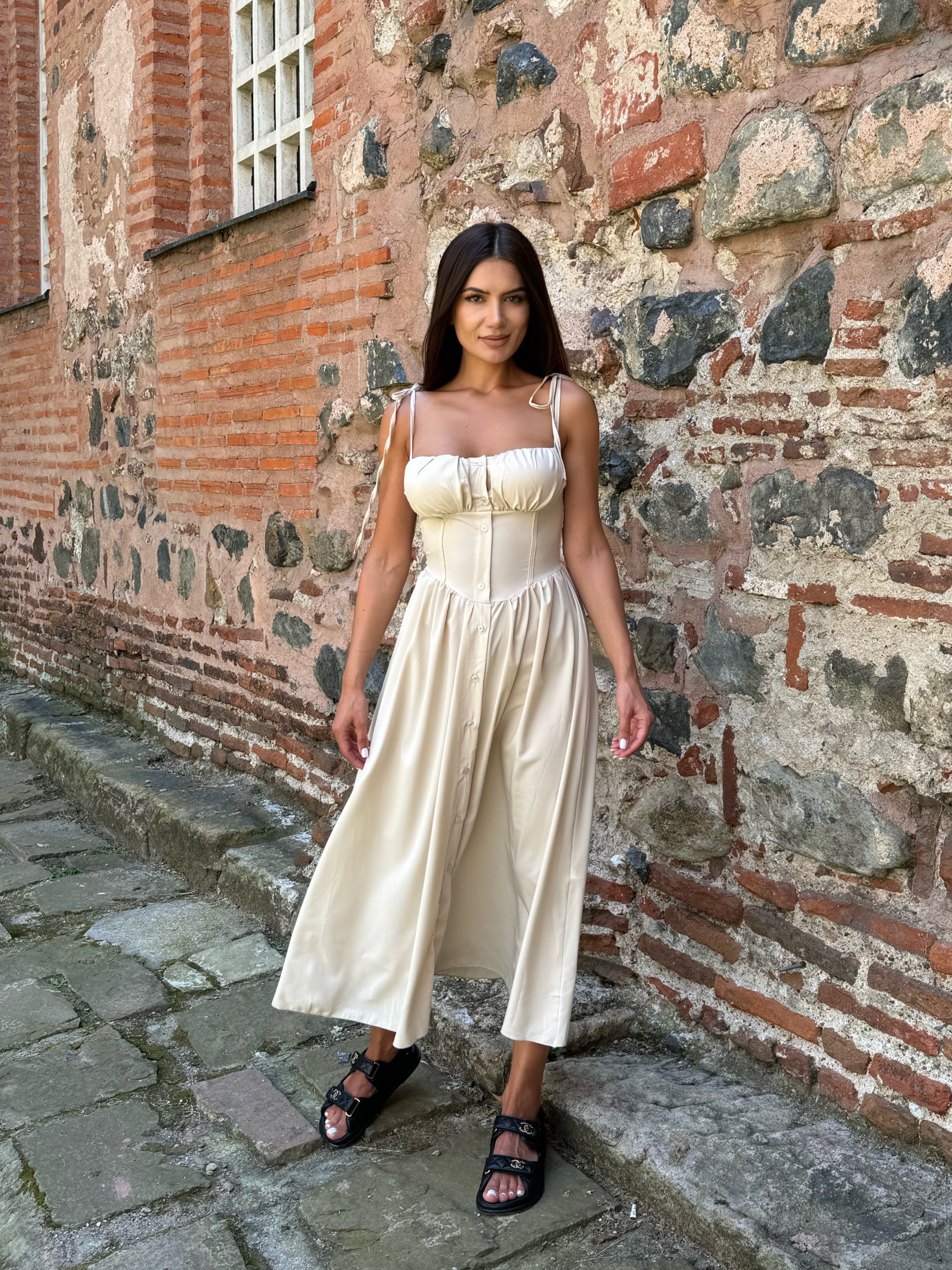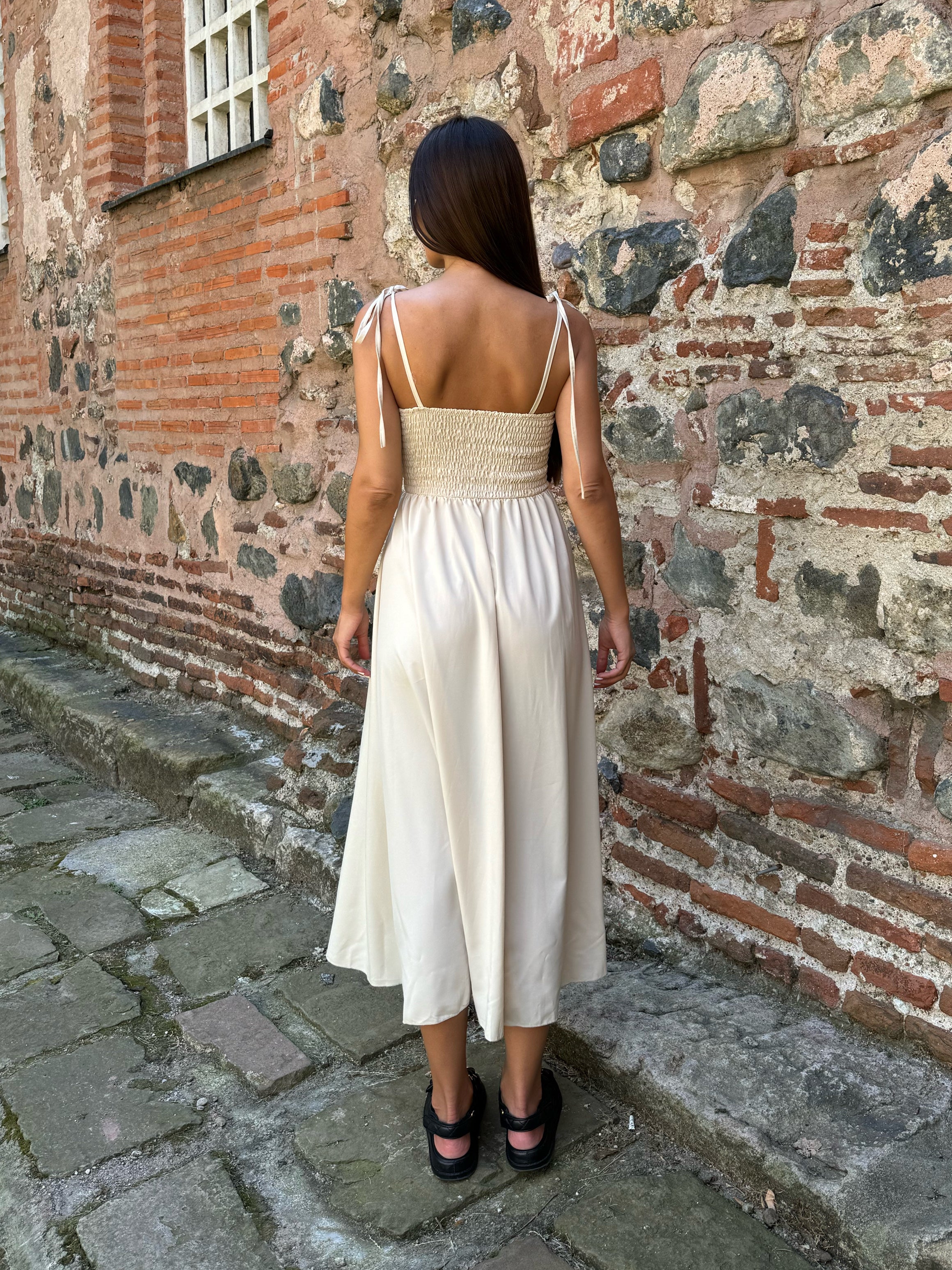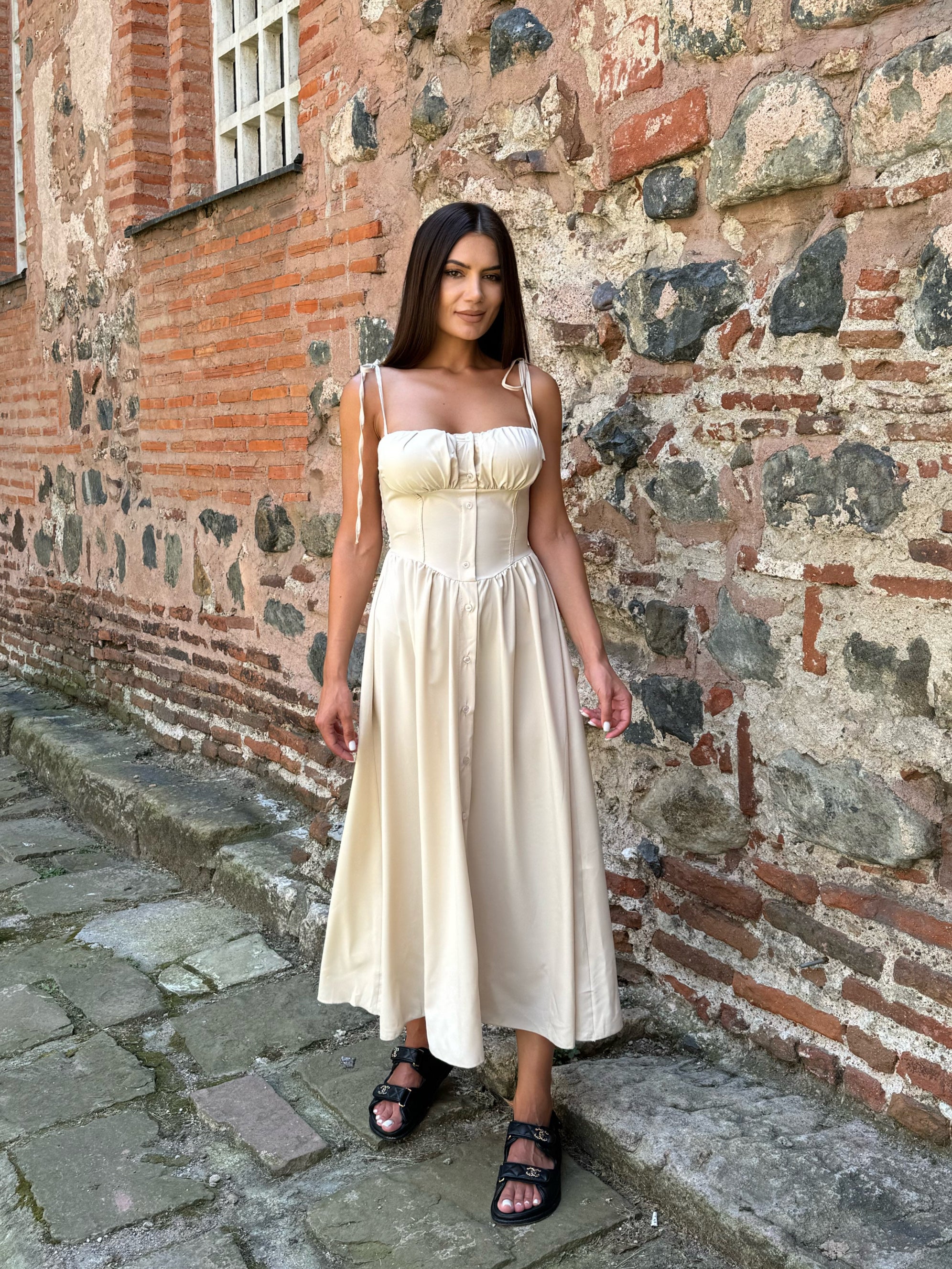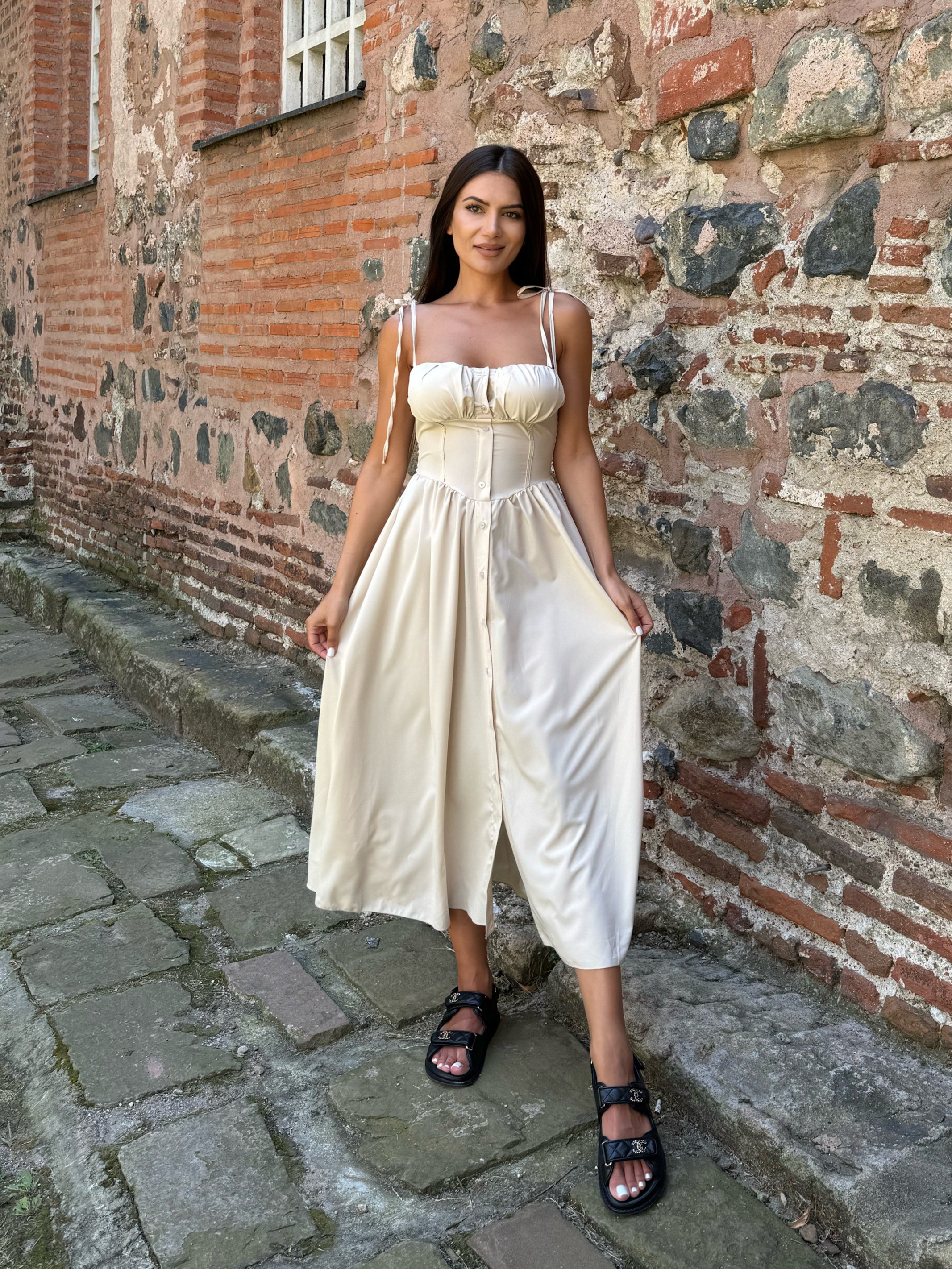 Ефирна вталена РОКЛЯ MARINA в бежов цвят, чашки с подплънка и презрамки-връзки.
