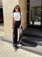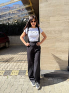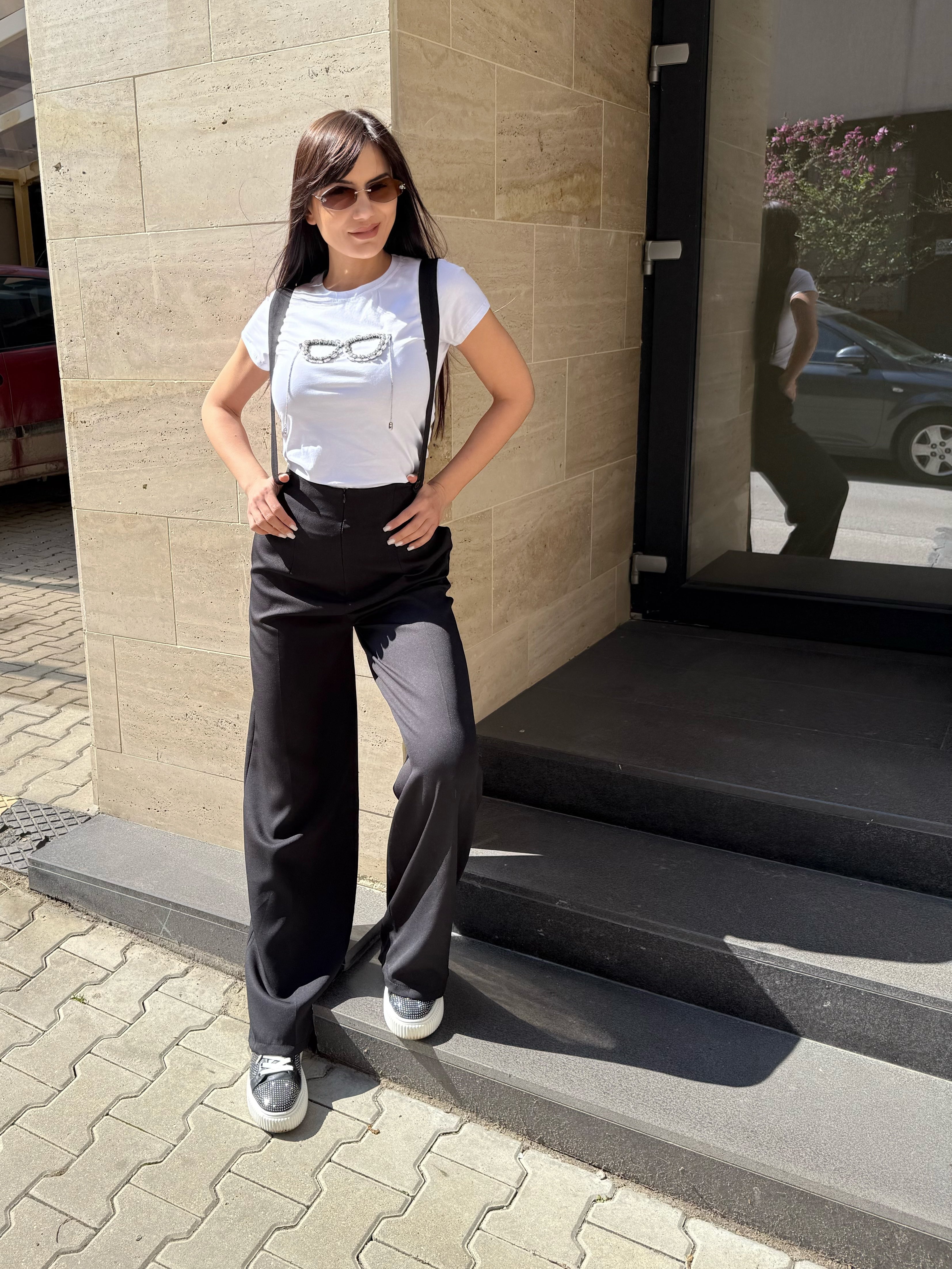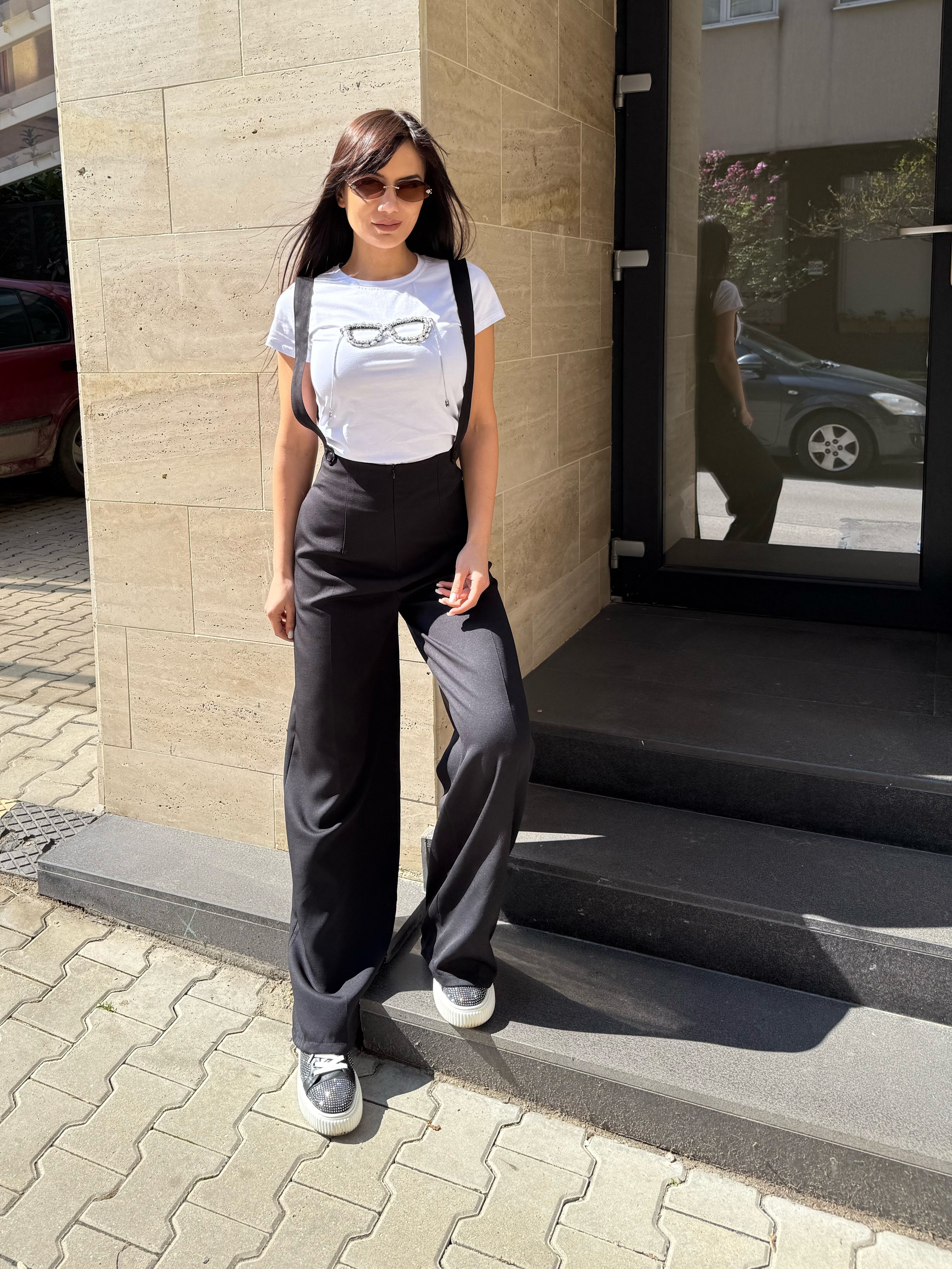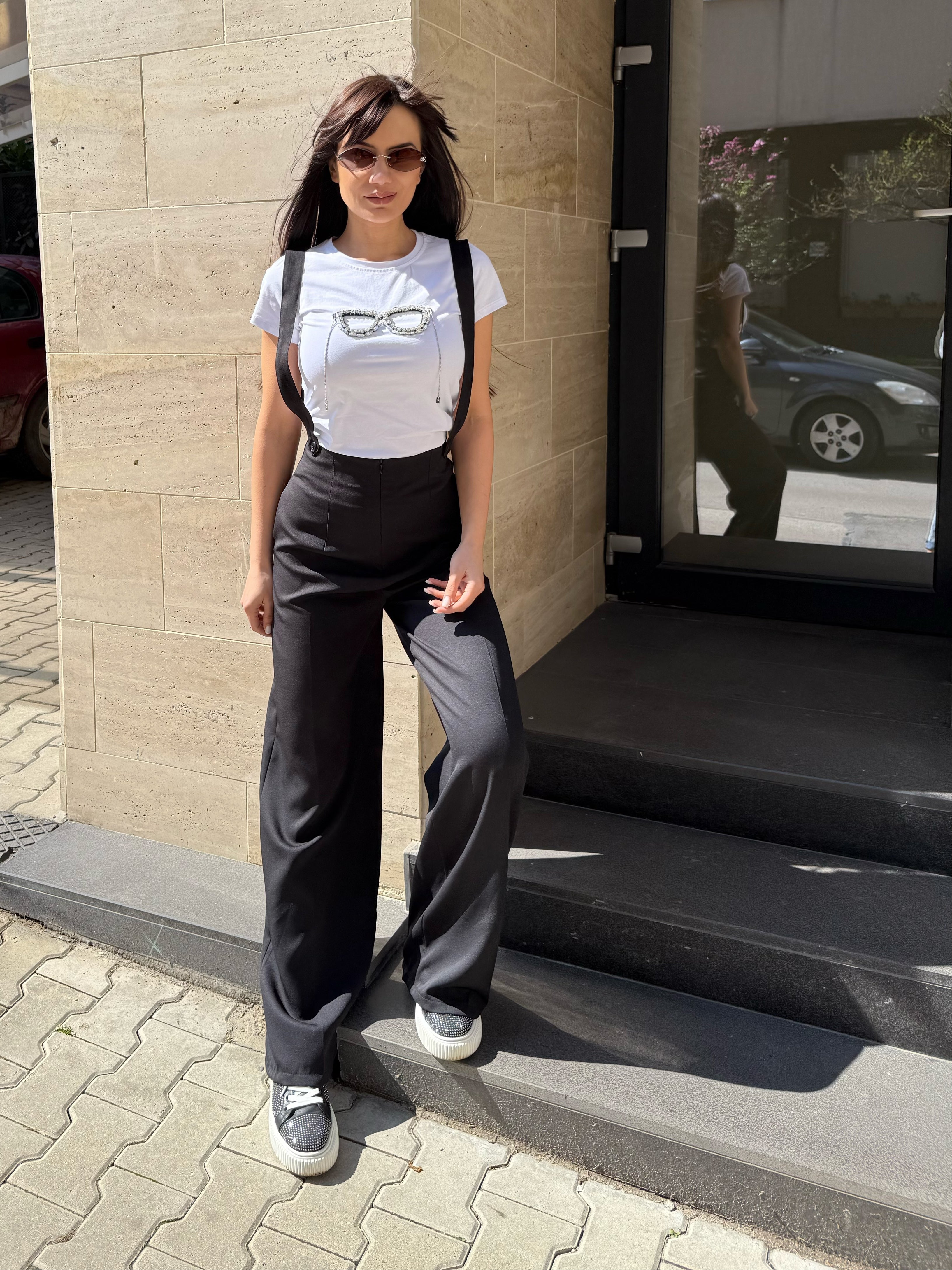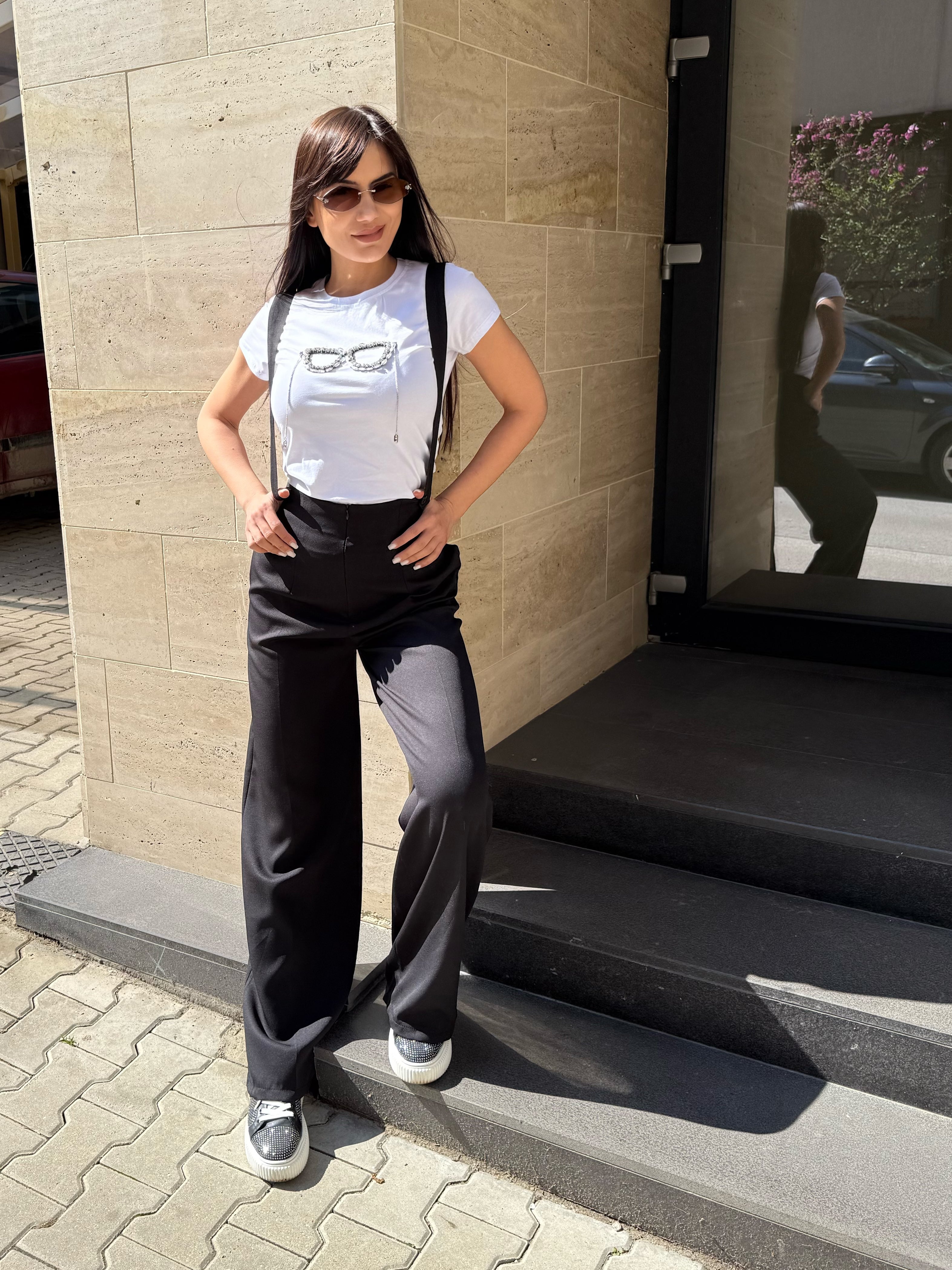 A clean , sporty-elegant high-waisted TROUSERS with suspenders. It fastens with a zipper in the front and has side pockets;