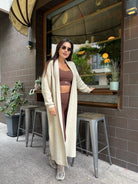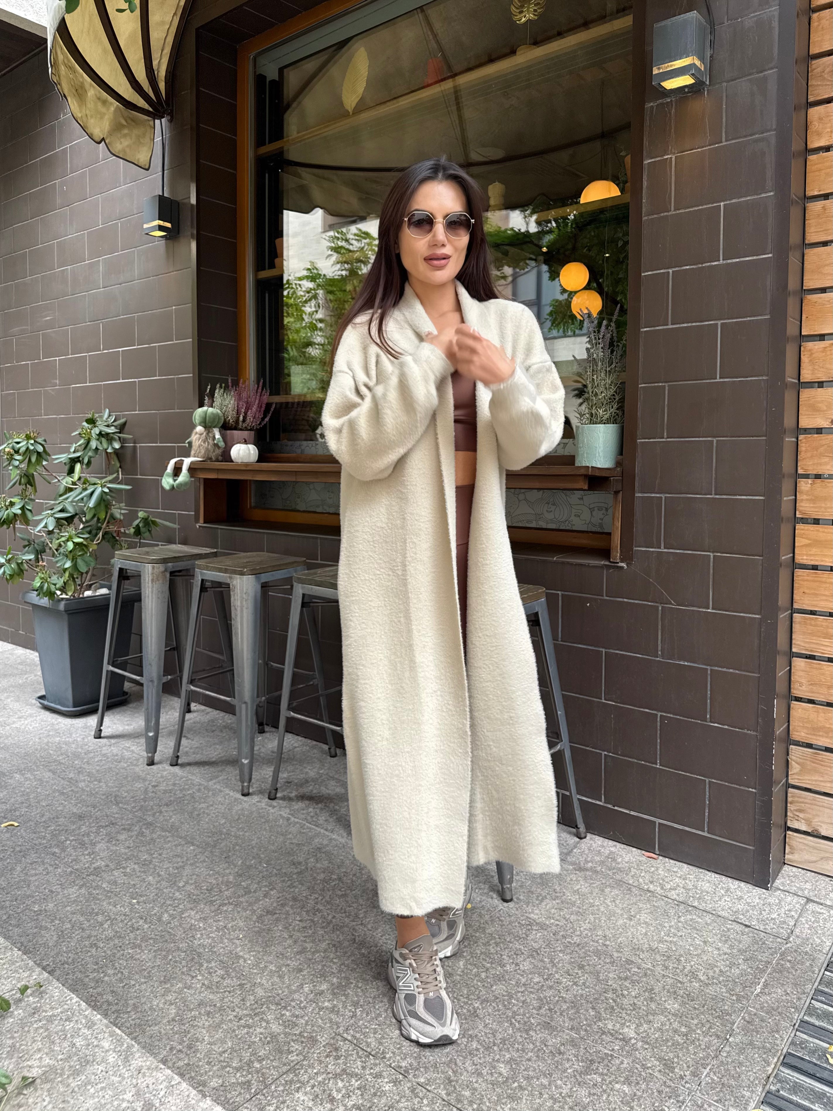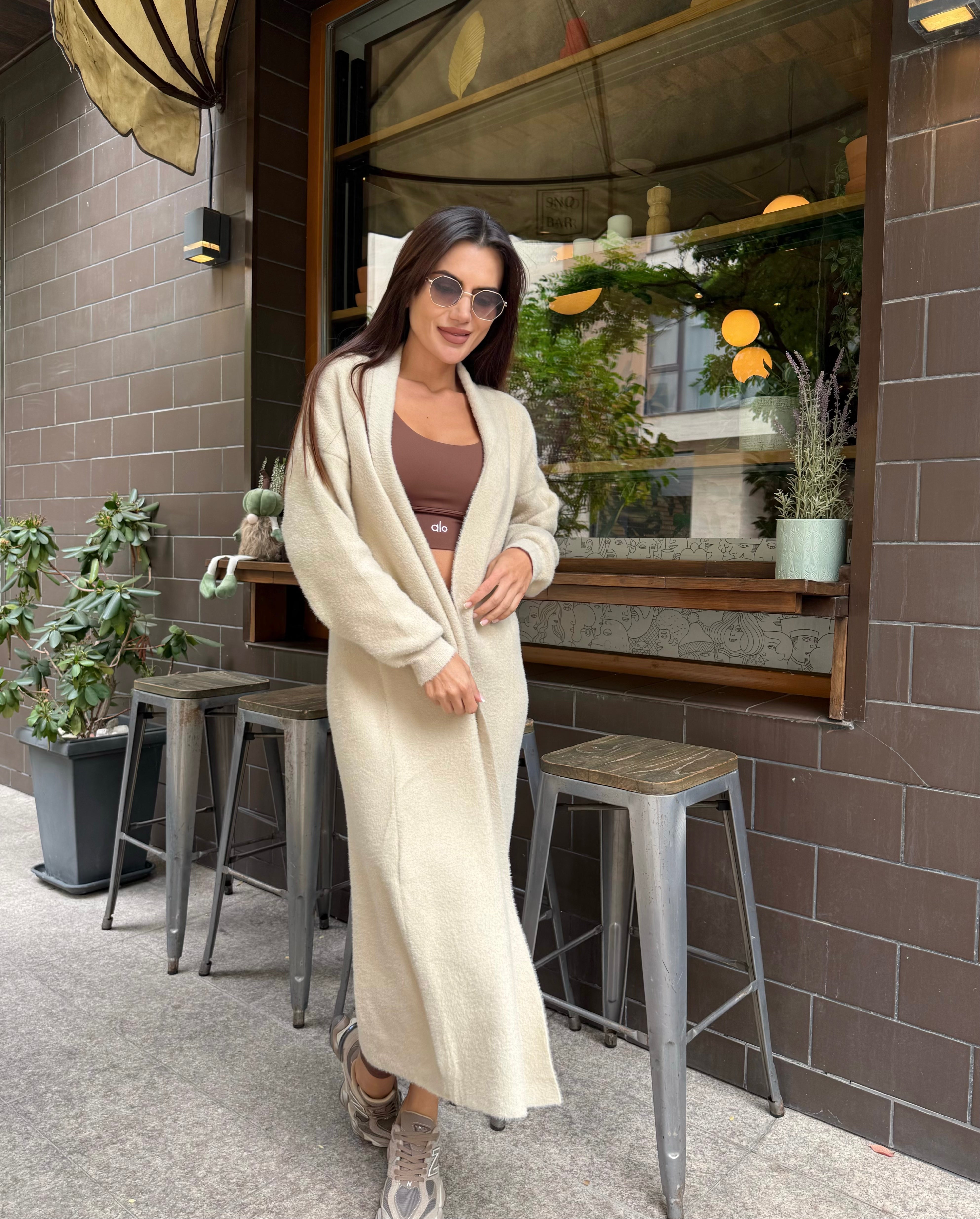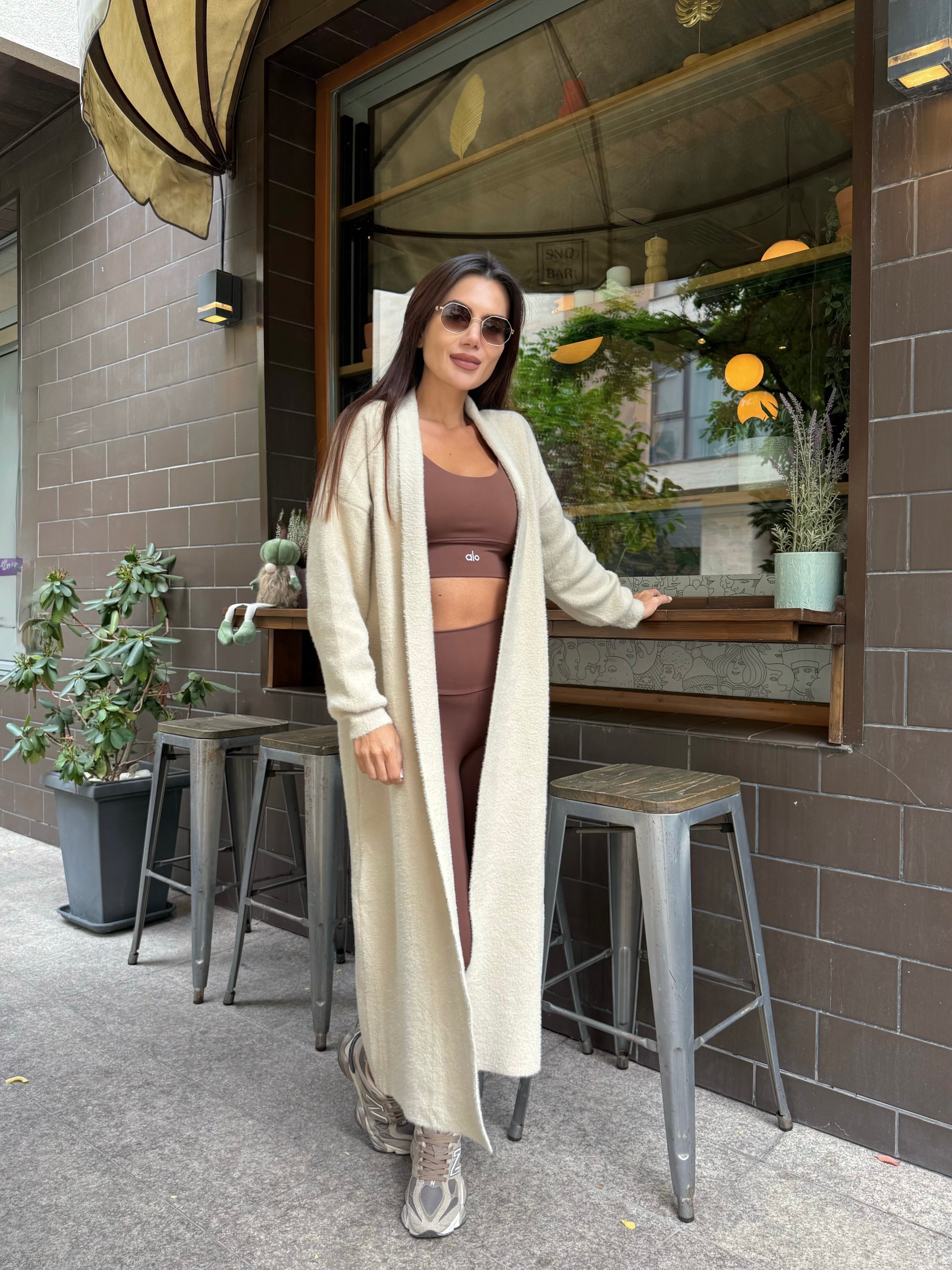 Елегантна дълга жилетка в мек бежов нюанс – символ на изчистен стил и комфорт. Перфектна за всеки ден и лесна за комбиниране с всякакви цветове.