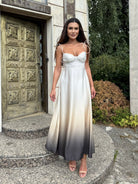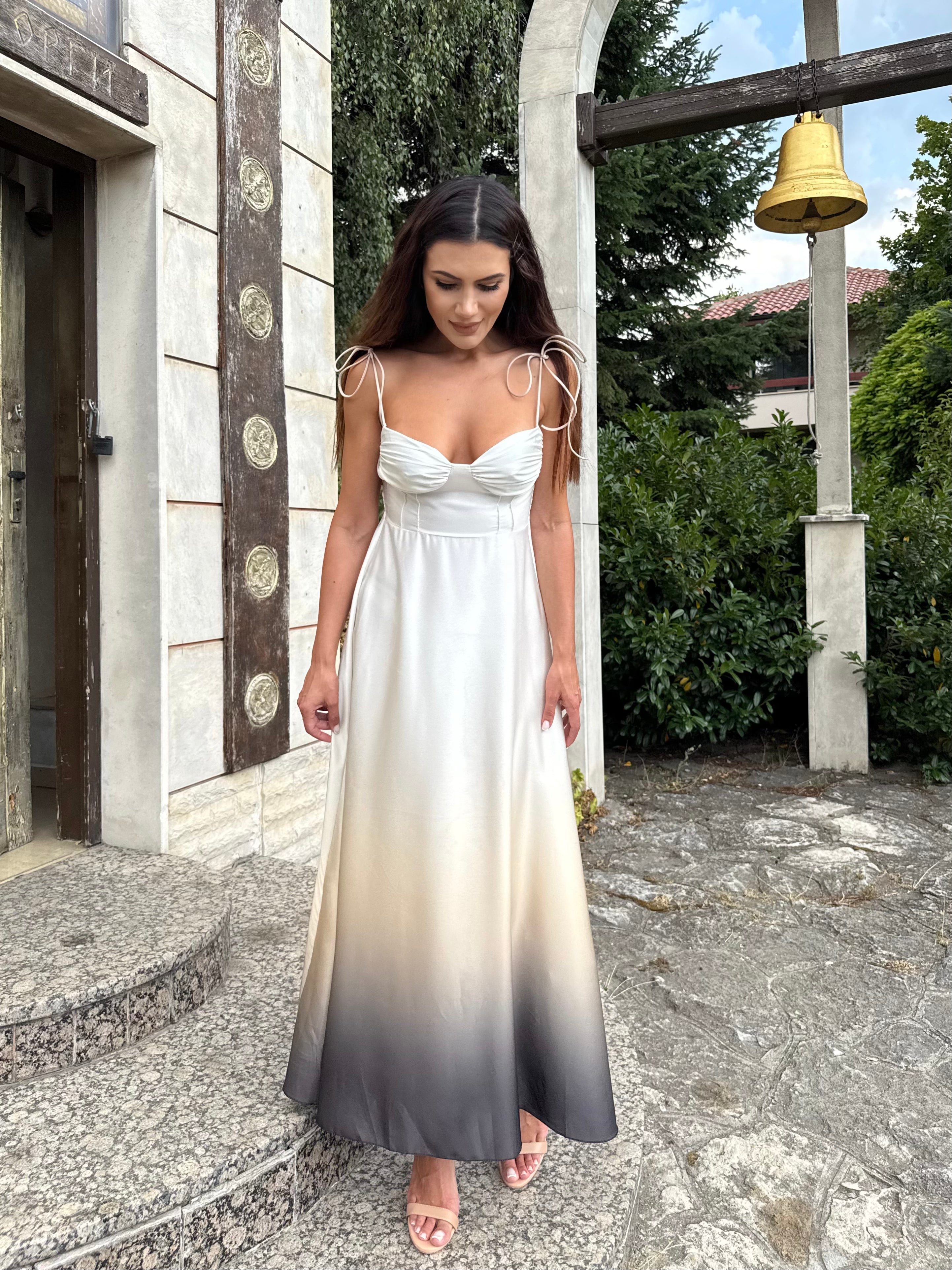 Потопи се в магията на вечерната елегантност с роклята “Moonlight Ombre”. Изработена от сатен с деликатен блясък и плавен преход от слонова кост към графит, тази рокля е синоним на изтънчен стил. Регулируемите връзки на раменете осигуряват перфектно прилягане, а леката материя създава комфорт при всяко движение. Подходяща за специални поводи, романтични вечери или стилни събития.