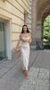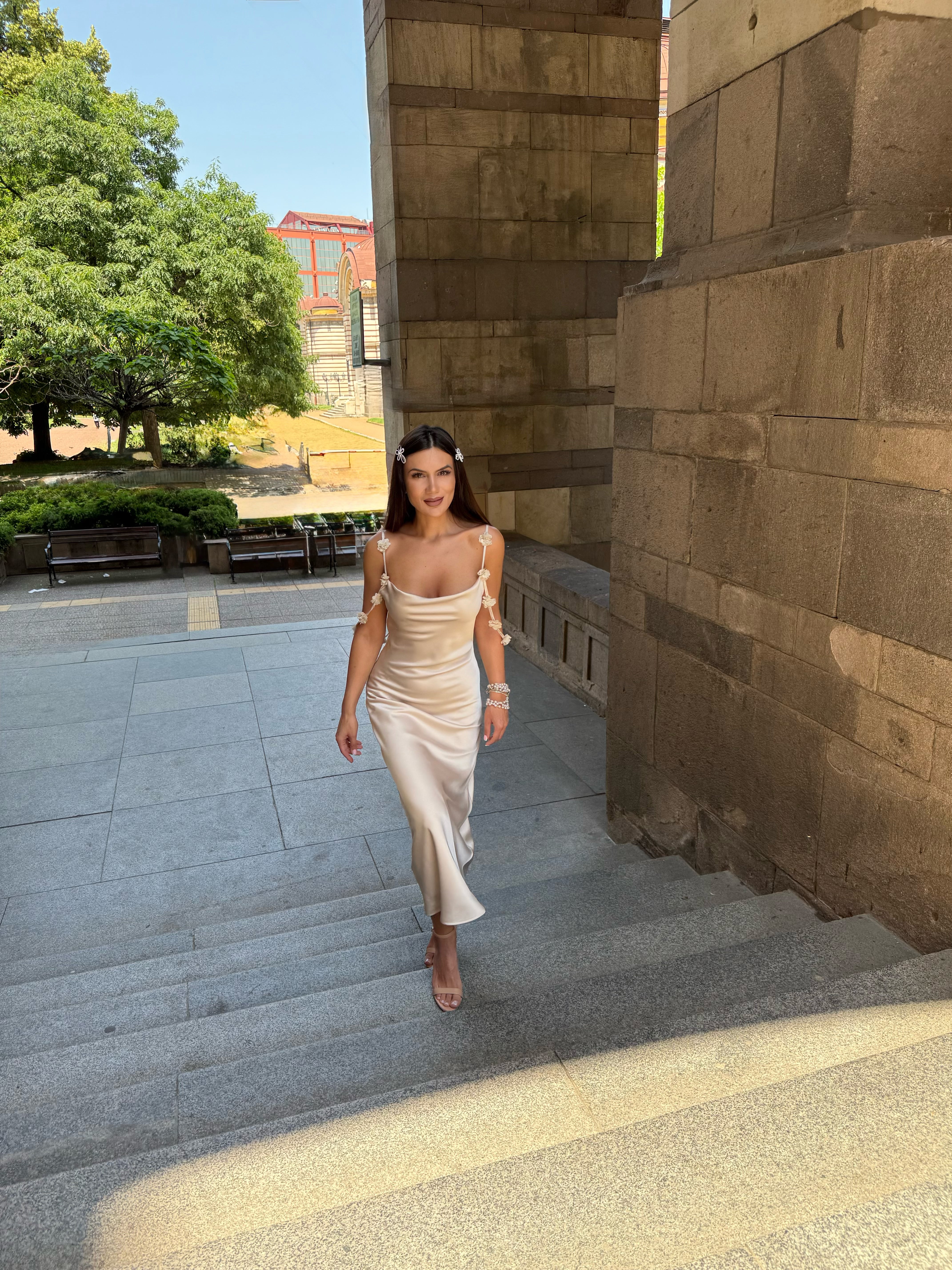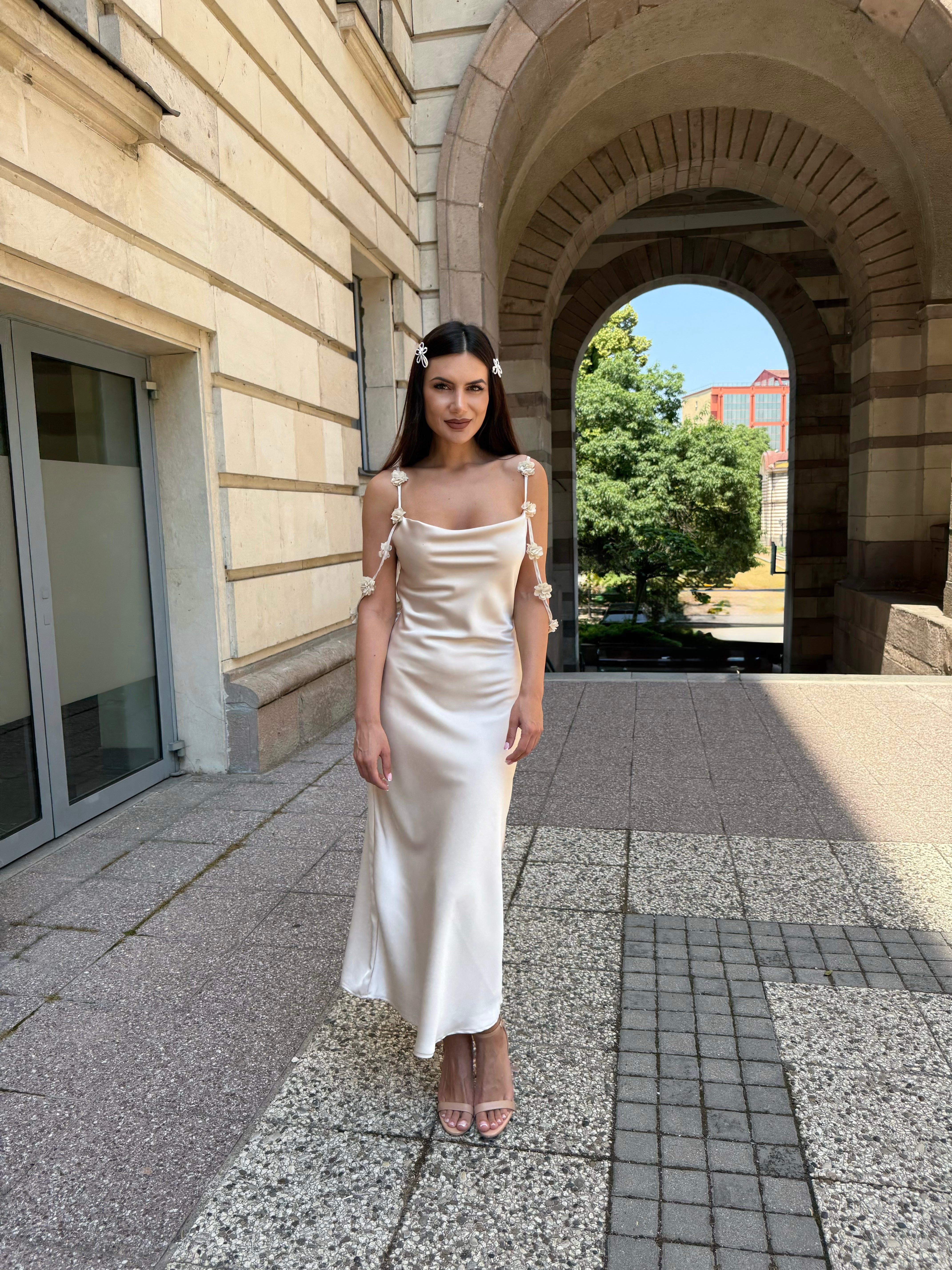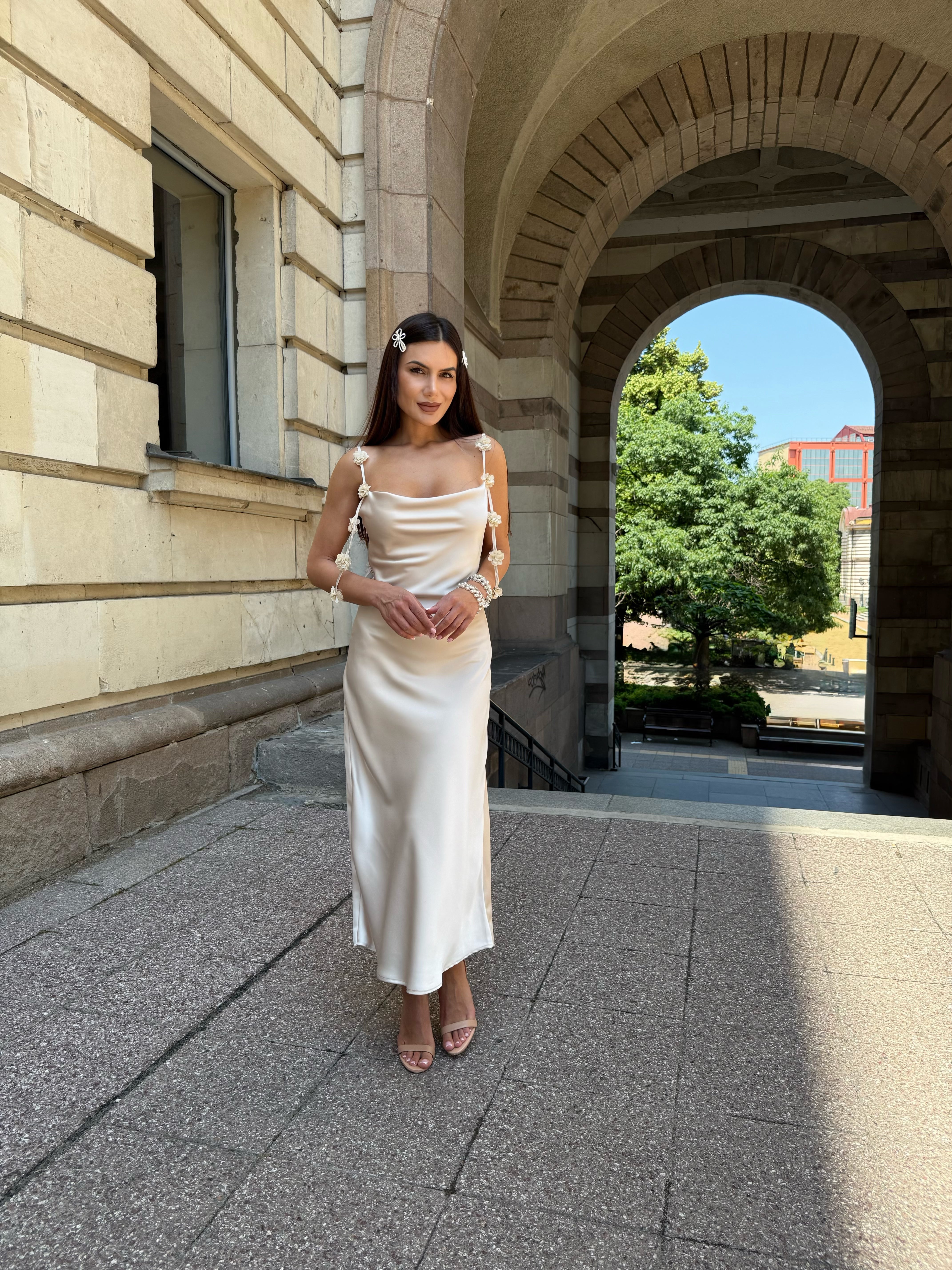 Изчистена визия с романтични детайли – Roché Beige е рокля, която съчетава минимализъм и женственост по изискан начин. Изработена от мека, фино падаща сатенена материя, тя подчертава силуета без усилие. Тънките презрамки с декоративни цветя придават нежен акцент и създават усещане за лекота и елегантност.