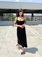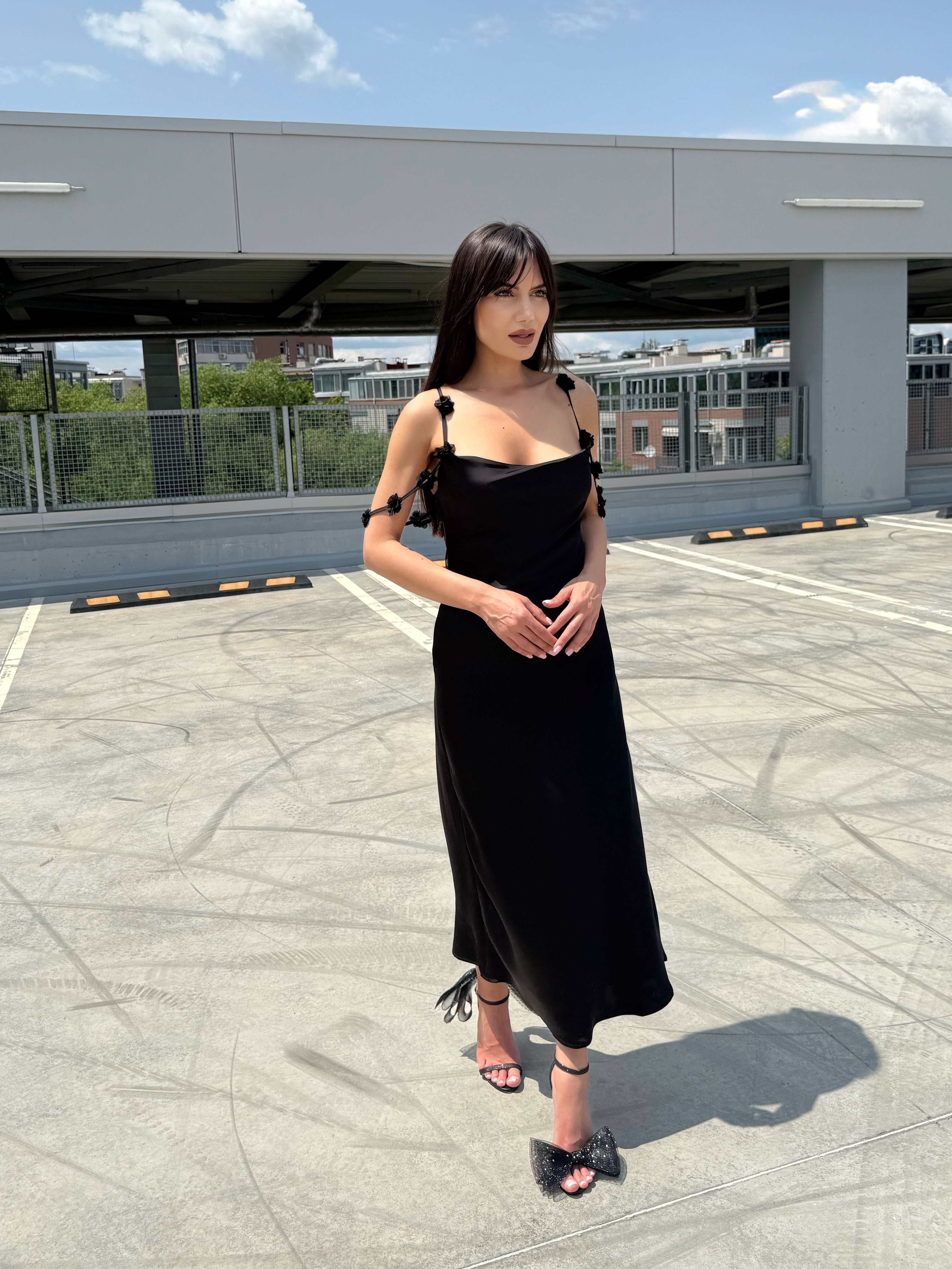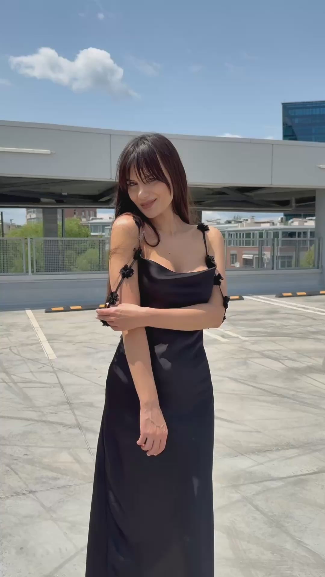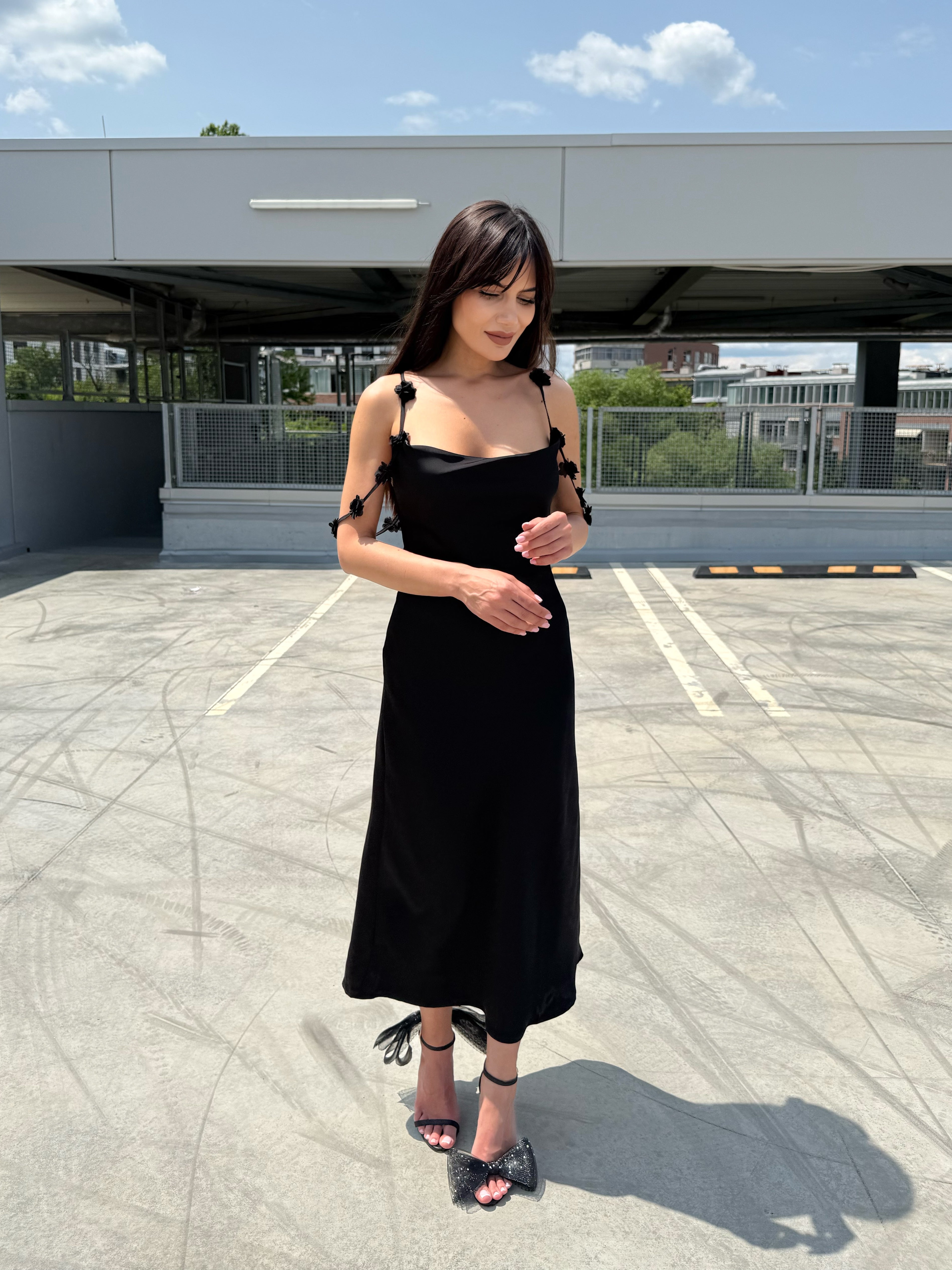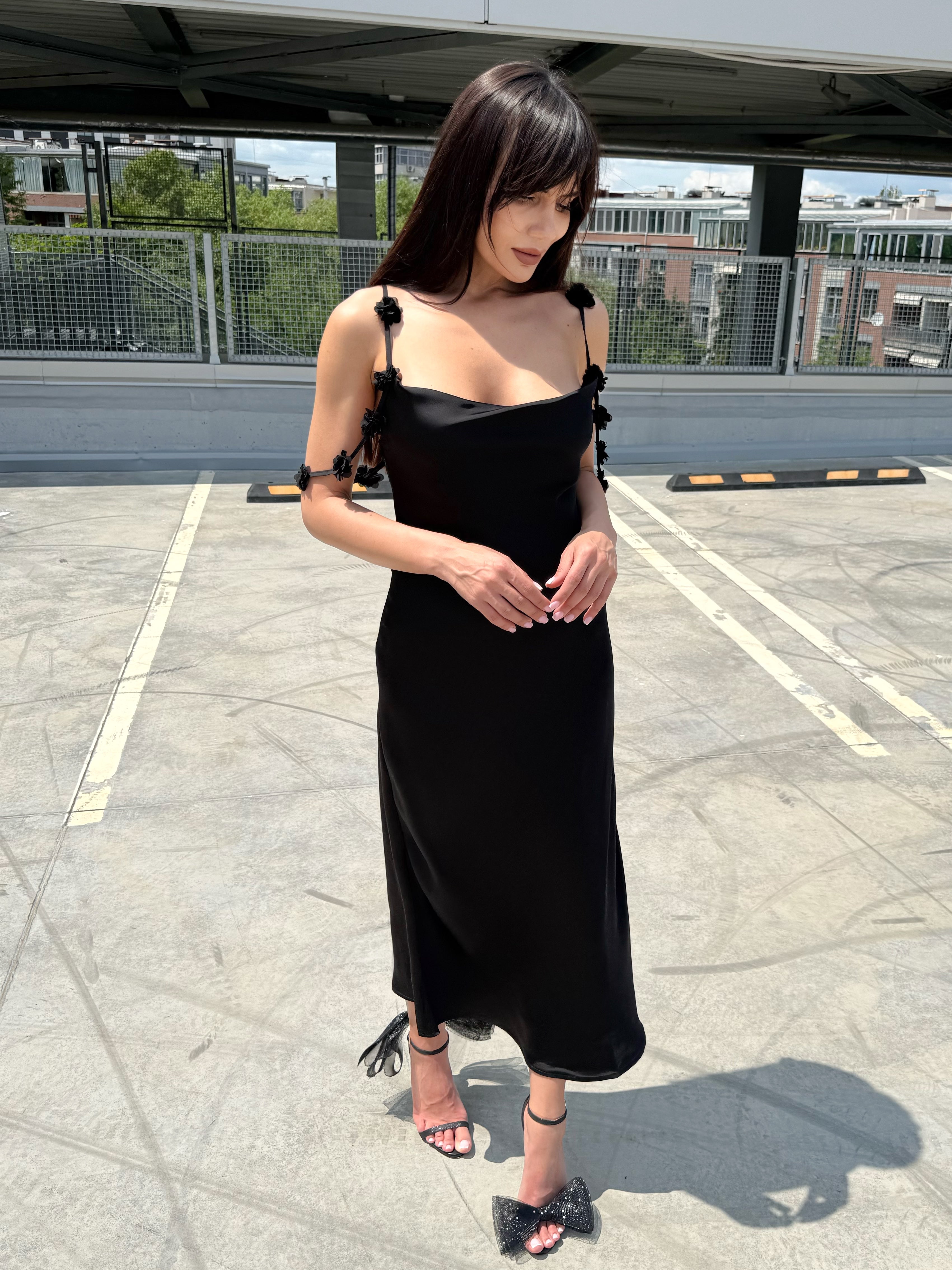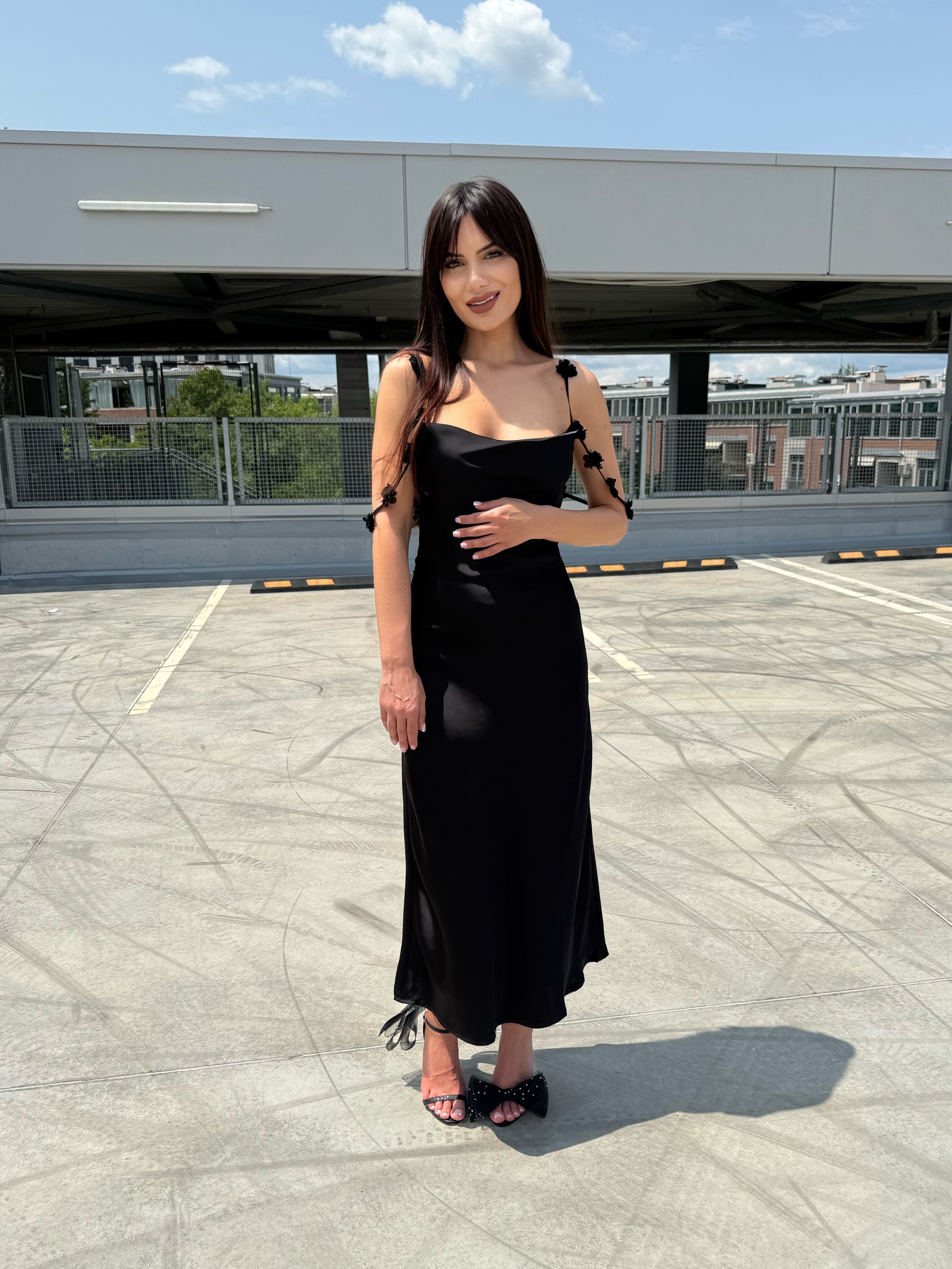 A clean look with romantic details – Roché Noir is a dress that combines minimalism and femininity in a refined way. Made of soft, finely flowing satin fabric, it emphasizes the silhouette effortlessly. The thin straps with decorative flowers add a delicate accent and create a feeling of lightness and elegance.
