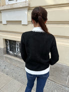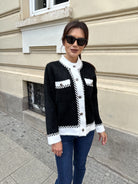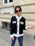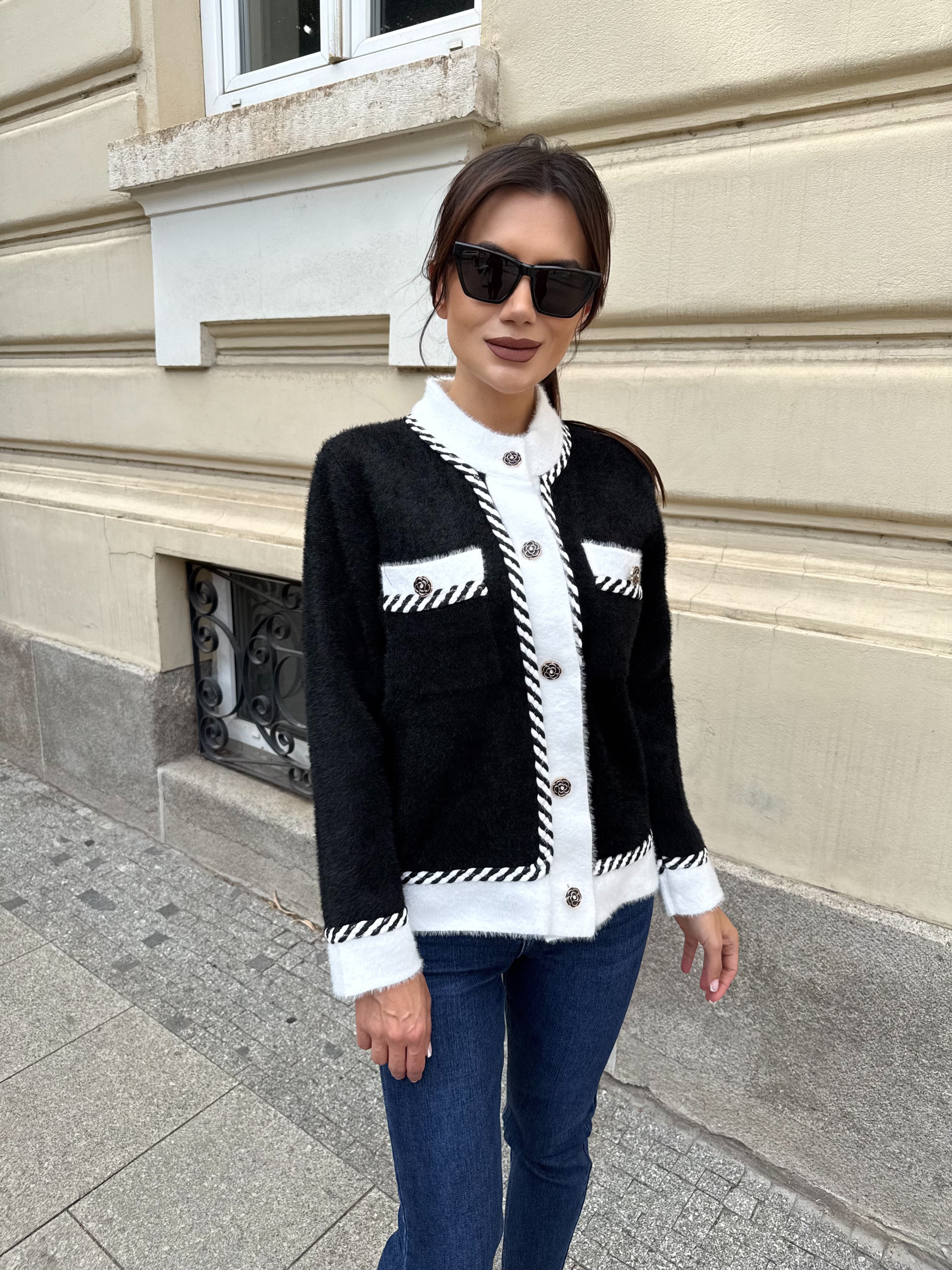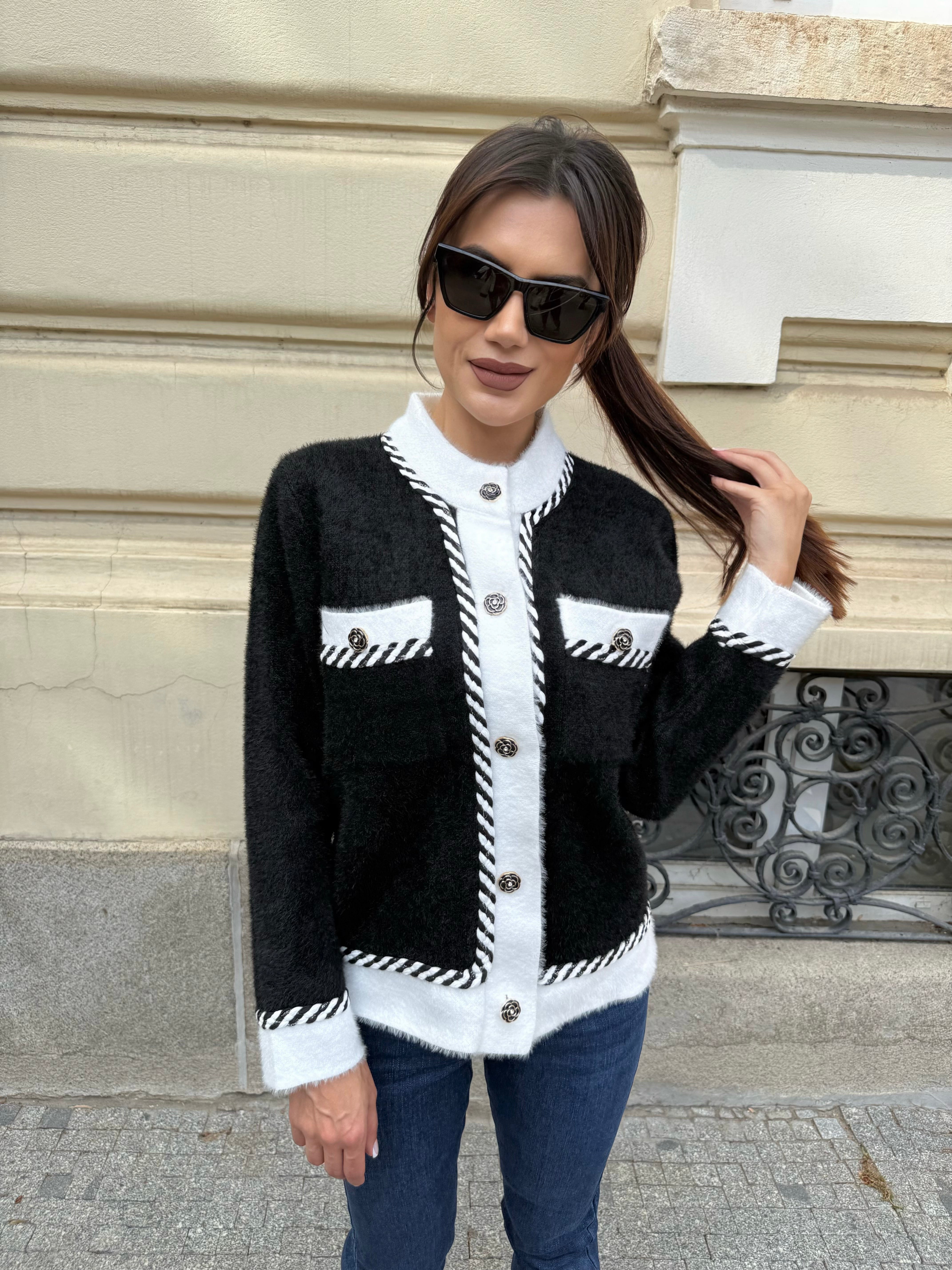 Women 's cardigan with a loose fit and external pockets on the front. The accent is the gold thread.