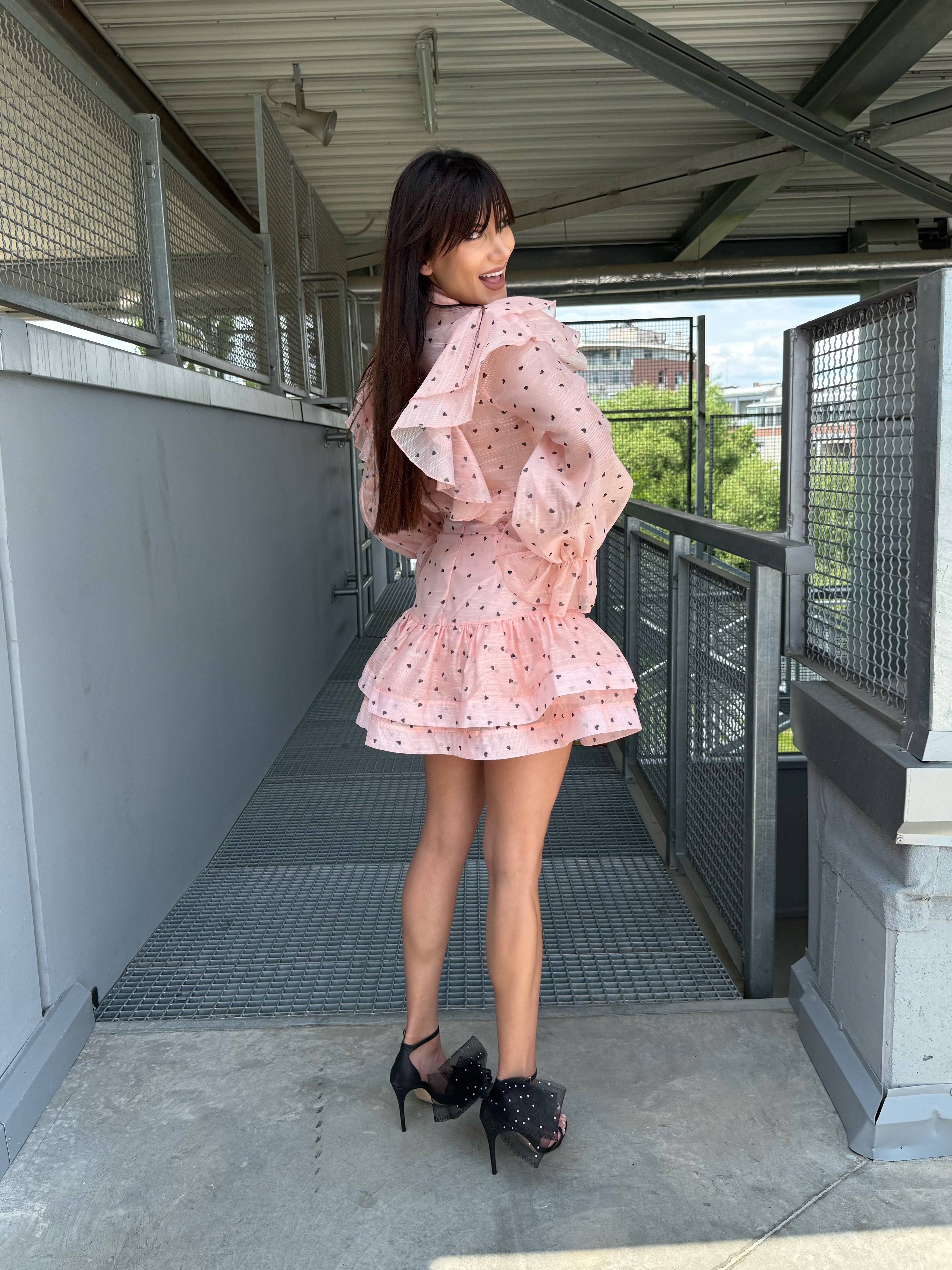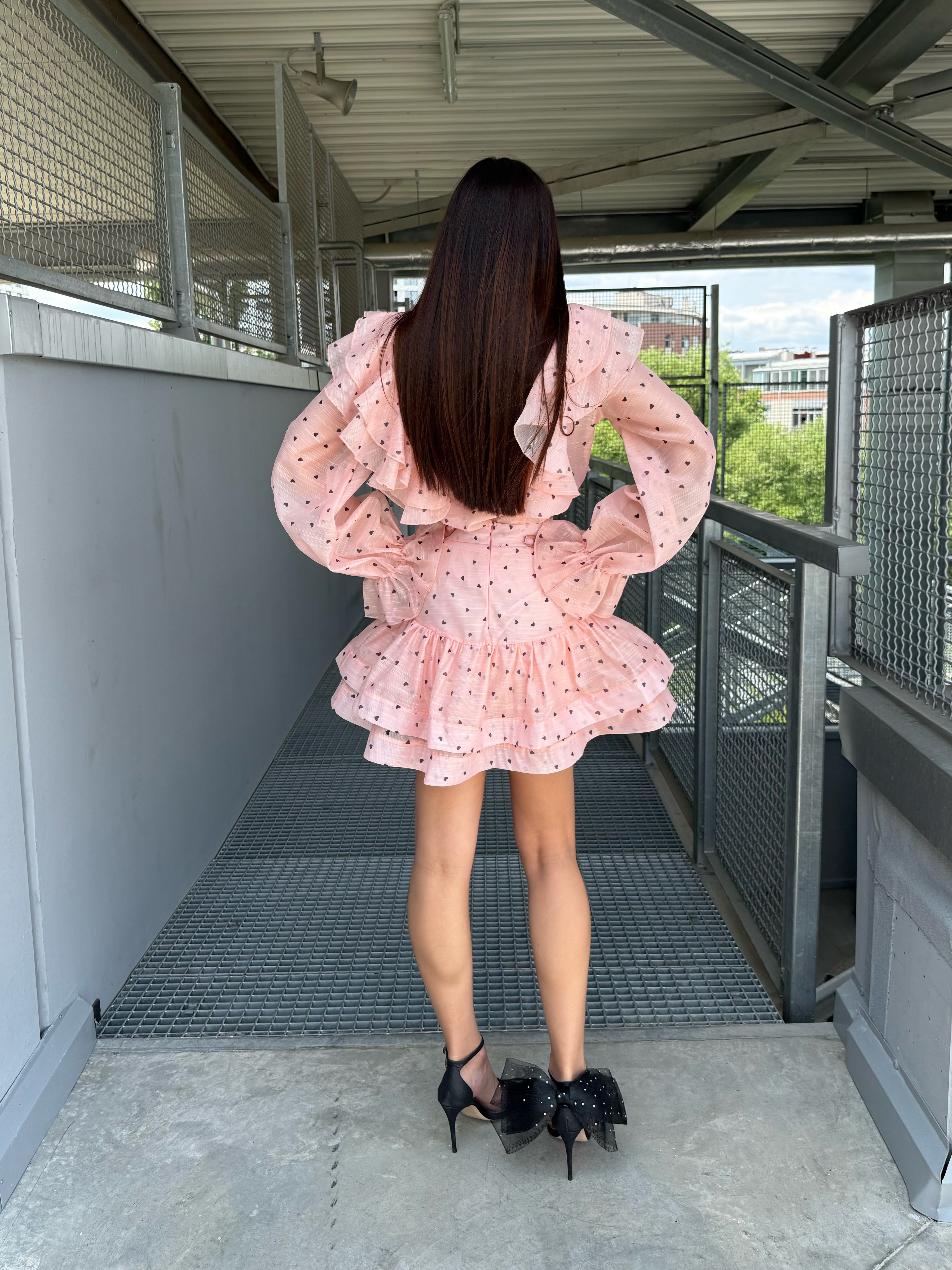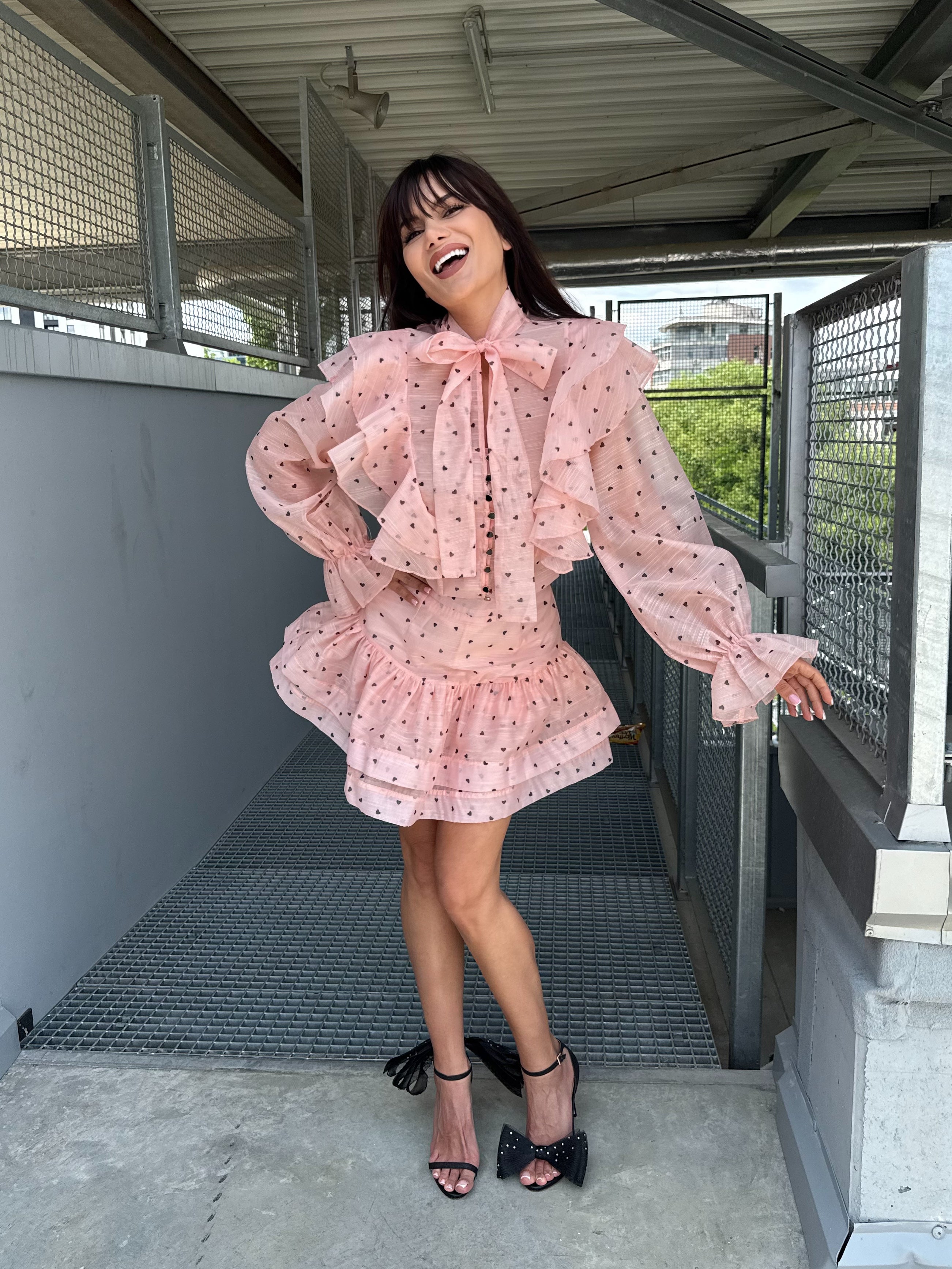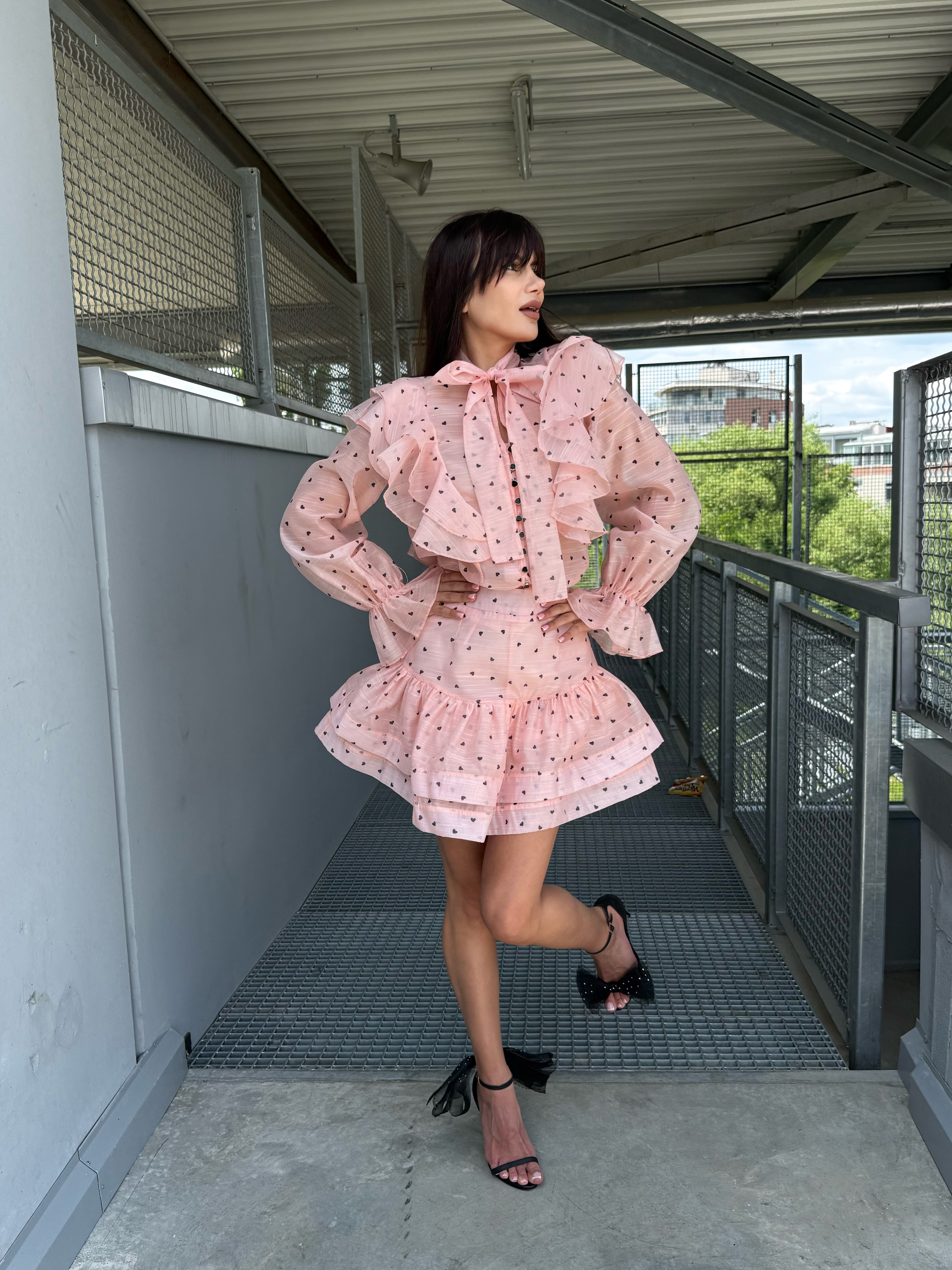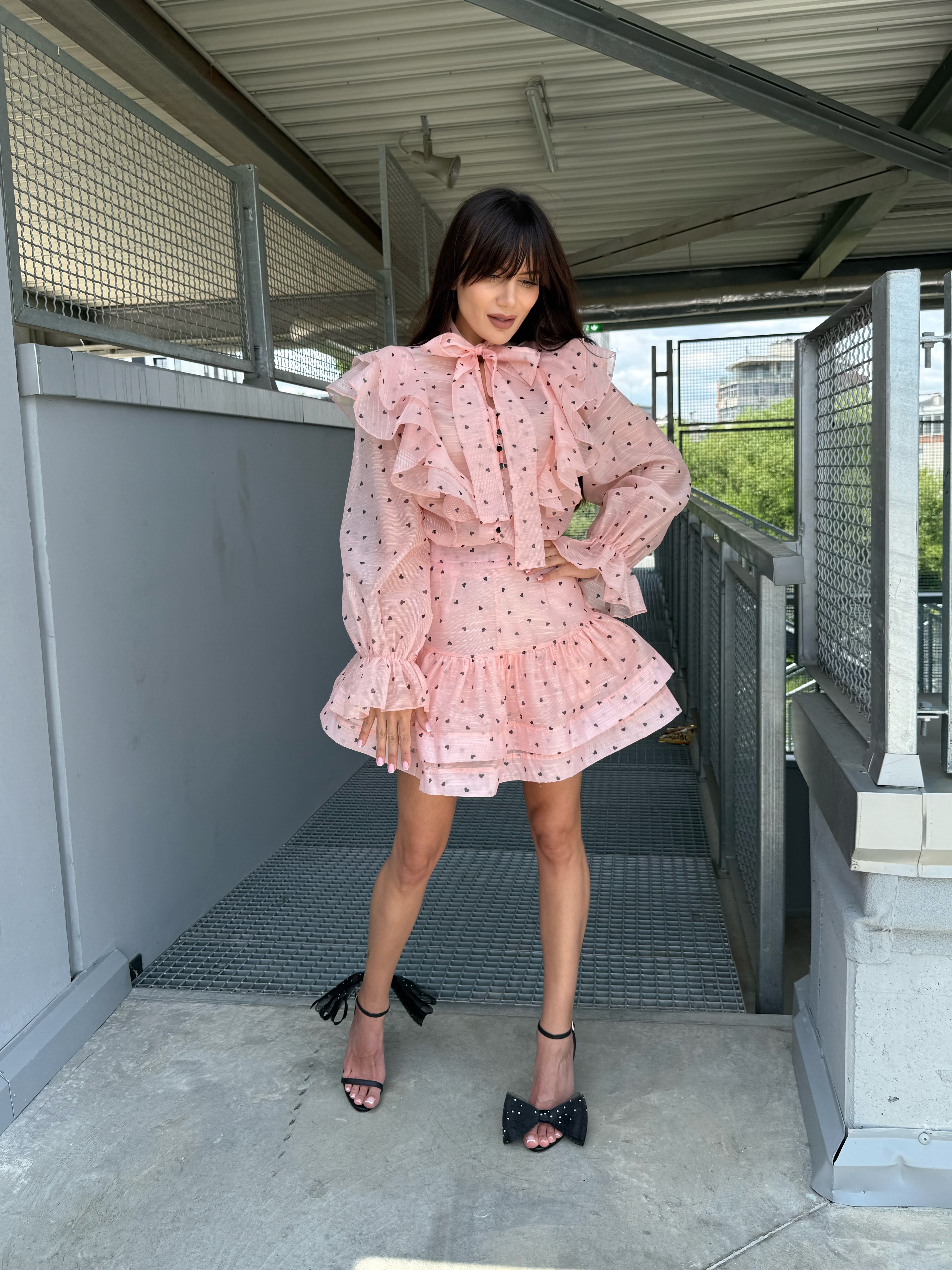 Loose -fitting SHIRT with a ribbon at the neckline and a SHORT SKIRT with shorts on the inside.