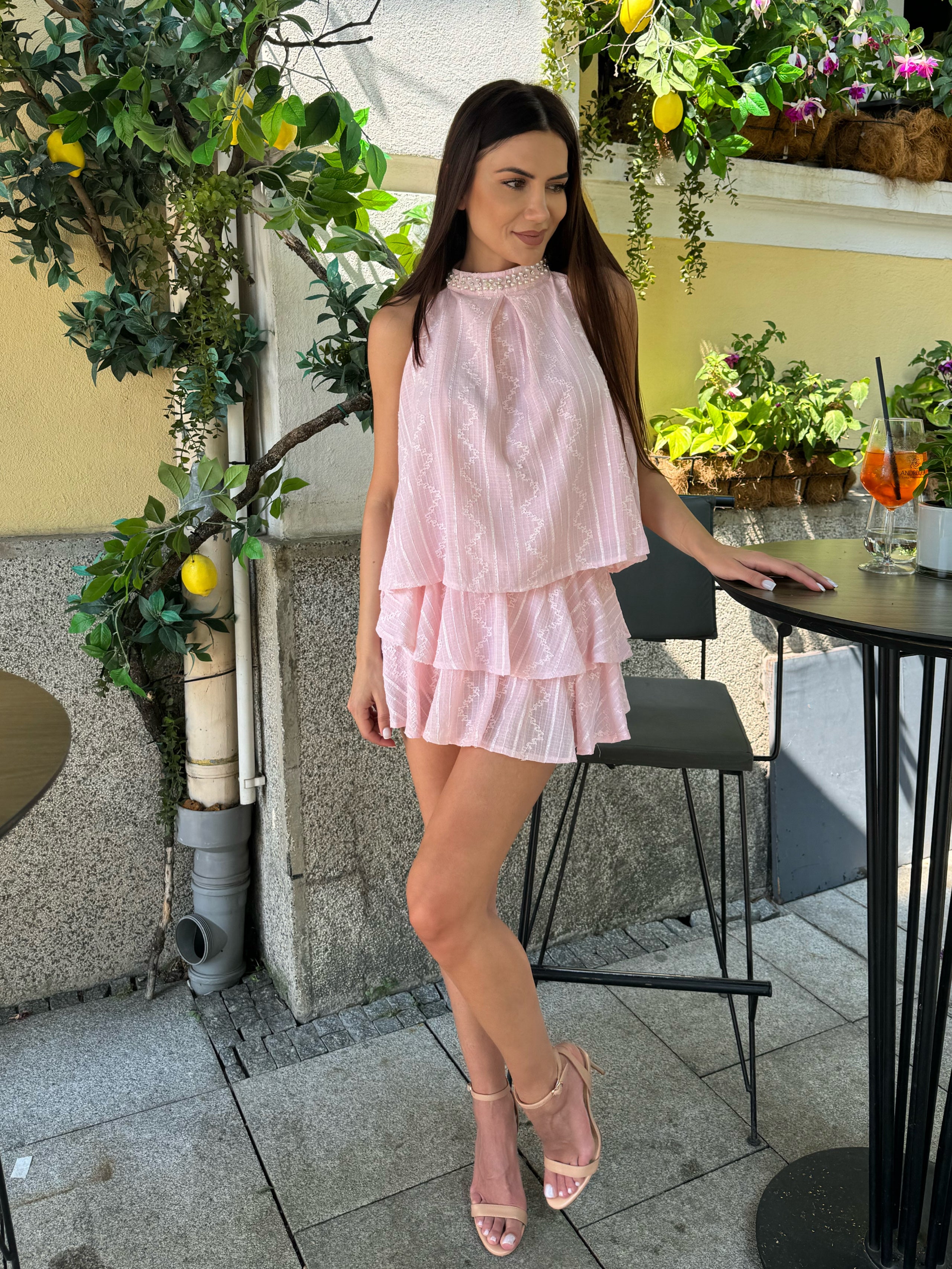 Free model QUEEN SET of two pieces BLOUSE with decorative pearls on the neck and SKIRT with shorts on the inside.