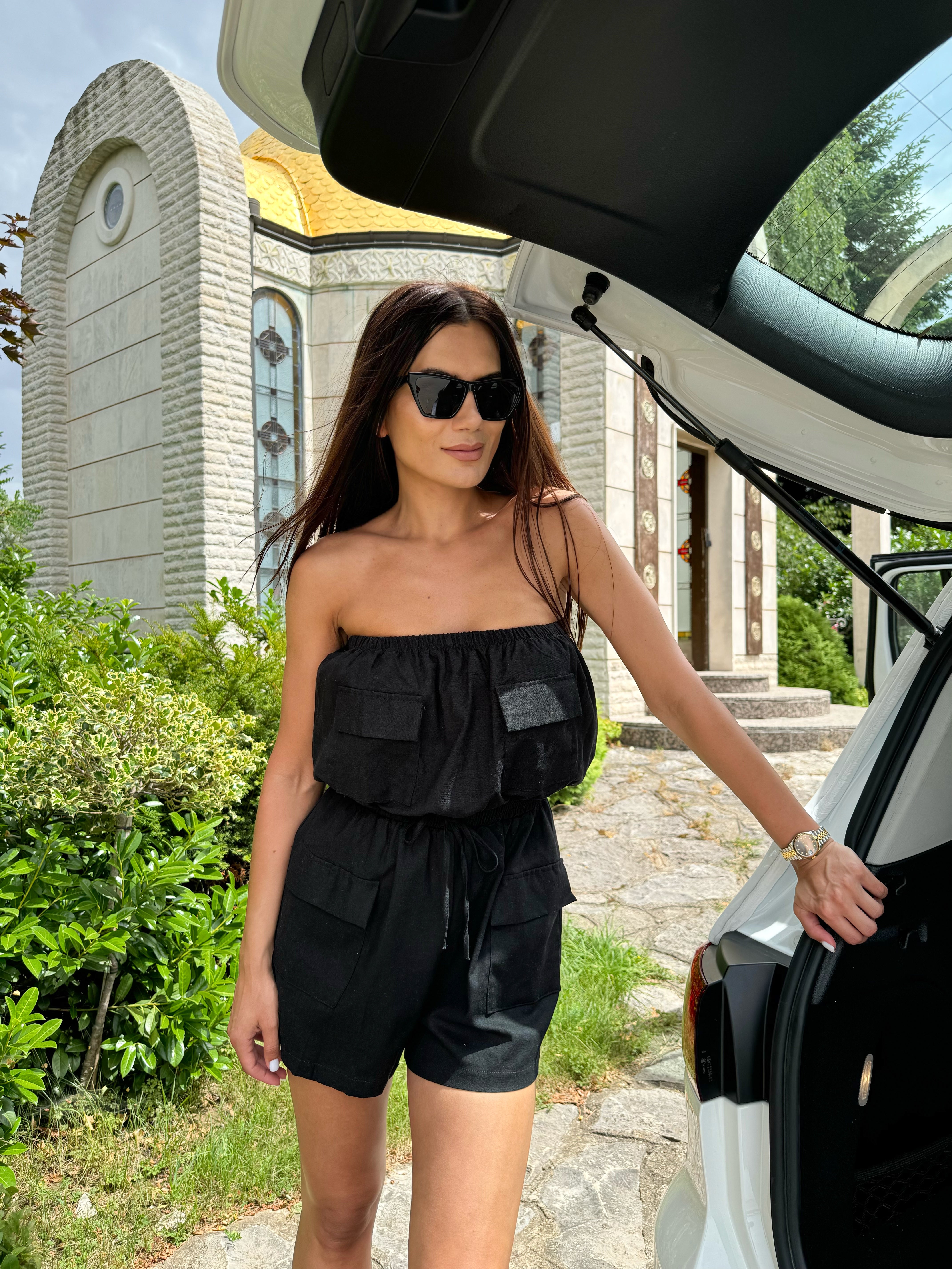 Fitted OVERALLS from the GLAM collection in black. Comfortable to wear, with an internal gathered elastic at the waist.