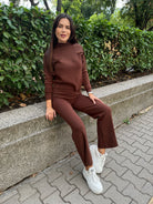 Елегантен плетен комплект от две части, вдъхновен от италианския минимализъм и лукса на Loro Piana. Изработен от меко, еластично плетиво с копринено усещане. Пуловер с изчистена линия и панталон с висока талия – комфорт и класа в едно.