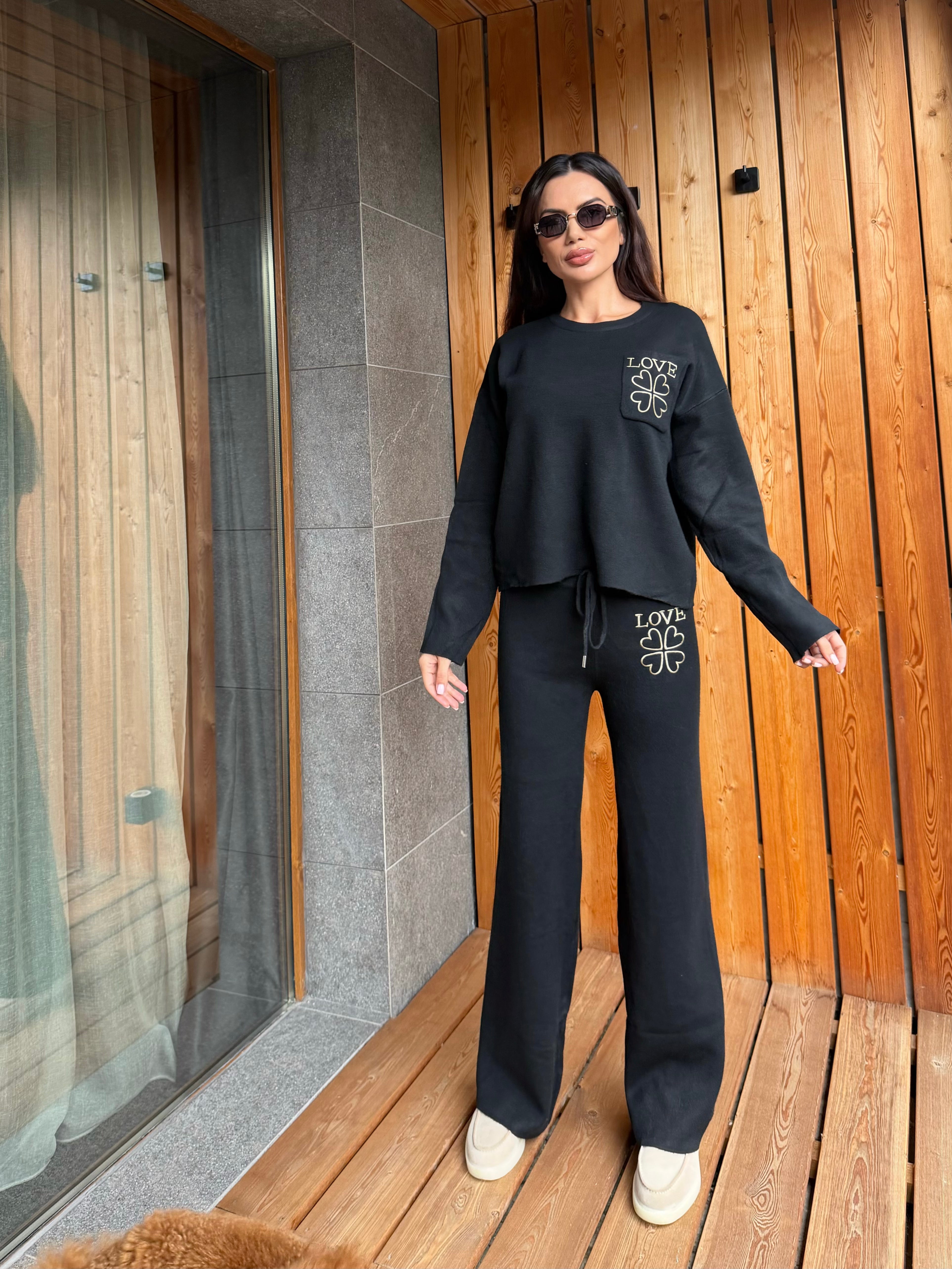 Елегантен и комфортен комплект от мека плетена материя, състоящ се от горна част с връзки на талията и избродиран надпис LOVE с детайл във формата на четирилистна детелина. Панталонът е с висока талия, връзки за регулиране и изчистена линия, която издължава силуета.