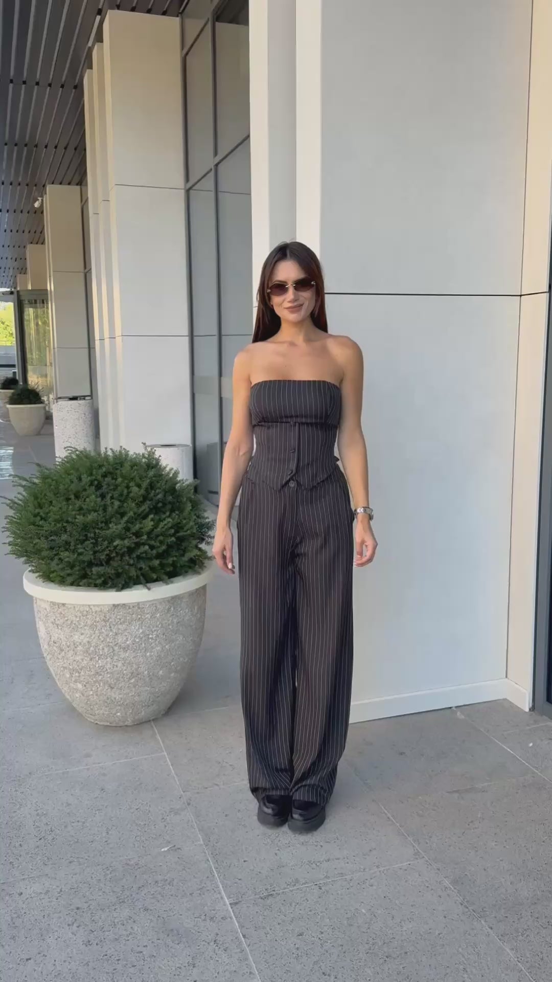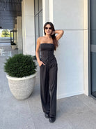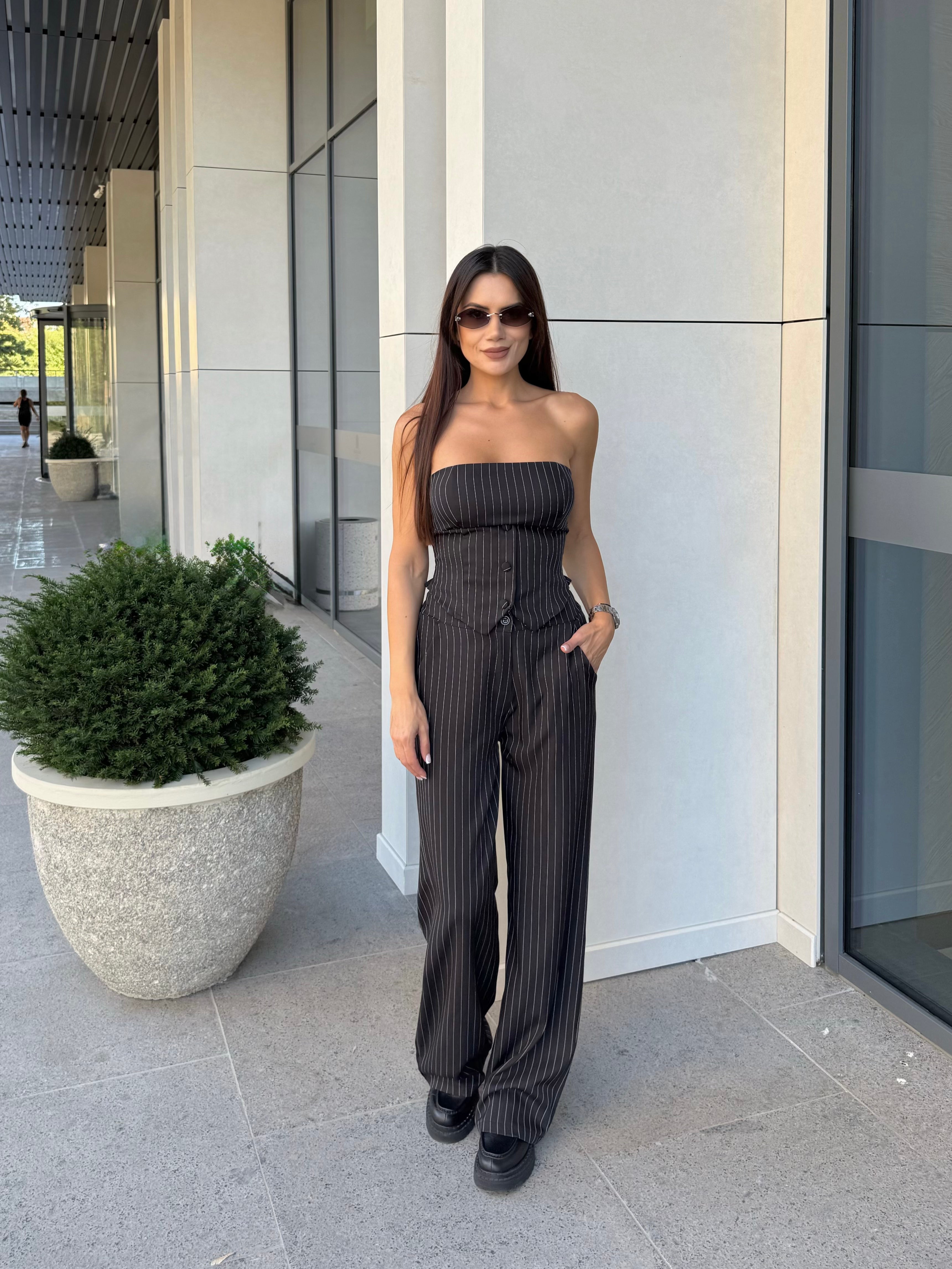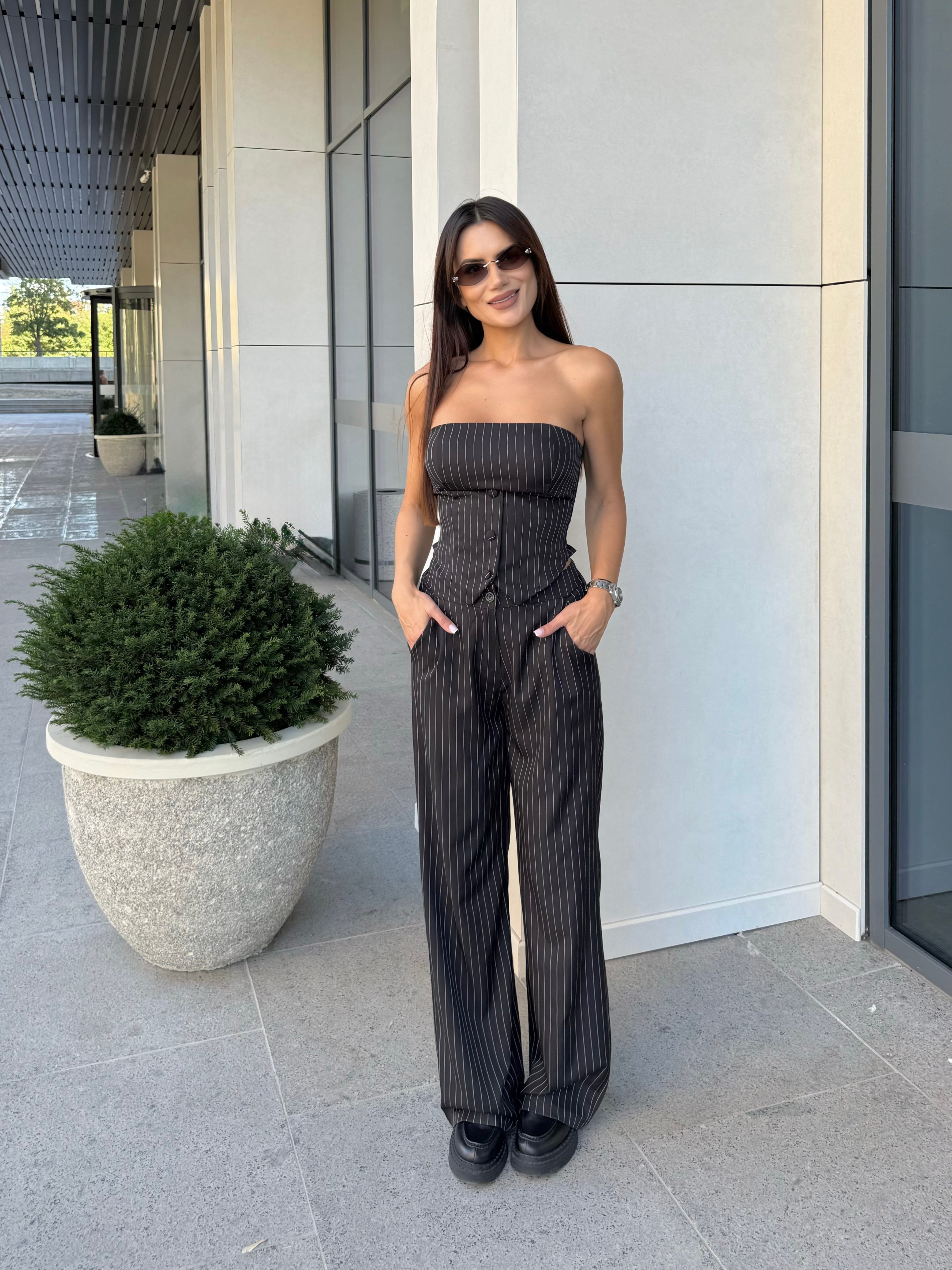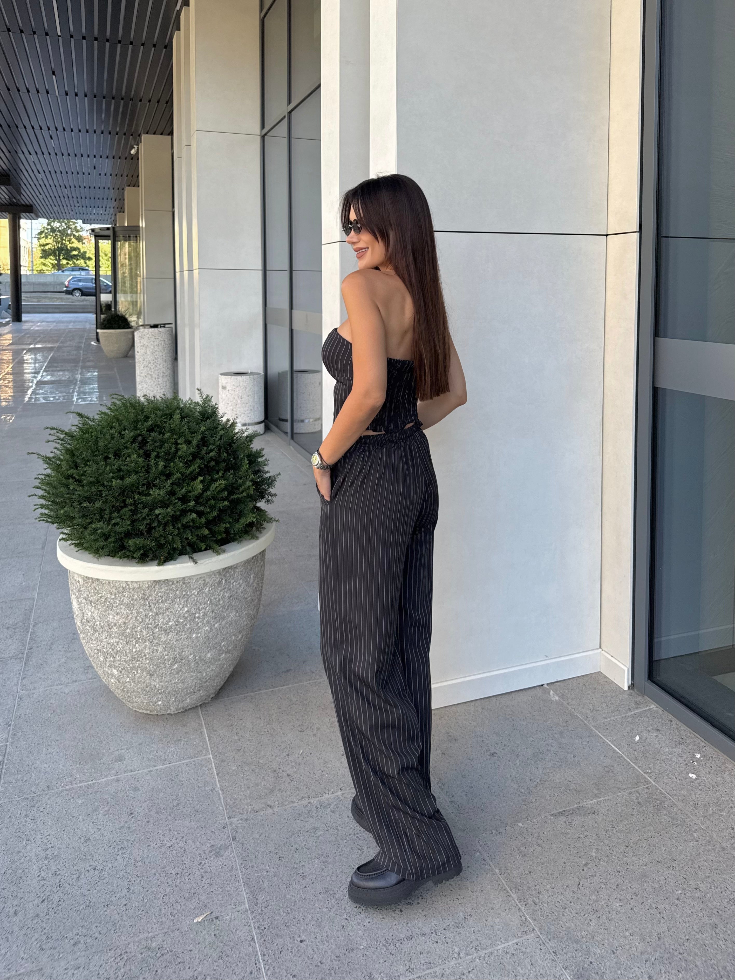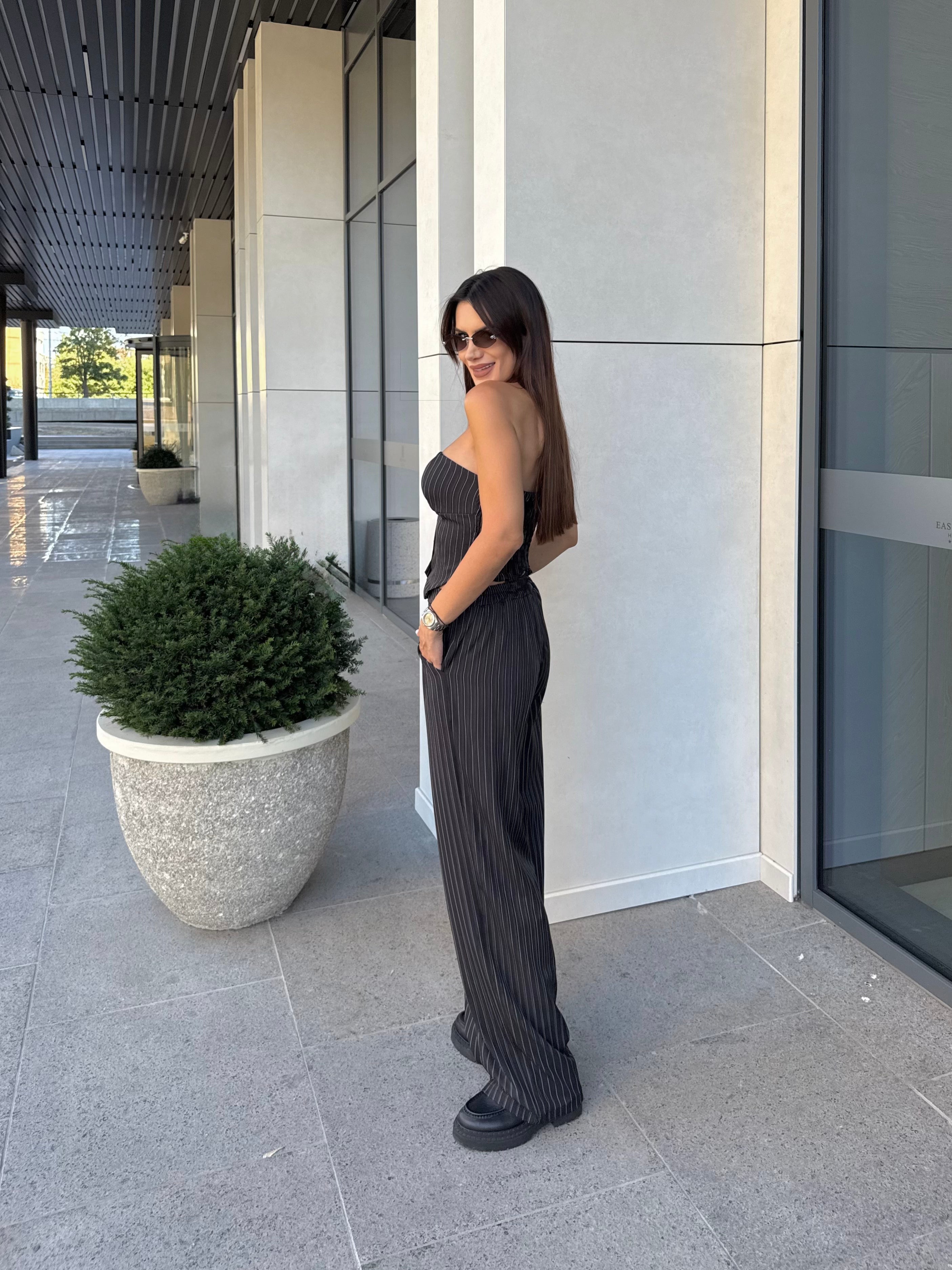 Стилен комплект от бюстие с корсетна визия и панталон с висока талия в класическо райе. Бюстието е с еластична задна част за комфорт и акцентни копчета отпред, а панталонът е с дълъг и прав силует, който издължава фигурата. Модел, който съчетава елегантност и удобство – подходящ както за ежедневието, така и за специални поводи.