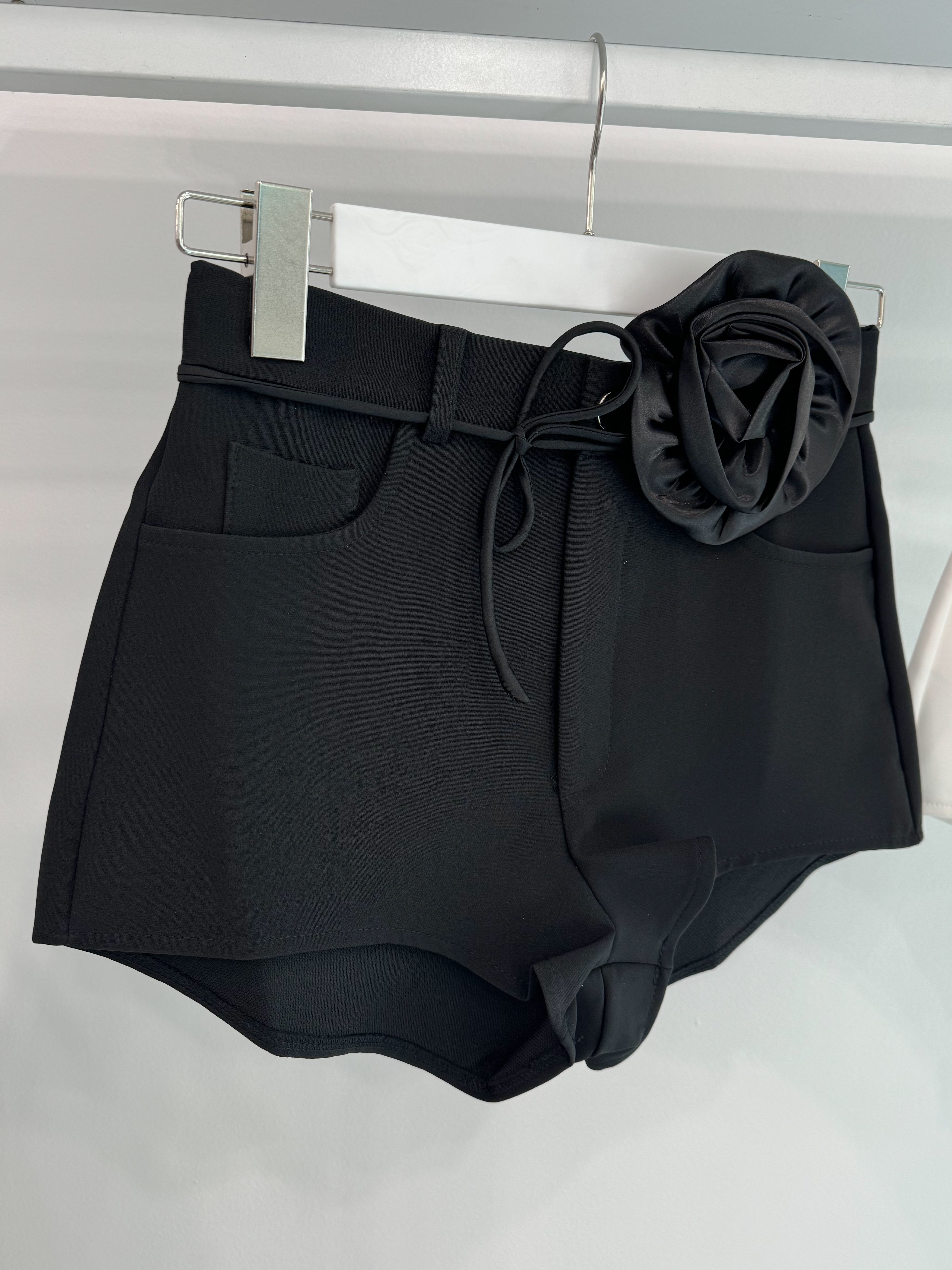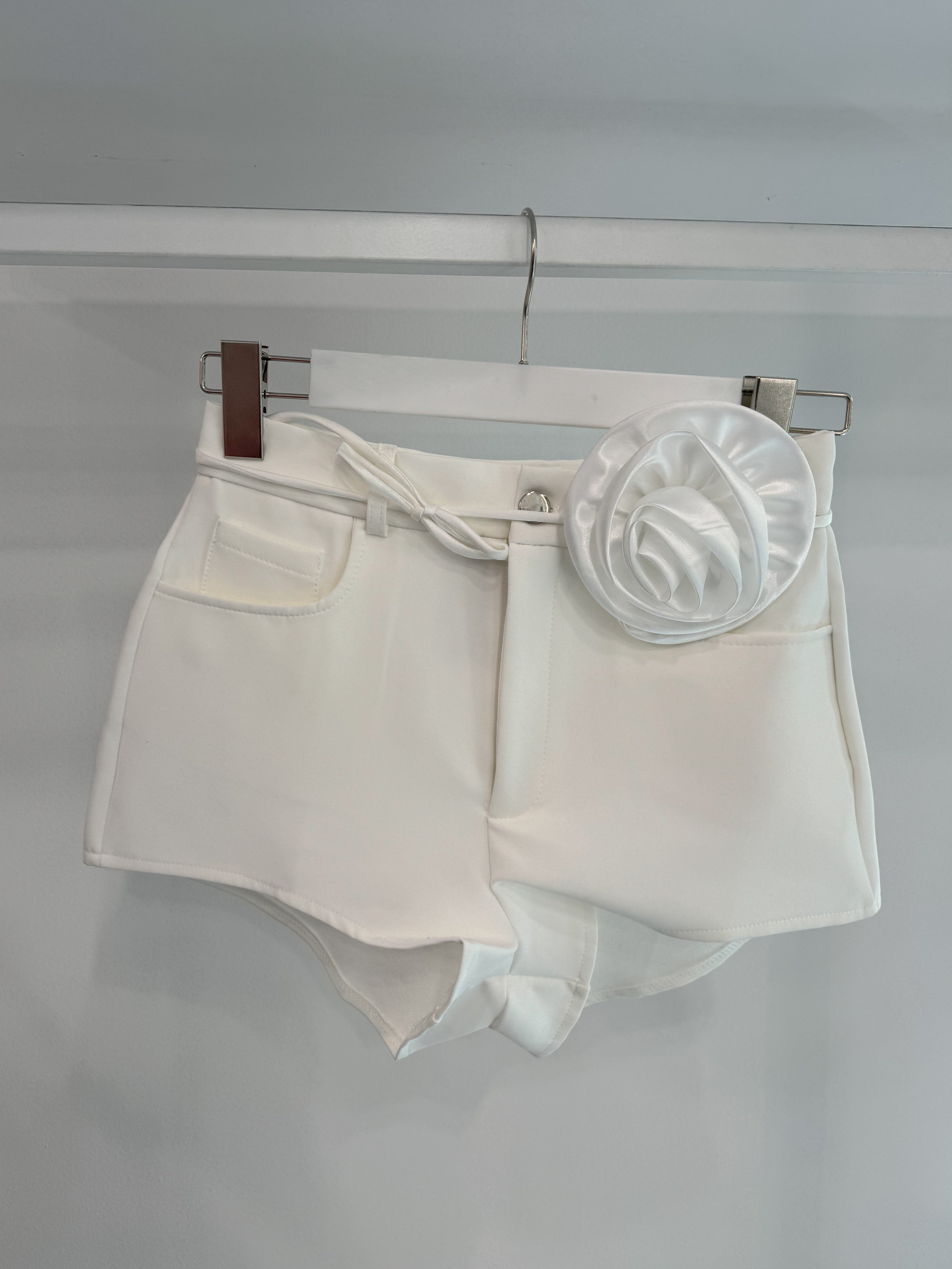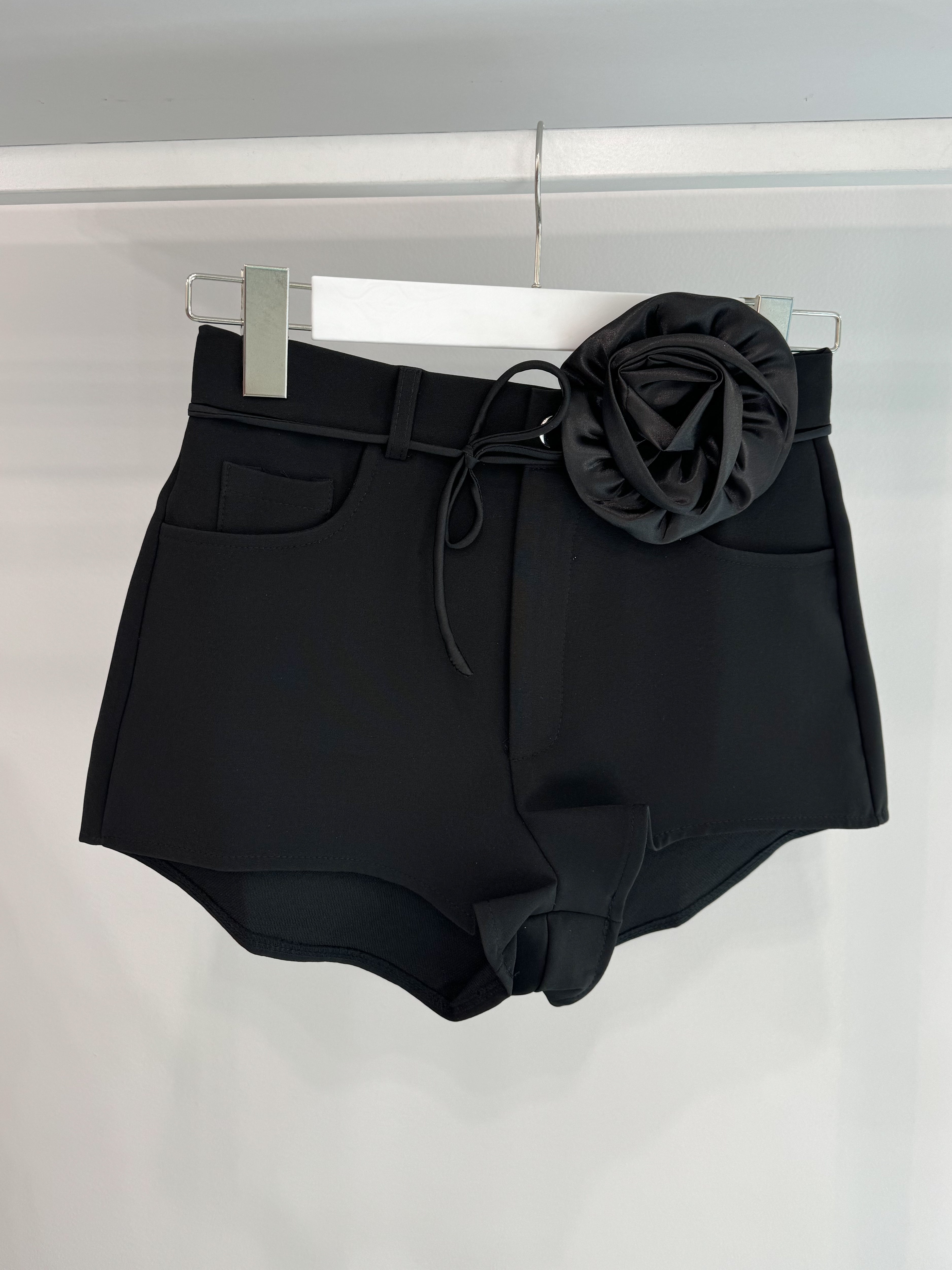 SHORTS with decorative rose brooch.