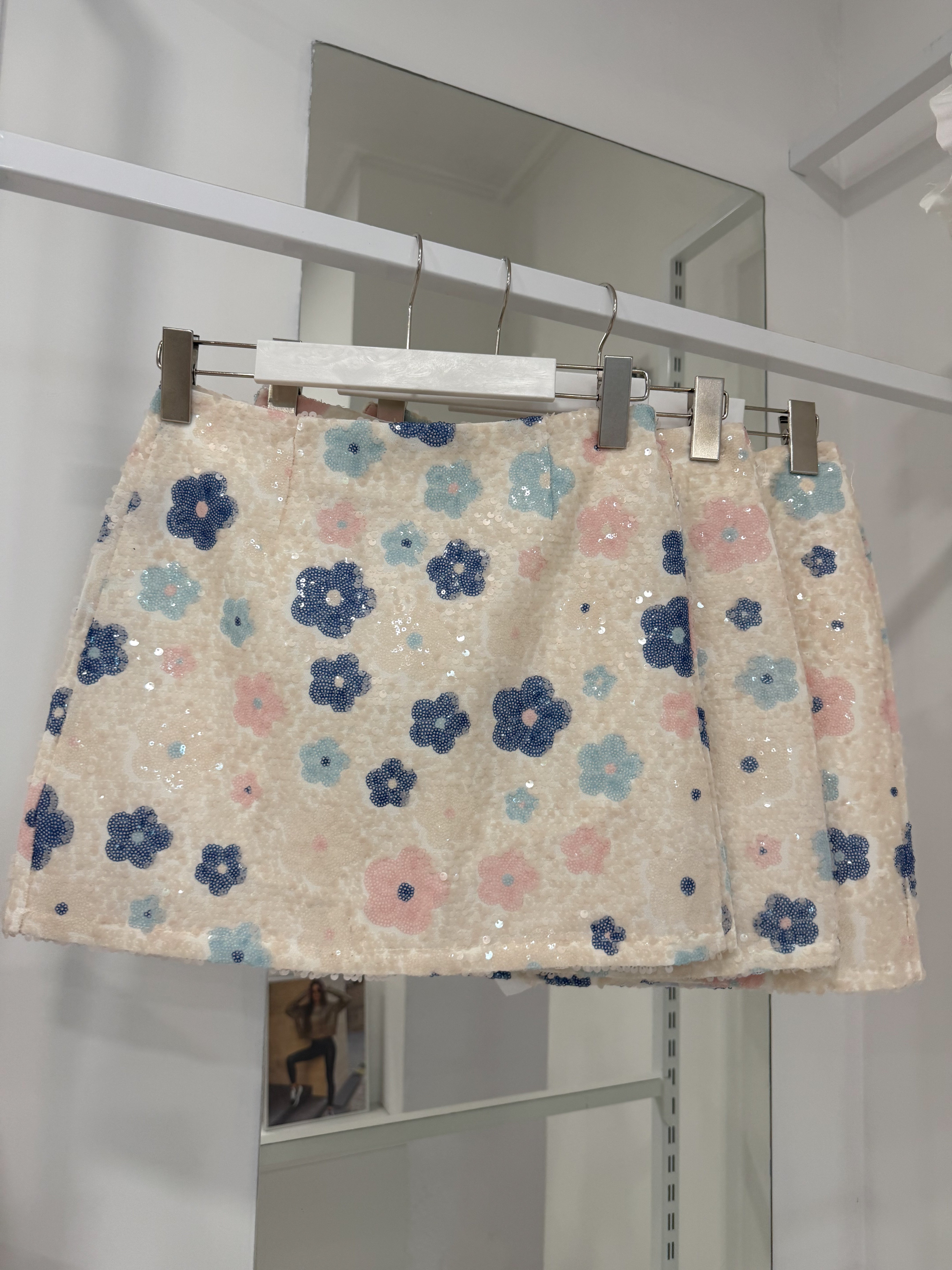 Short skirt with high waist and spectacular sequins. Zips up at the back, lined on the inside - shorts.