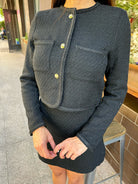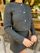 The GRACE two-piece suit features a cropped tailored jacket and a straight above-the-knee skirt.