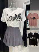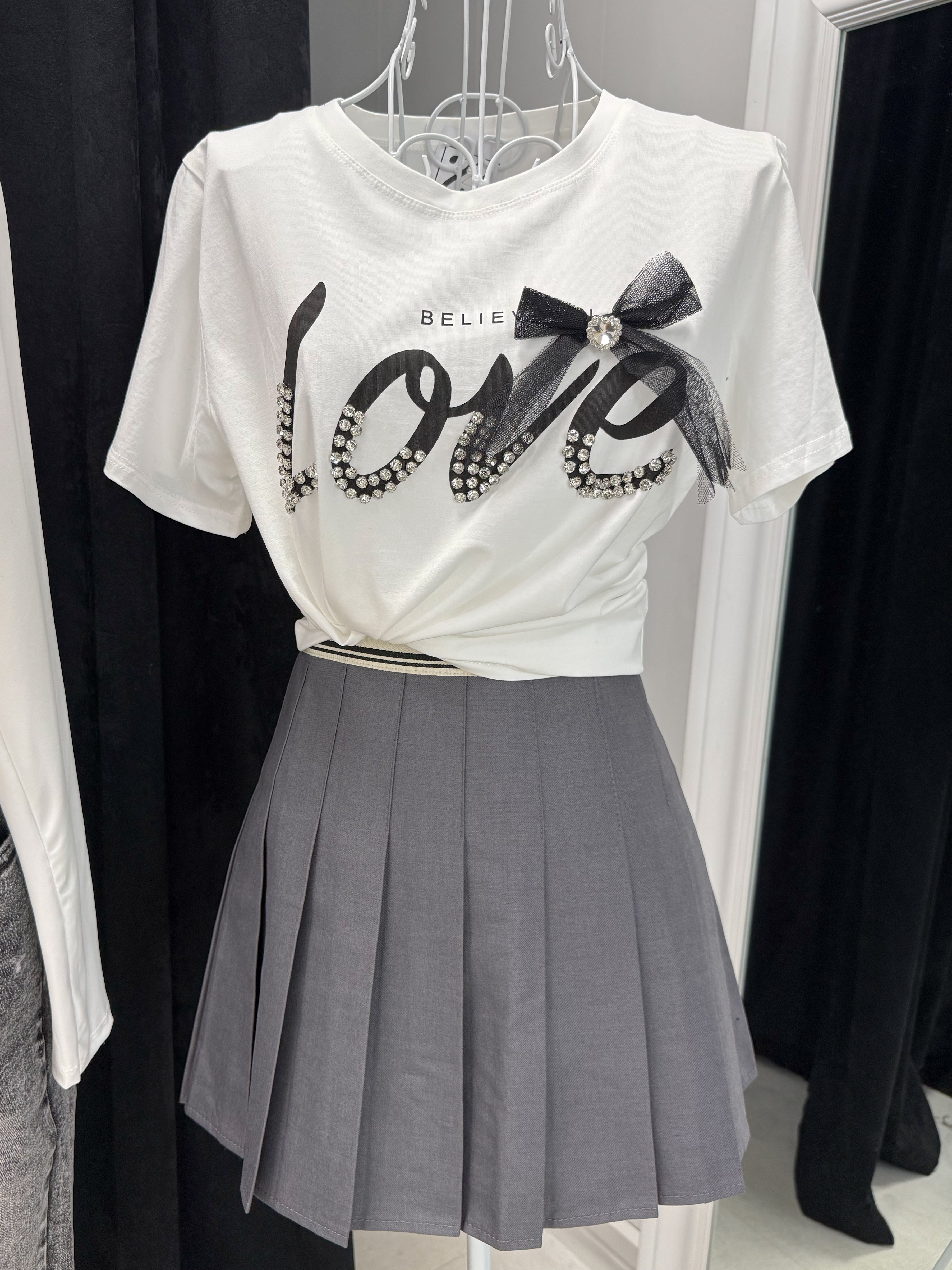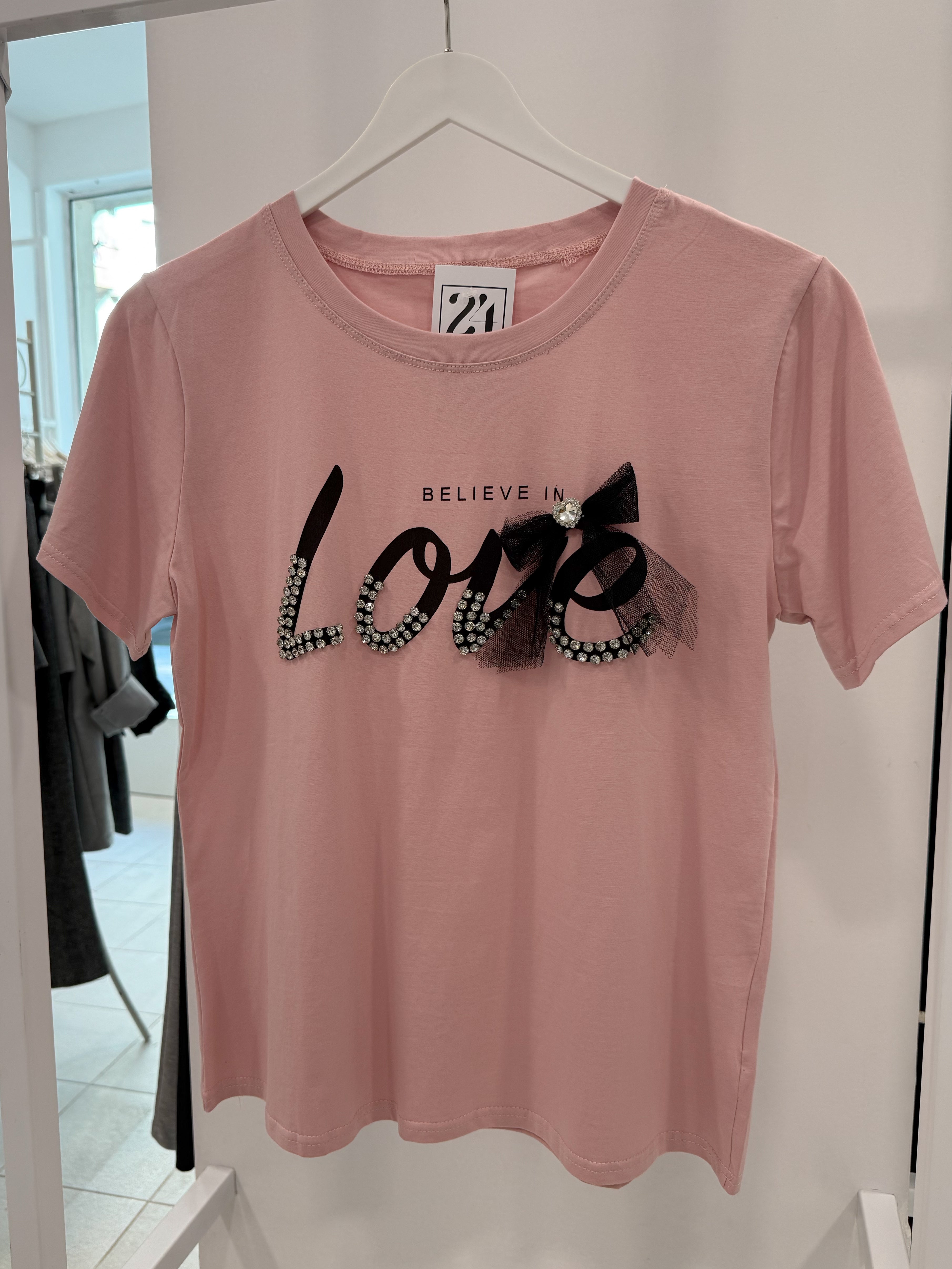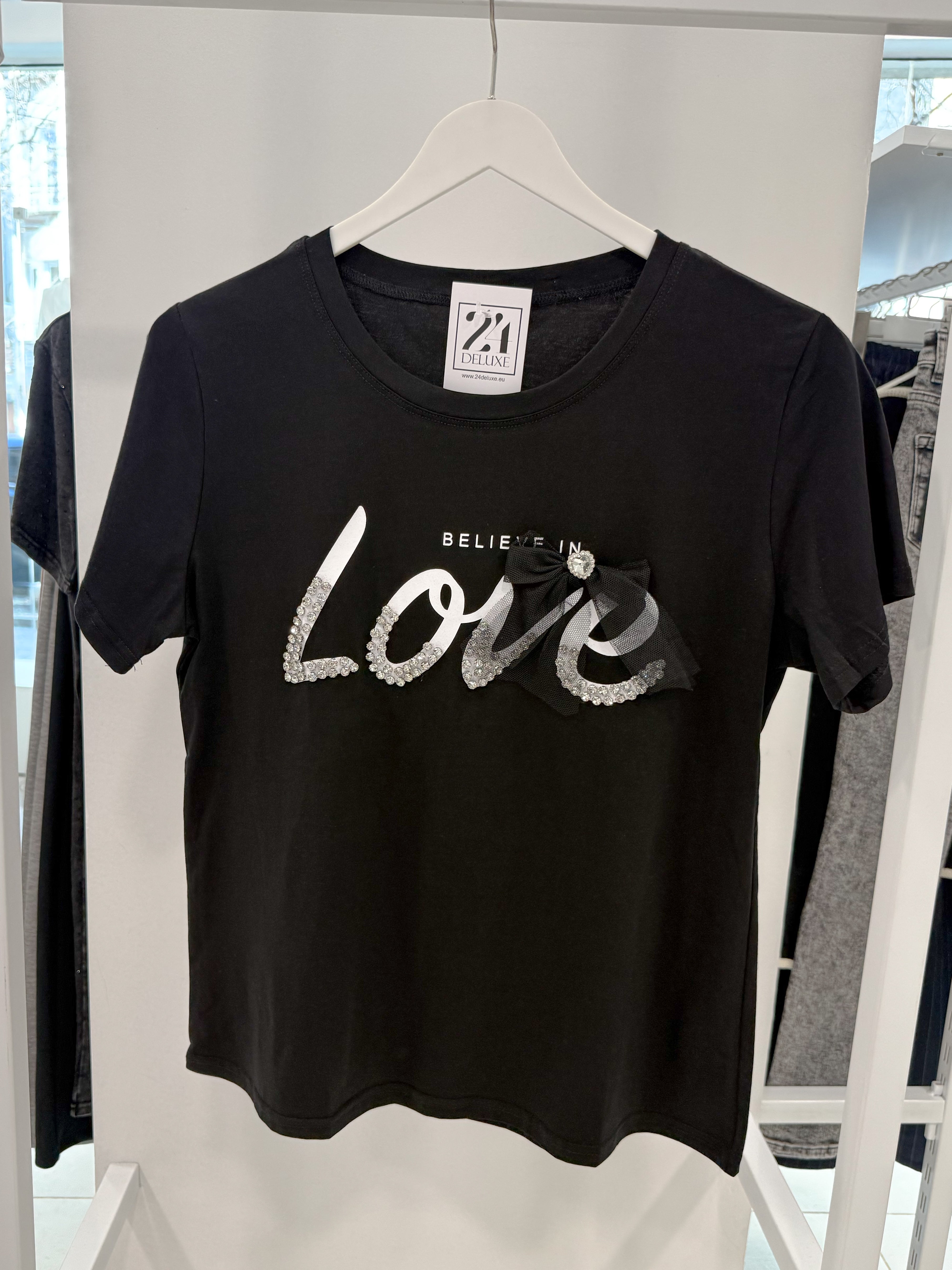 Limited collection T-shirt with inscription, ribbon and spectacular stones on the front.