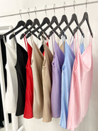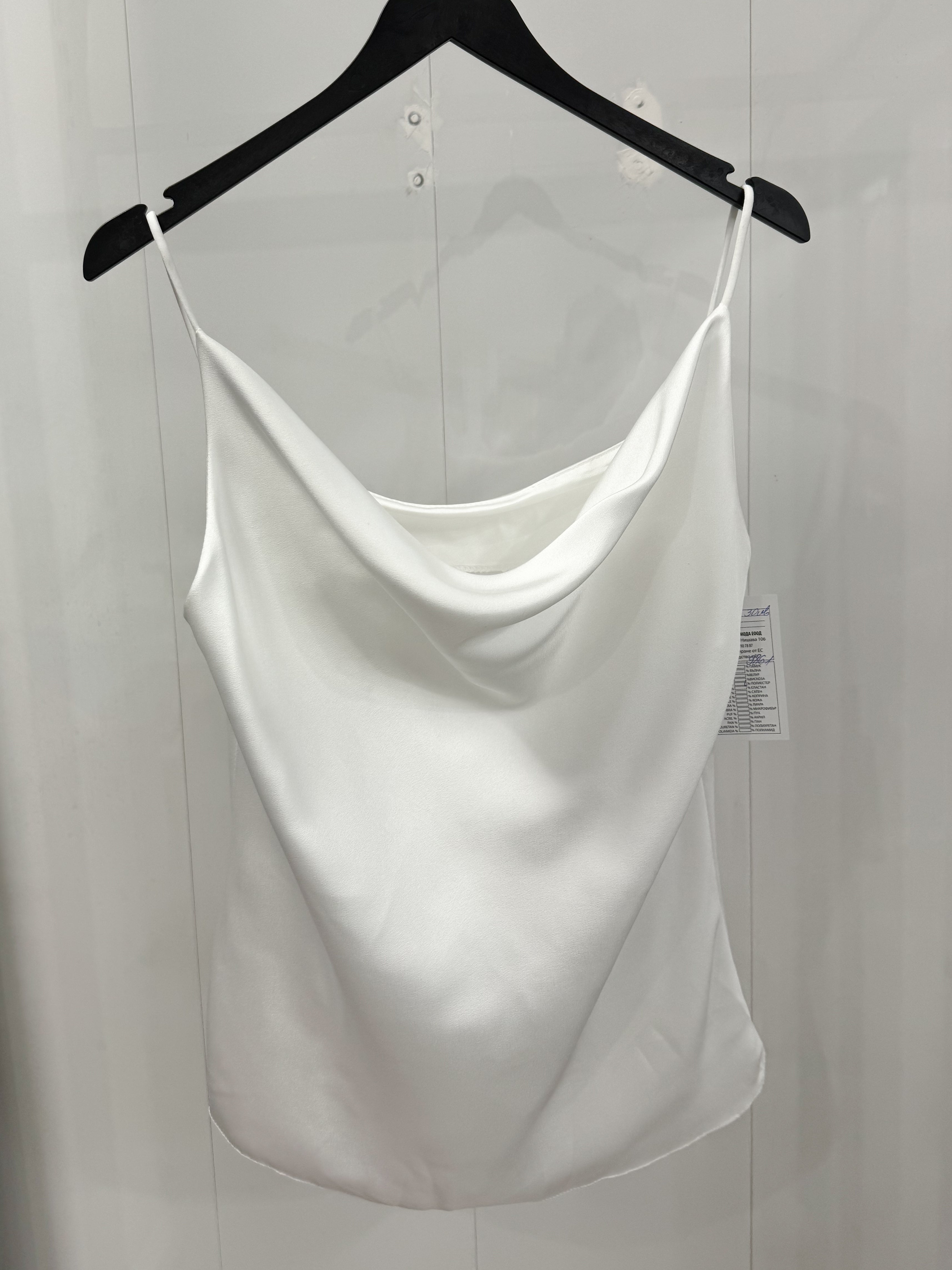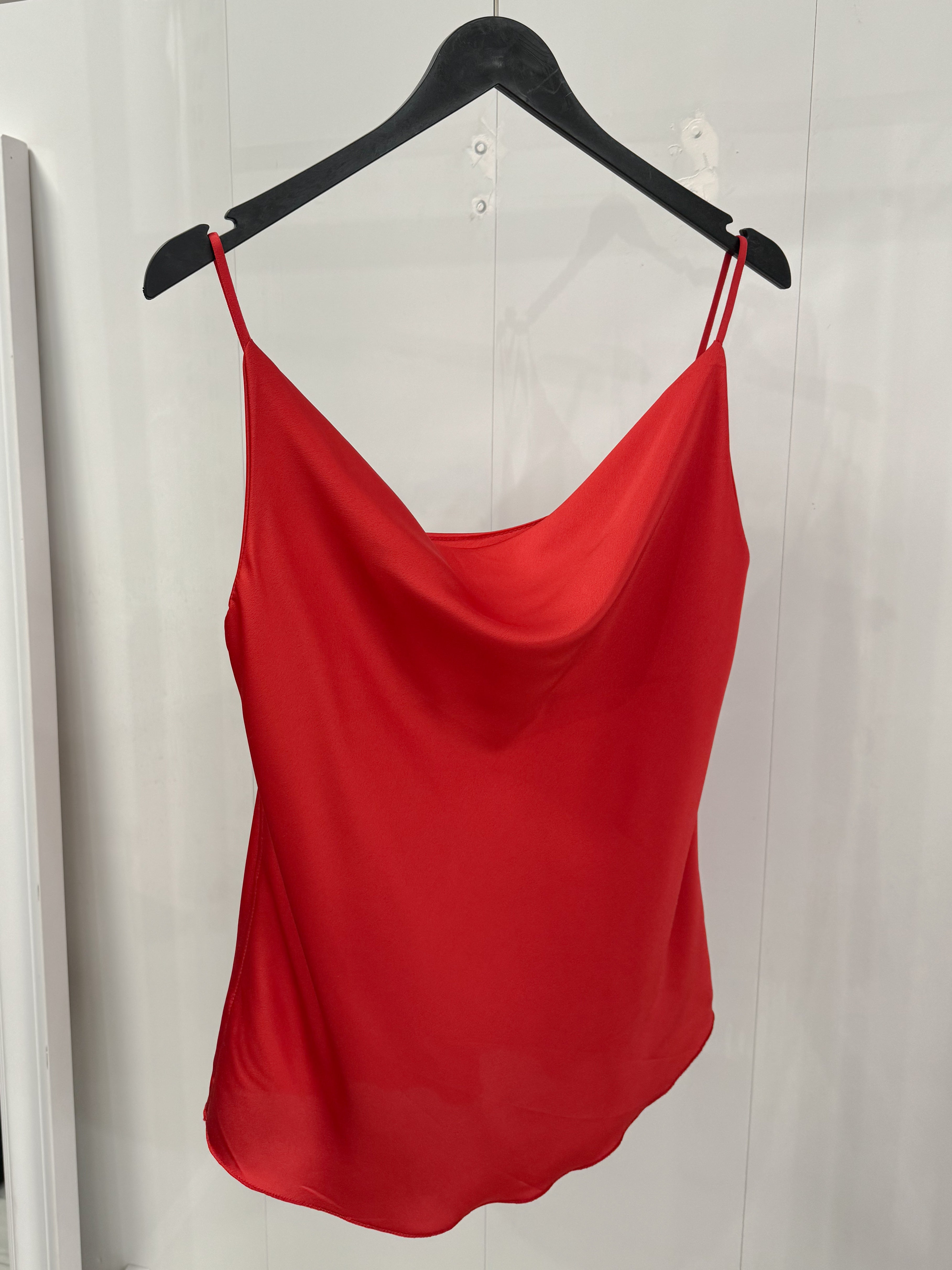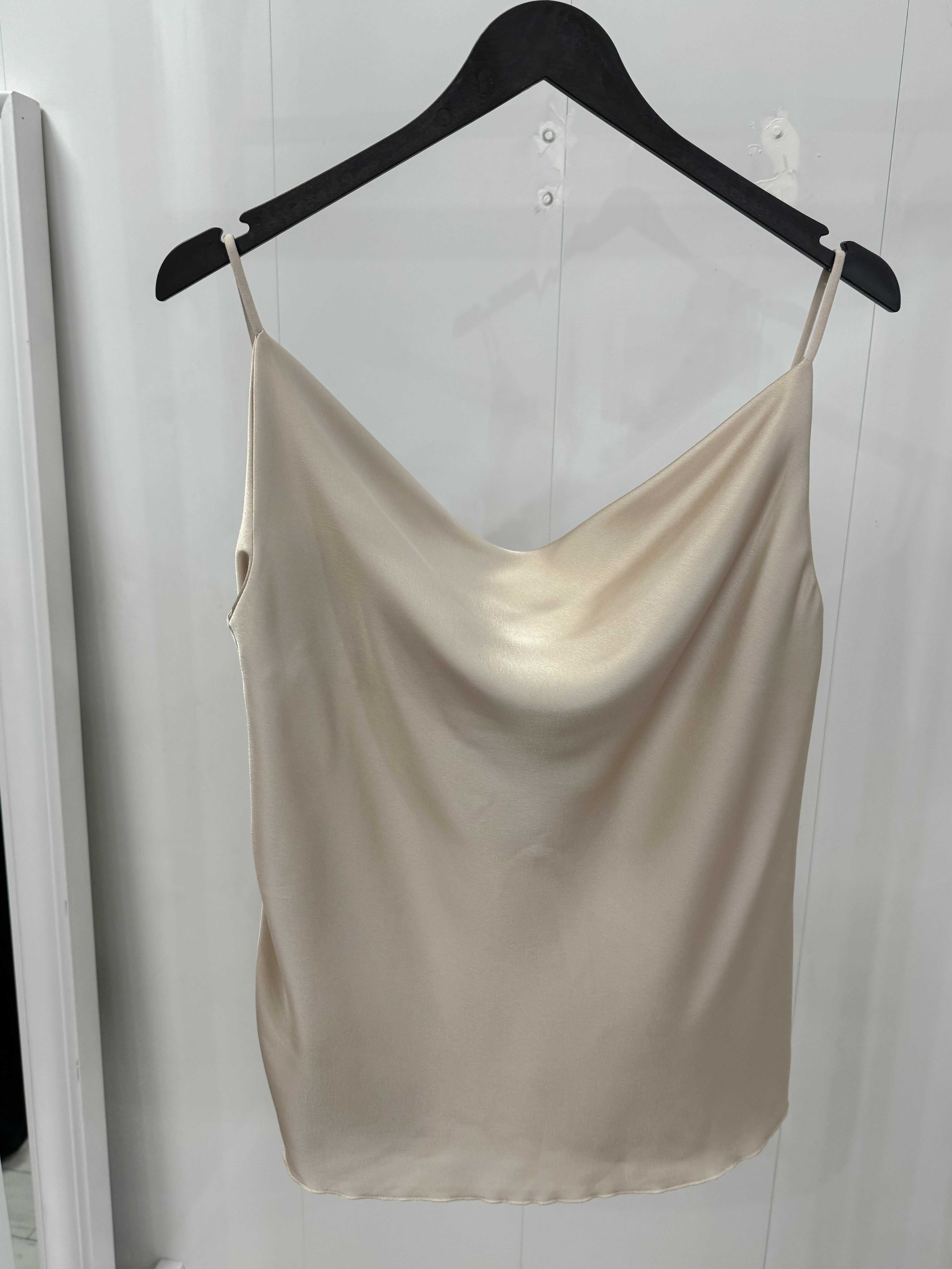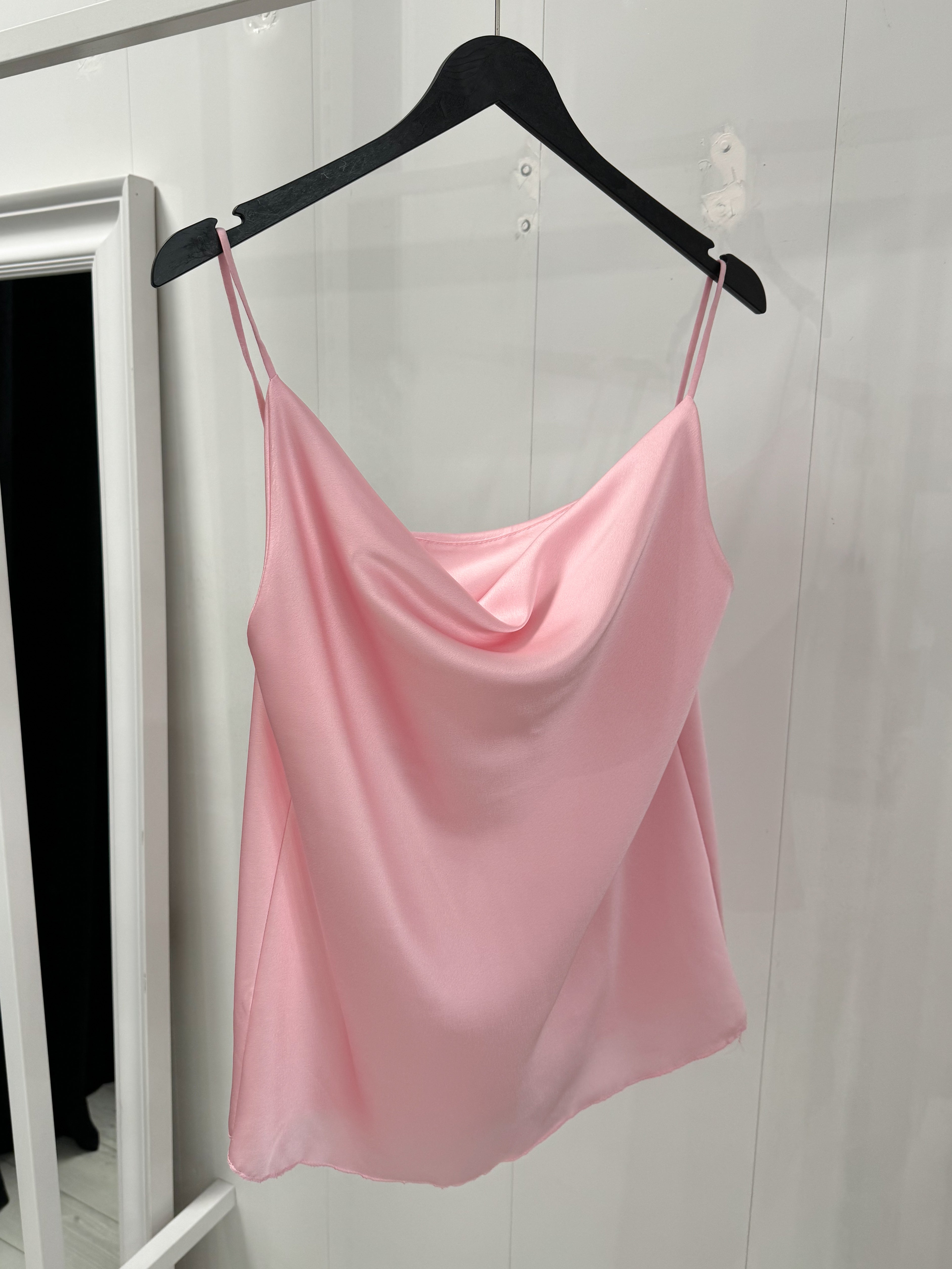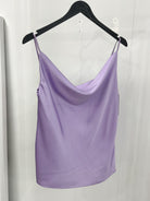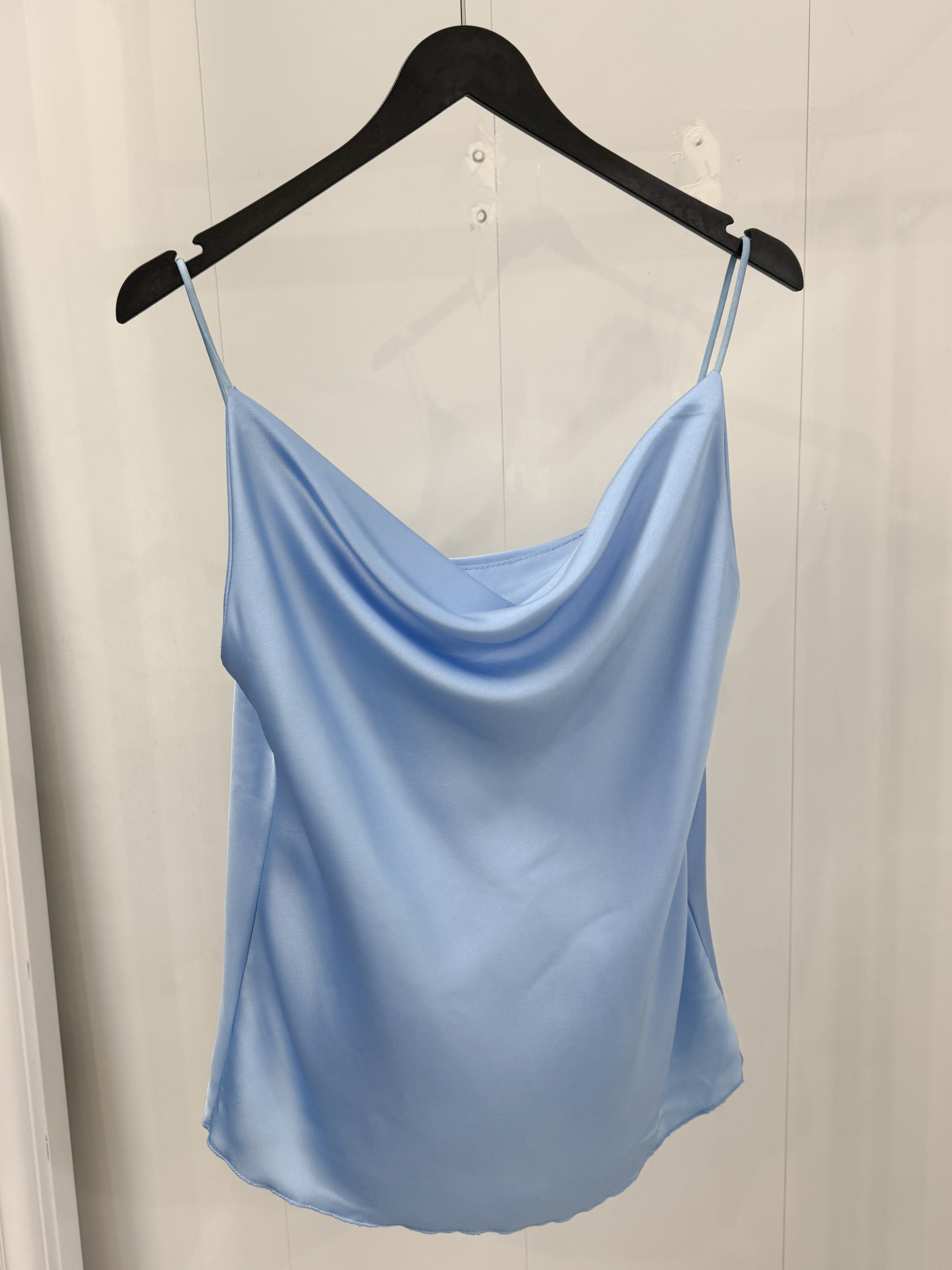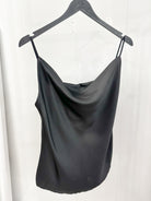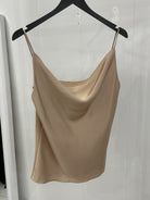 Every lady's favorite model, a satin tank top with a Grecian neckline.