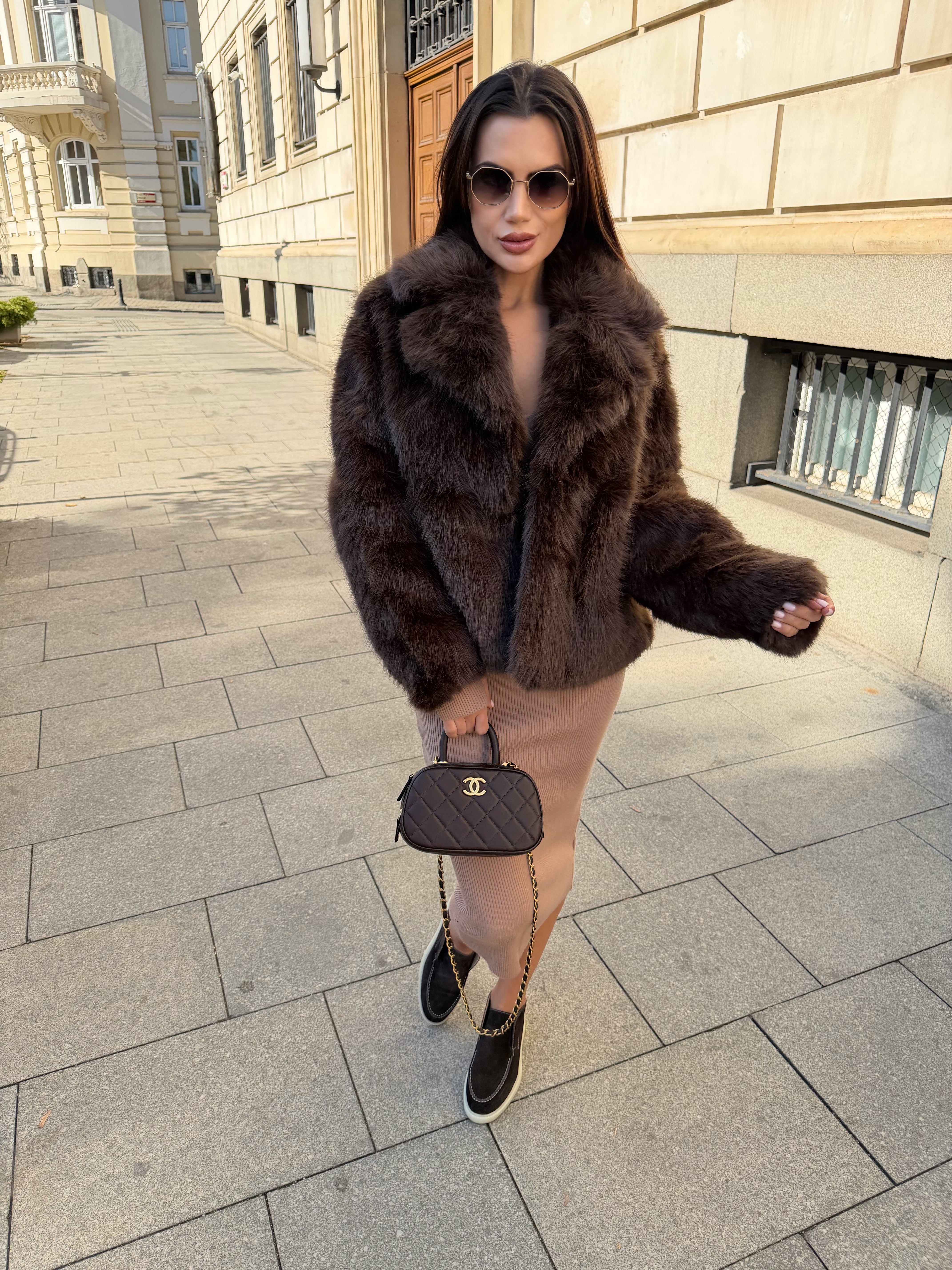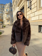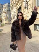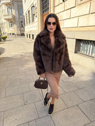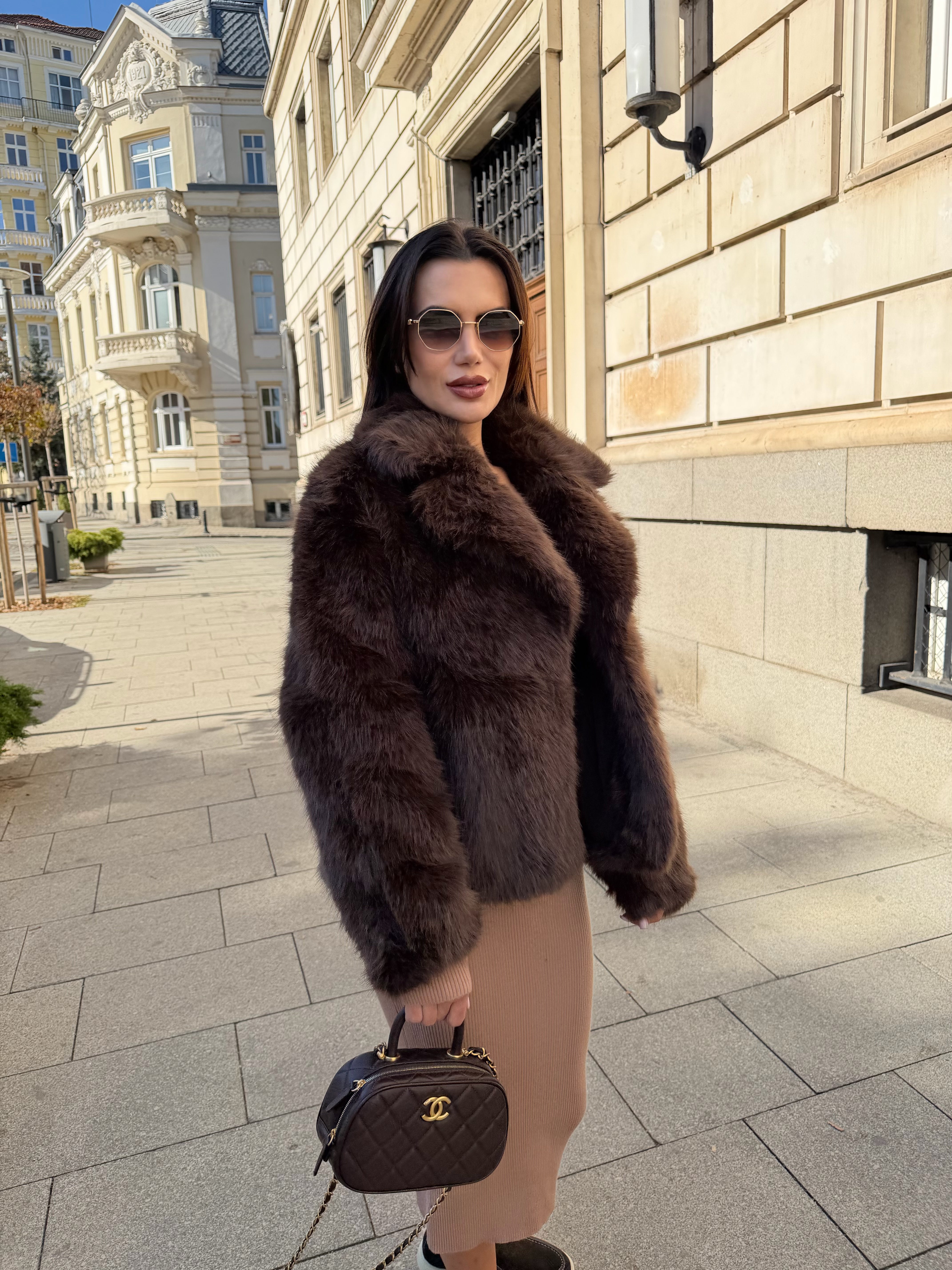 Луксозно късо палто, изработено от пухкав еко косъм в дълбок шоколадов цвят. Моделът впечатлява с изчистена линия, обемна яка и елегантен силует, който придава модерно и женствено излъчване.