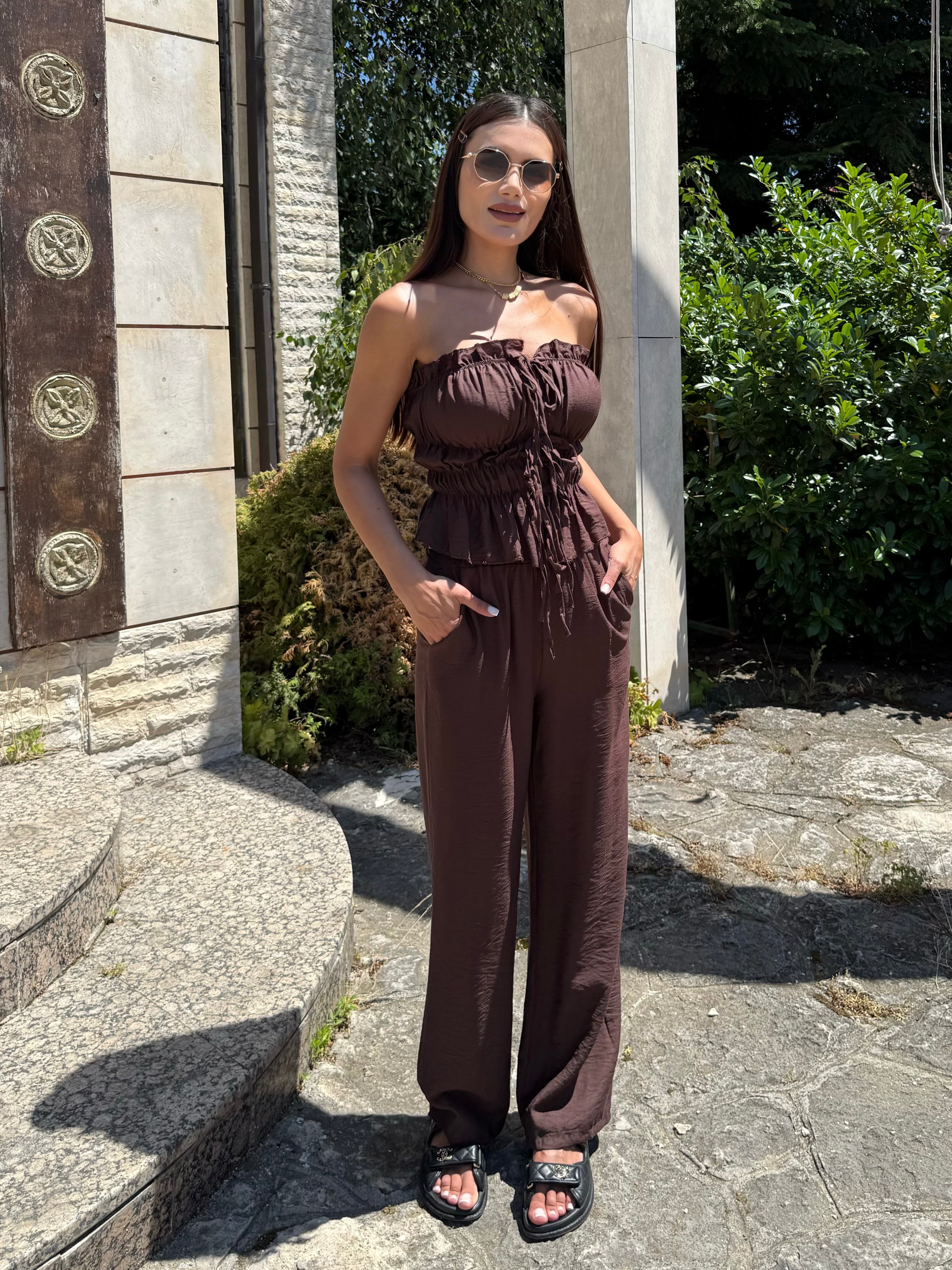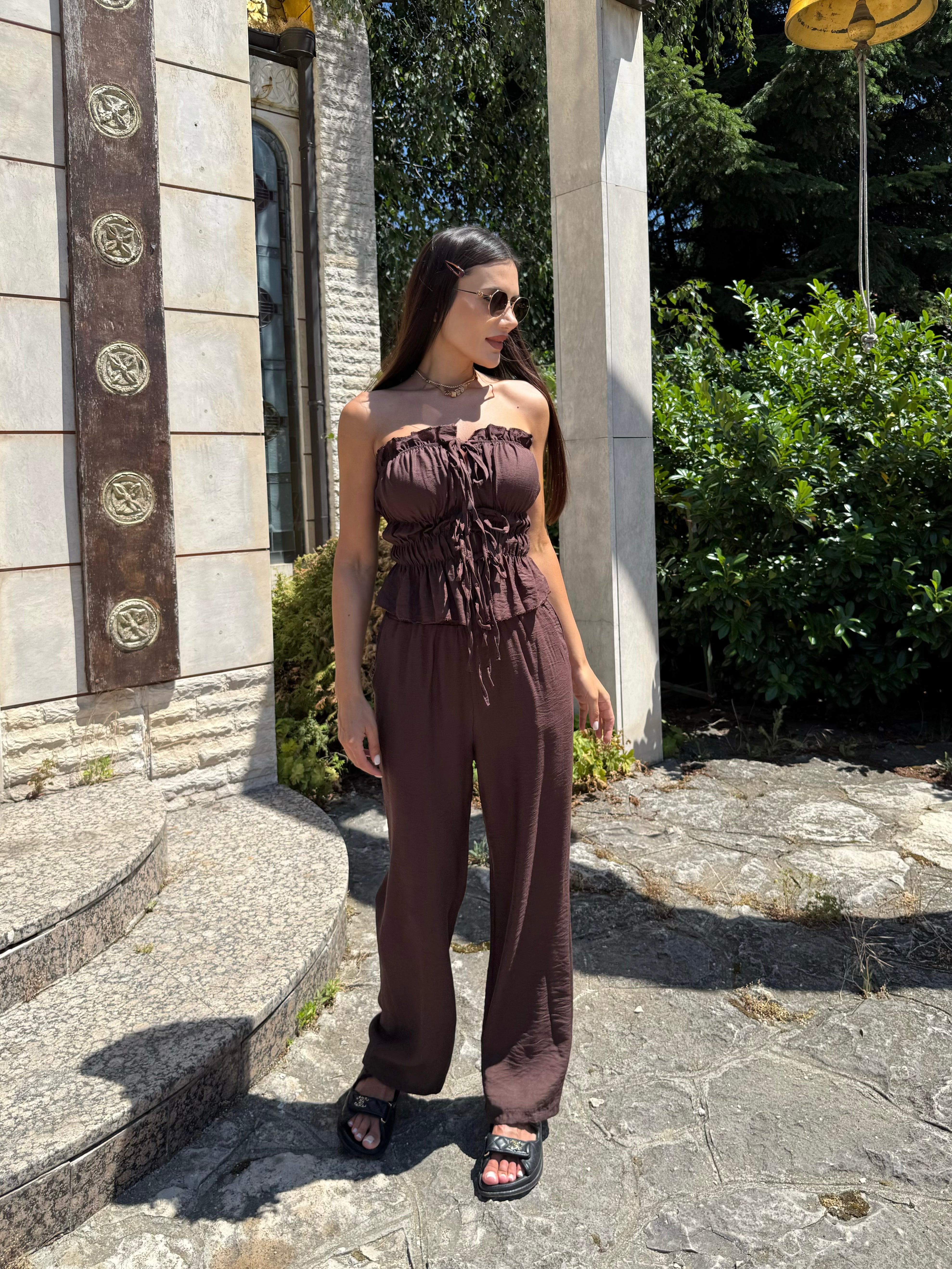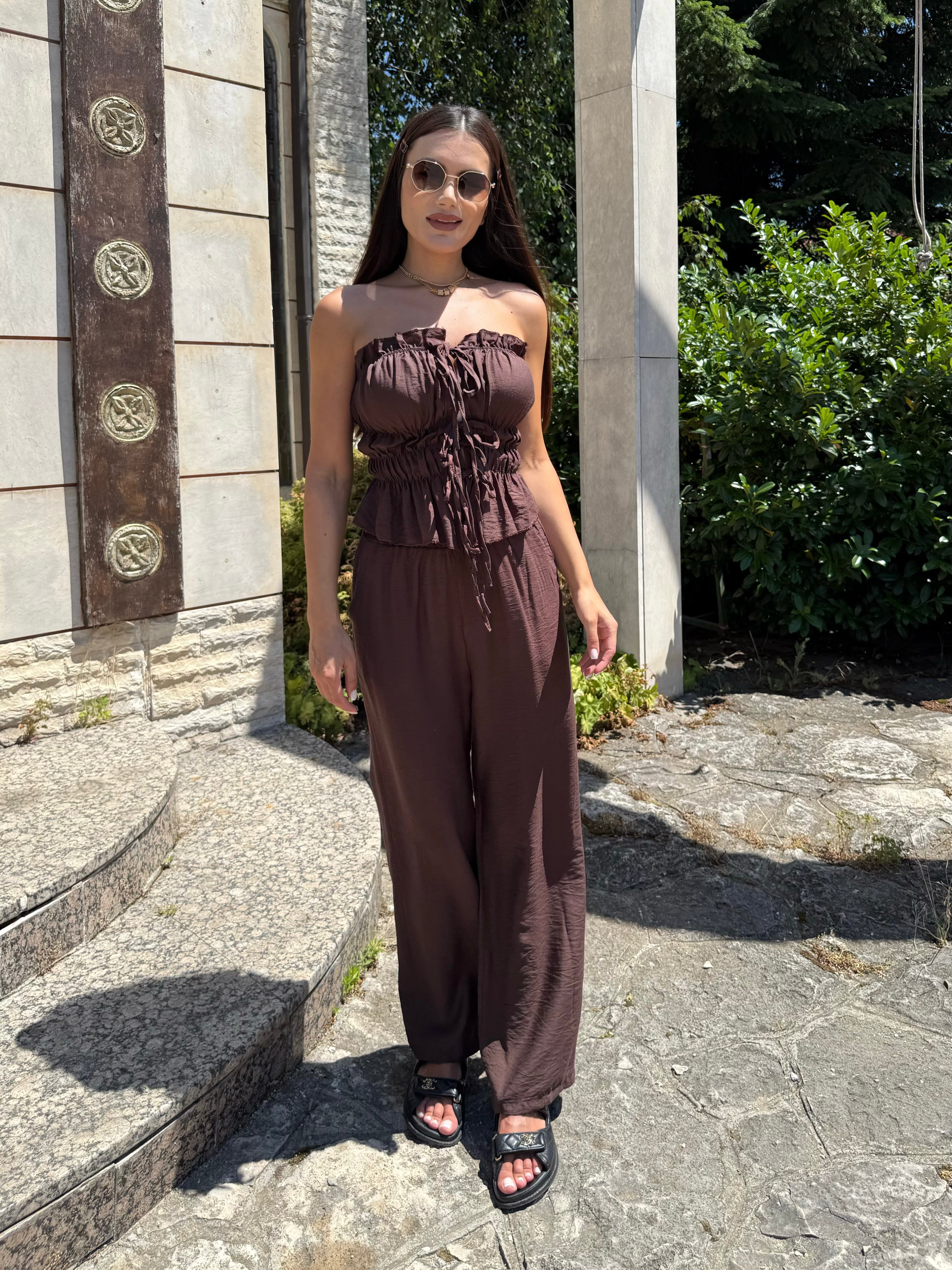The deep and warm shade gives a sense of luxury and earthy energy, while the precise cut delicately emphasizes curves. The top with pleats and ties forms an elegant line, and the wide trousers with a high waist bring lightness and confidence.