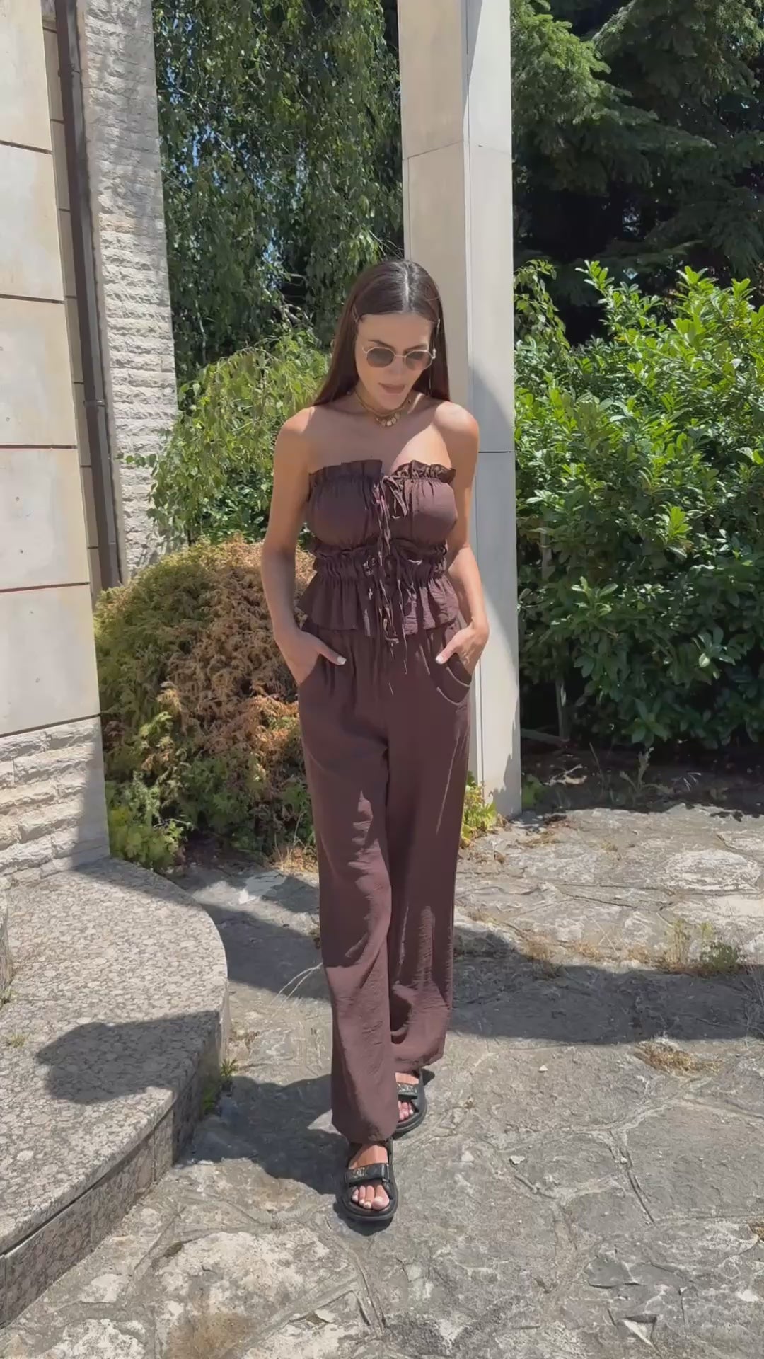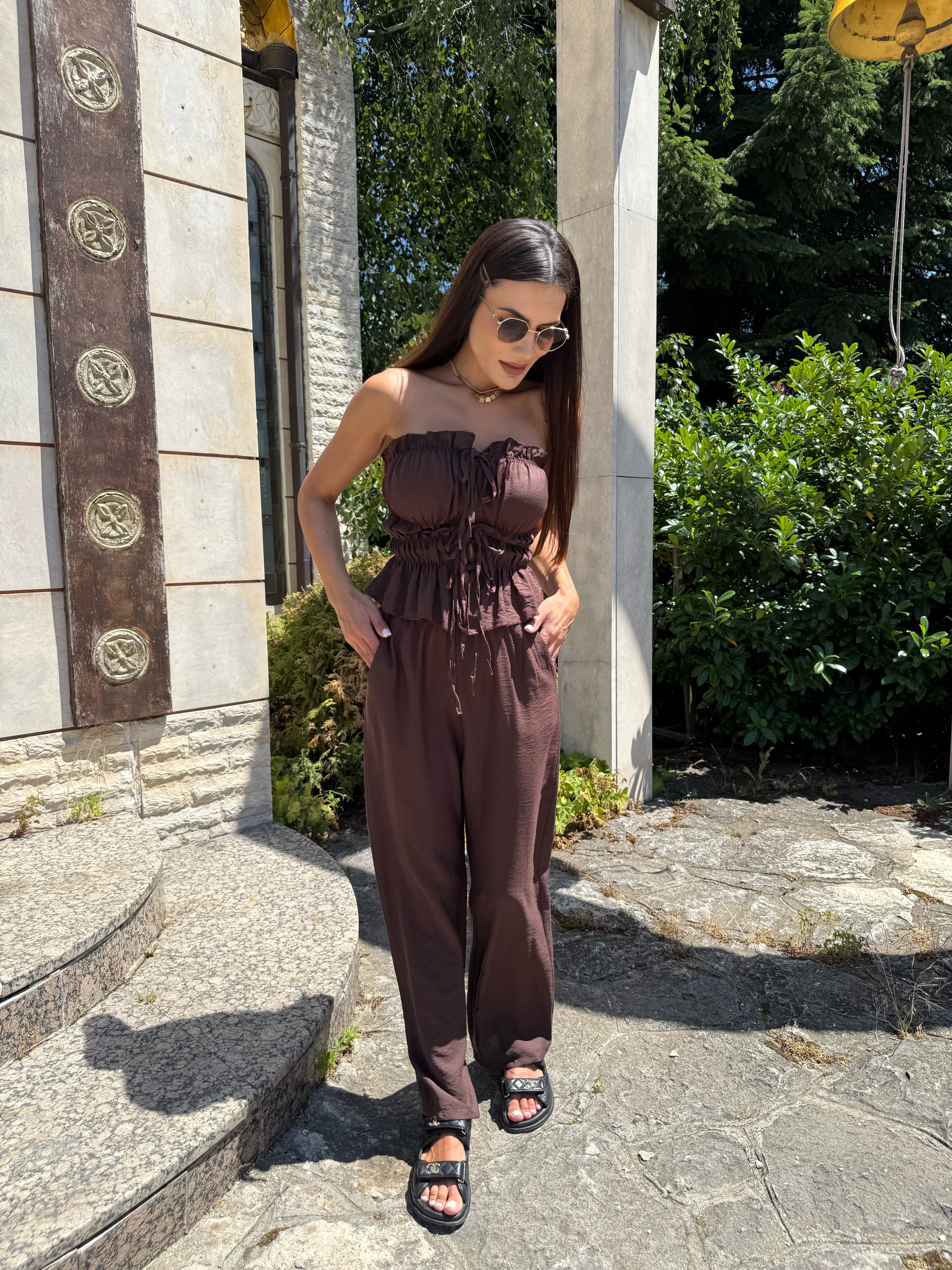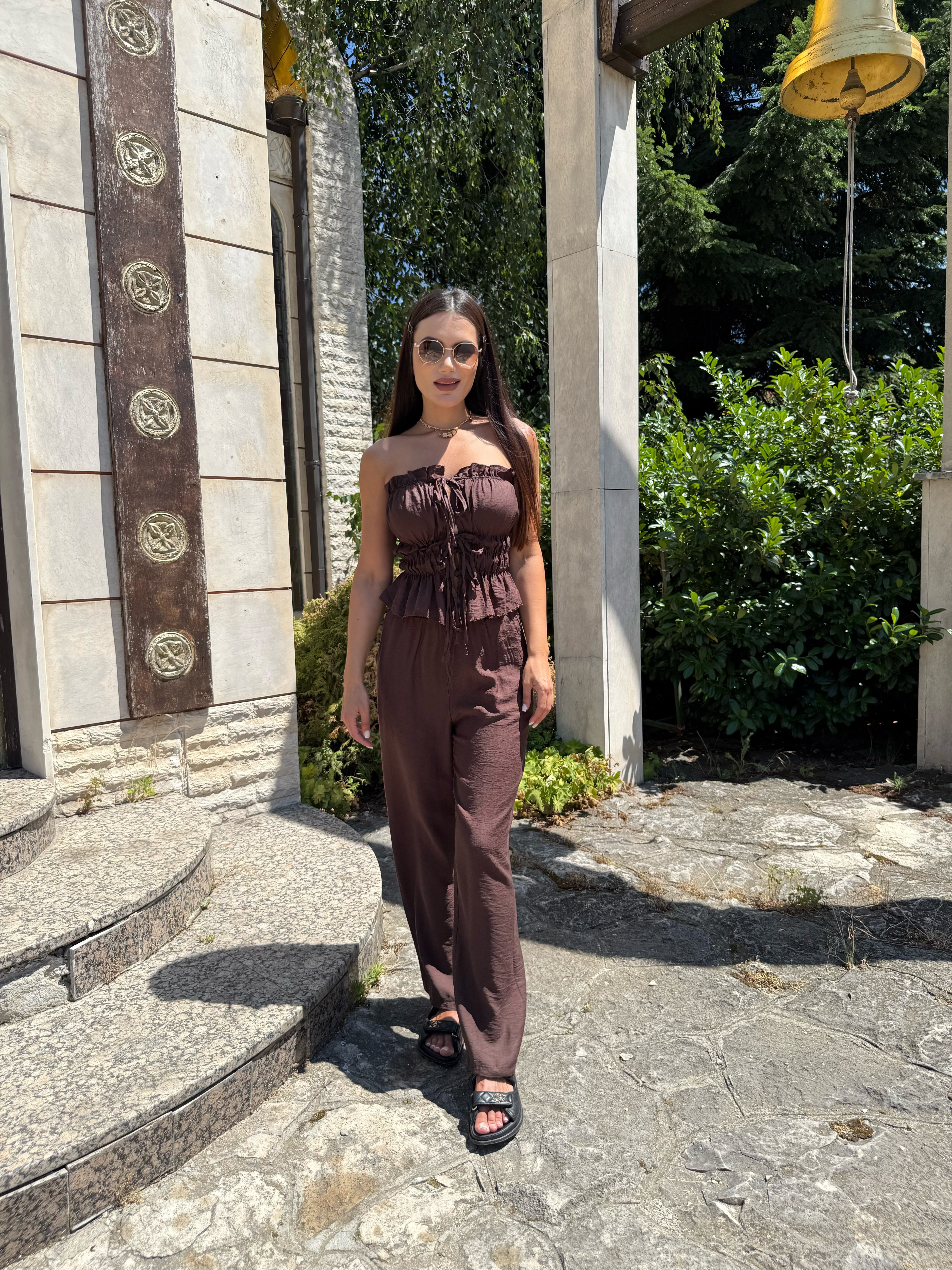 The deep and warm shade gives a sense of luxury and earthy energy, while the precise cut delicately emphasizes curves. The top with pleats and ties forms an elegant line, and the wide trousers with a high waist bring lightness and confidence.