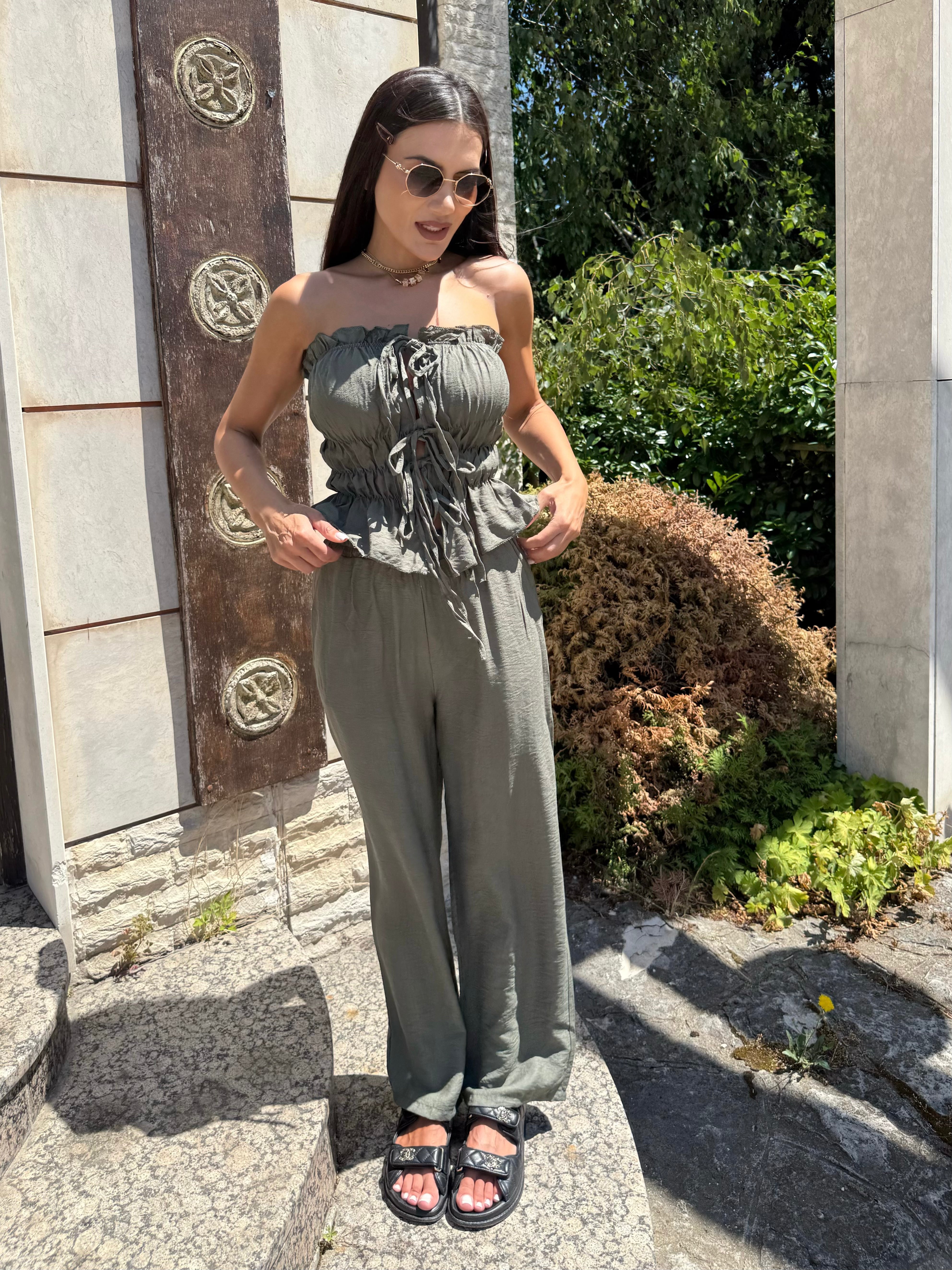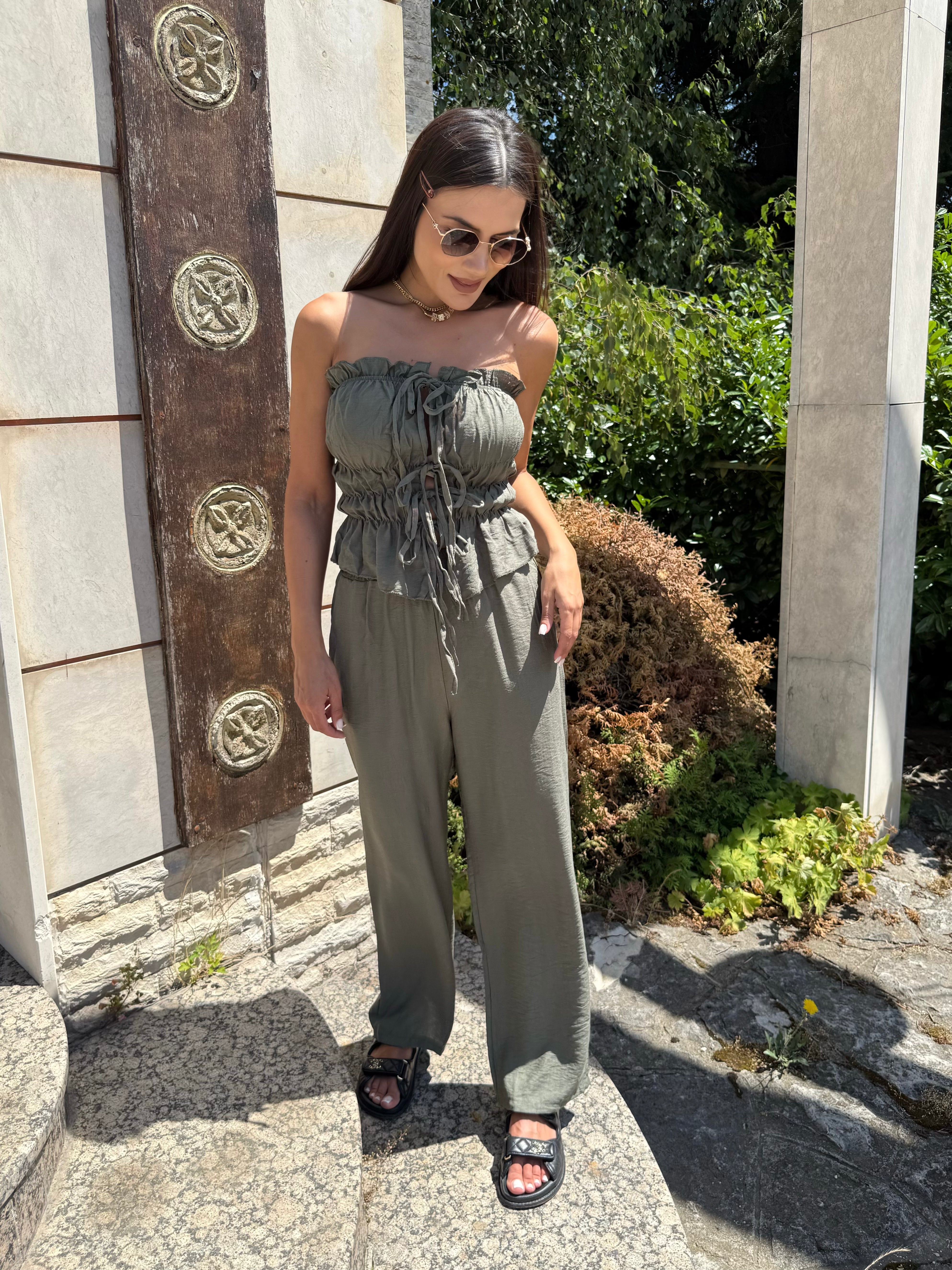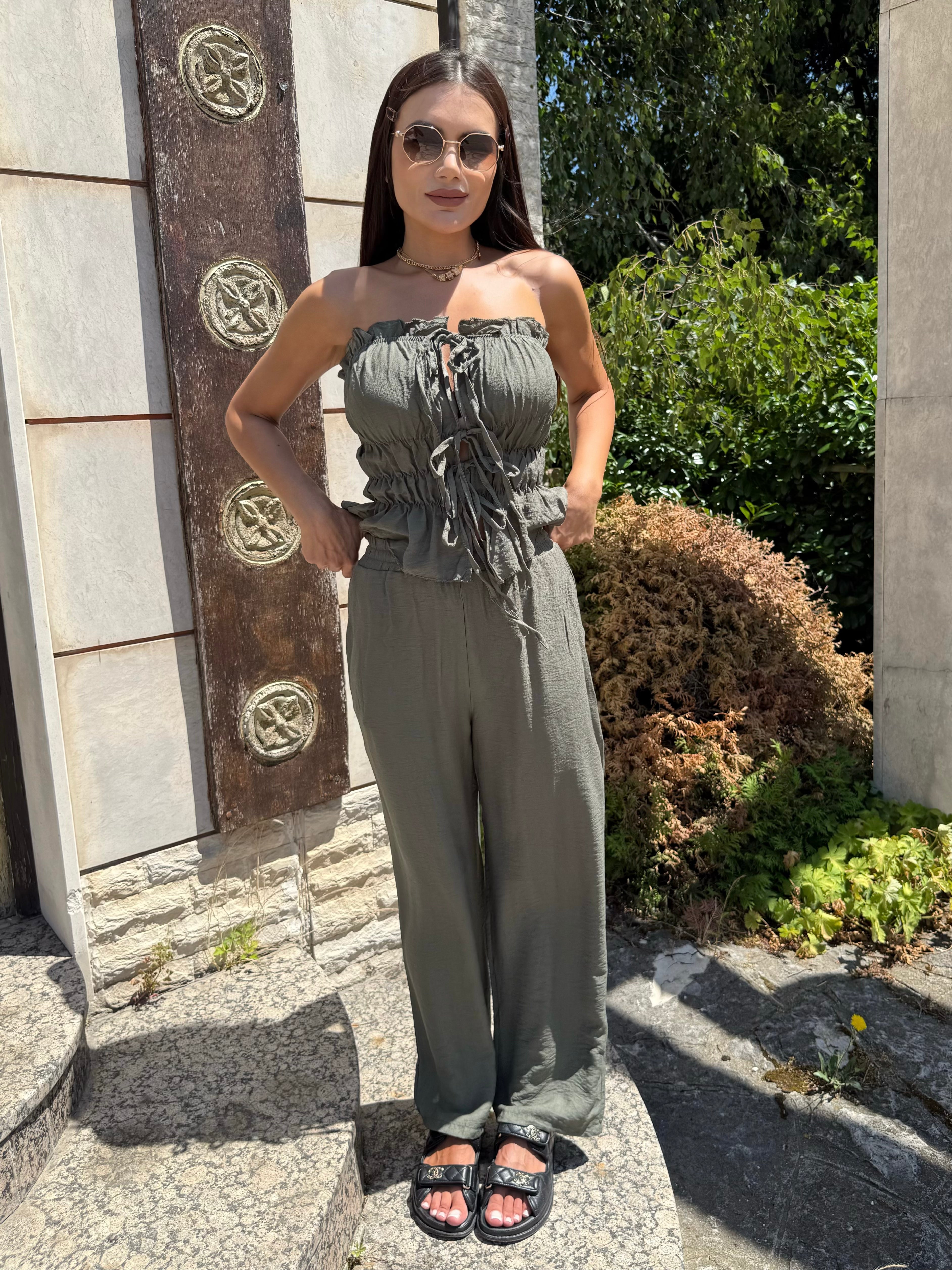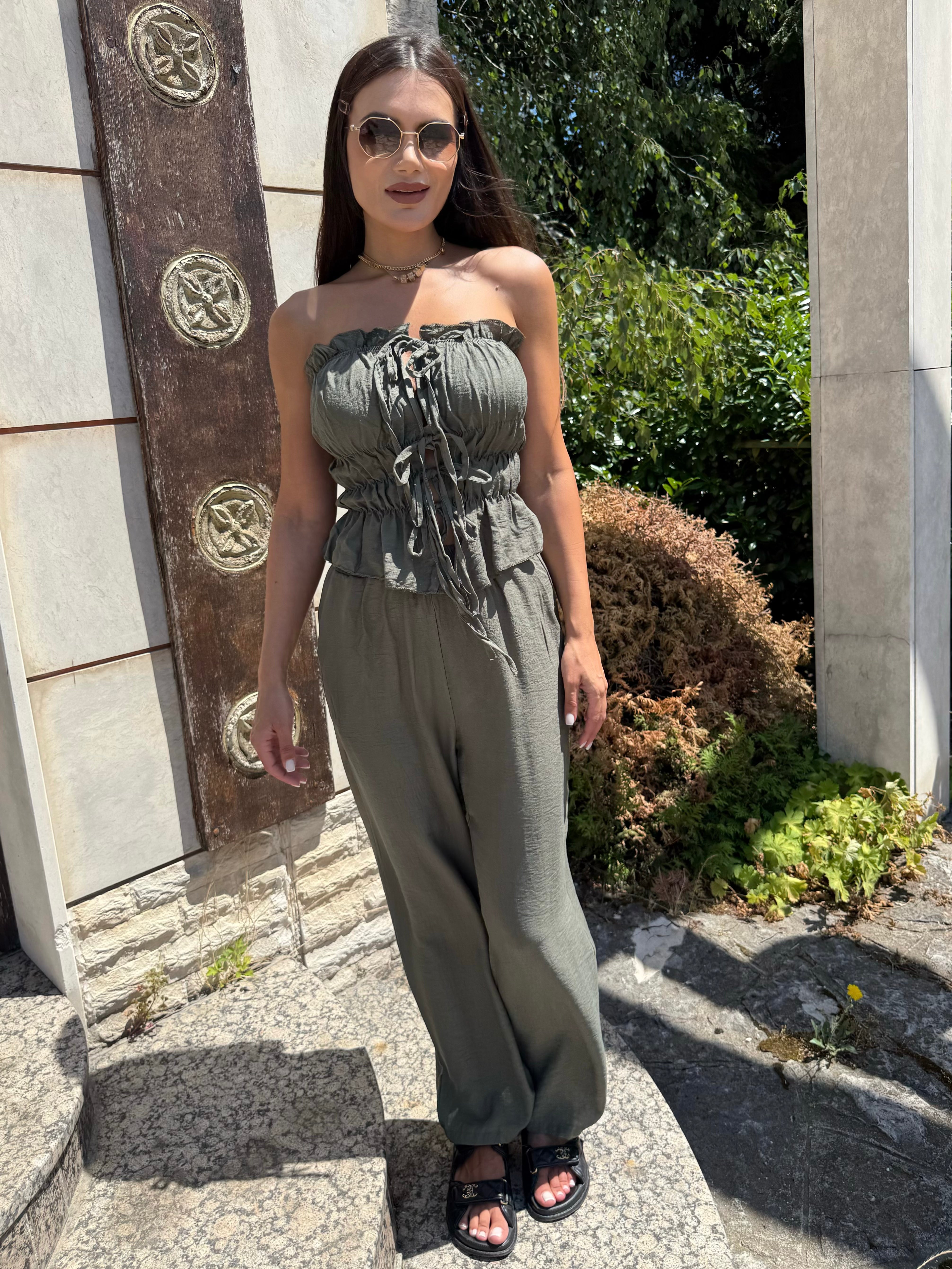 The natural tone brings a sense of relaxed elegance, and the precise cut emphasizes the figure in the most feminine way. The top with pleats and ties shapes the silhouette, while the wide, high-waisted trousers combine freedom and style.