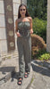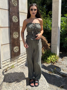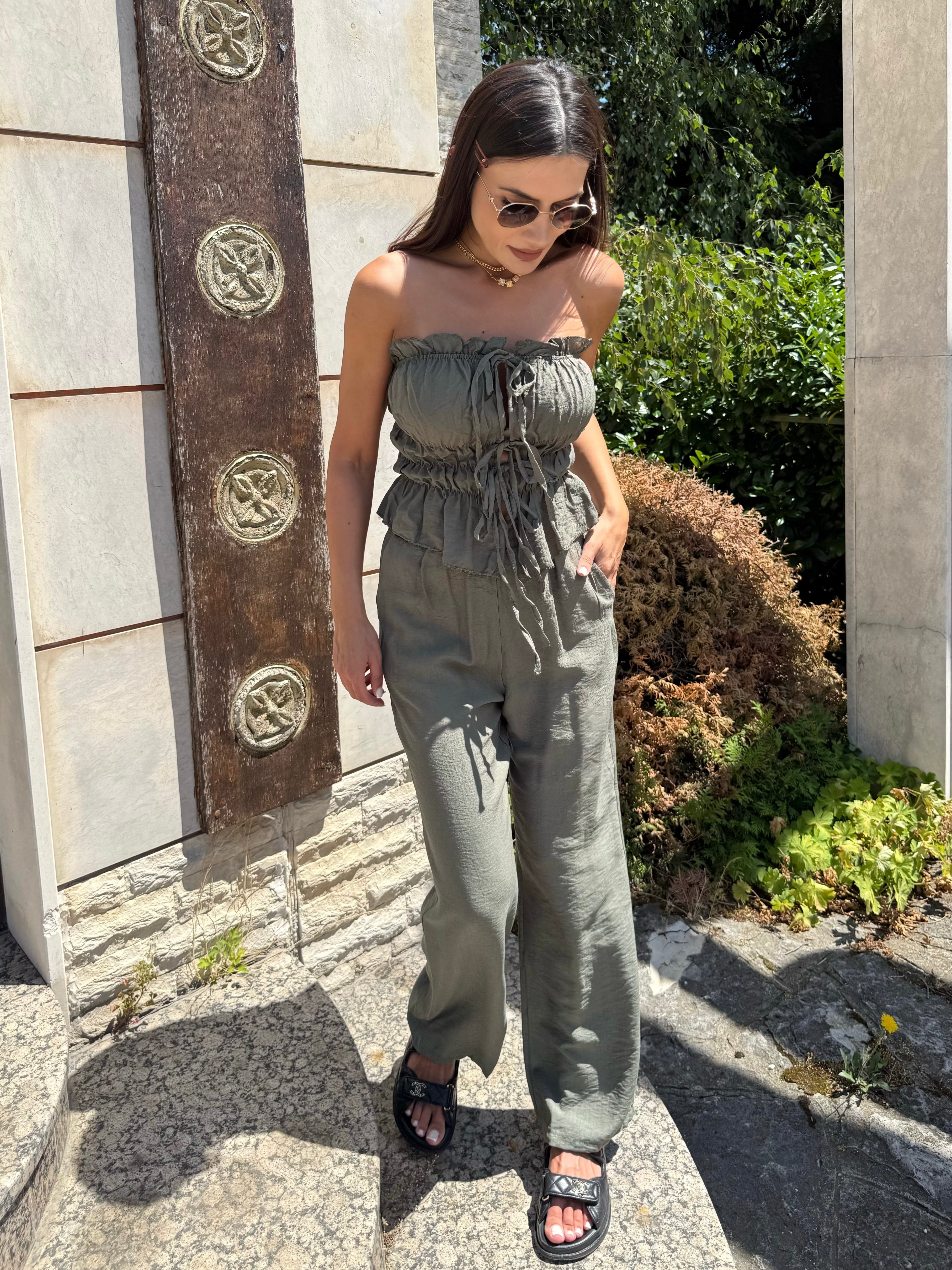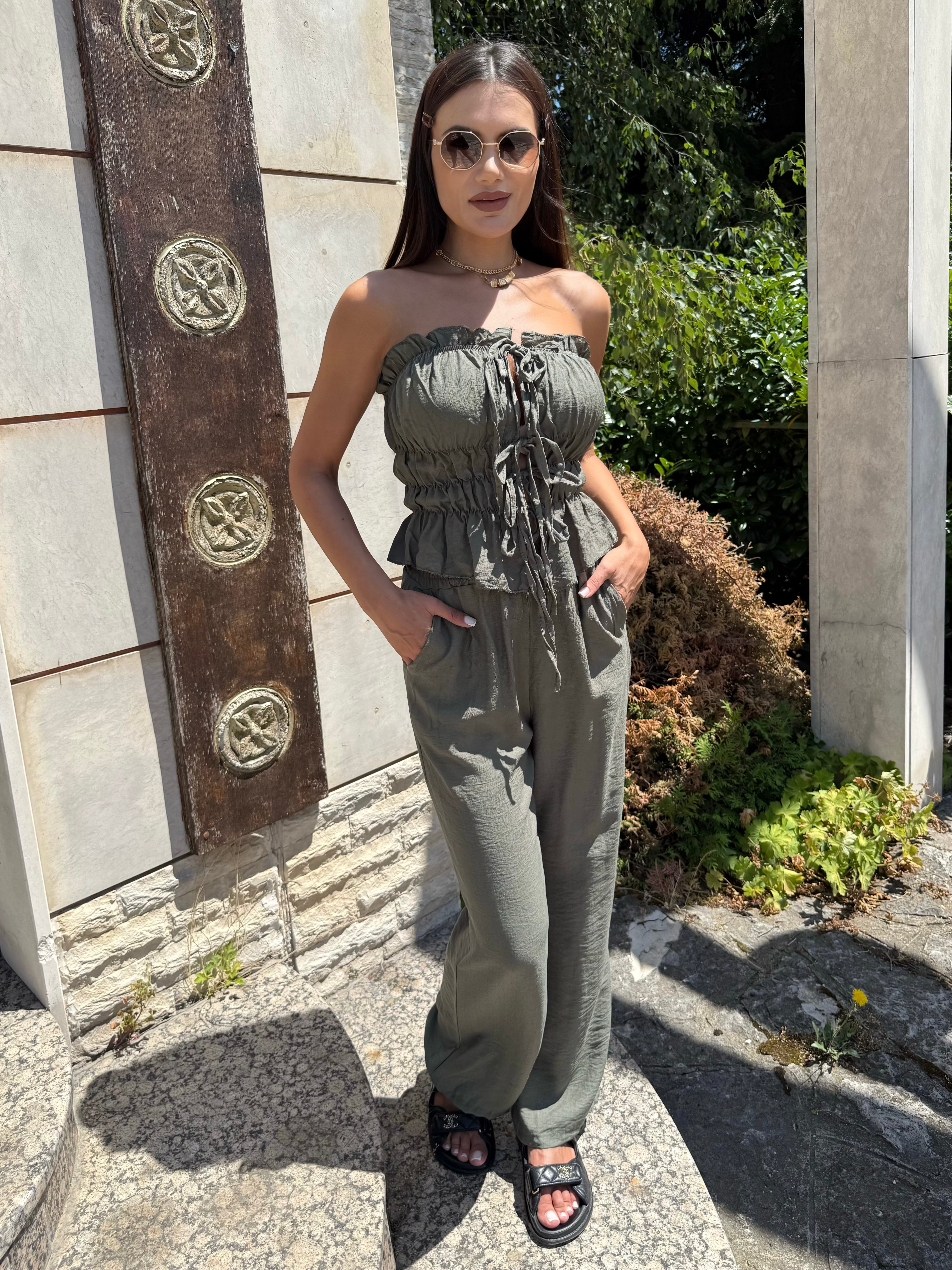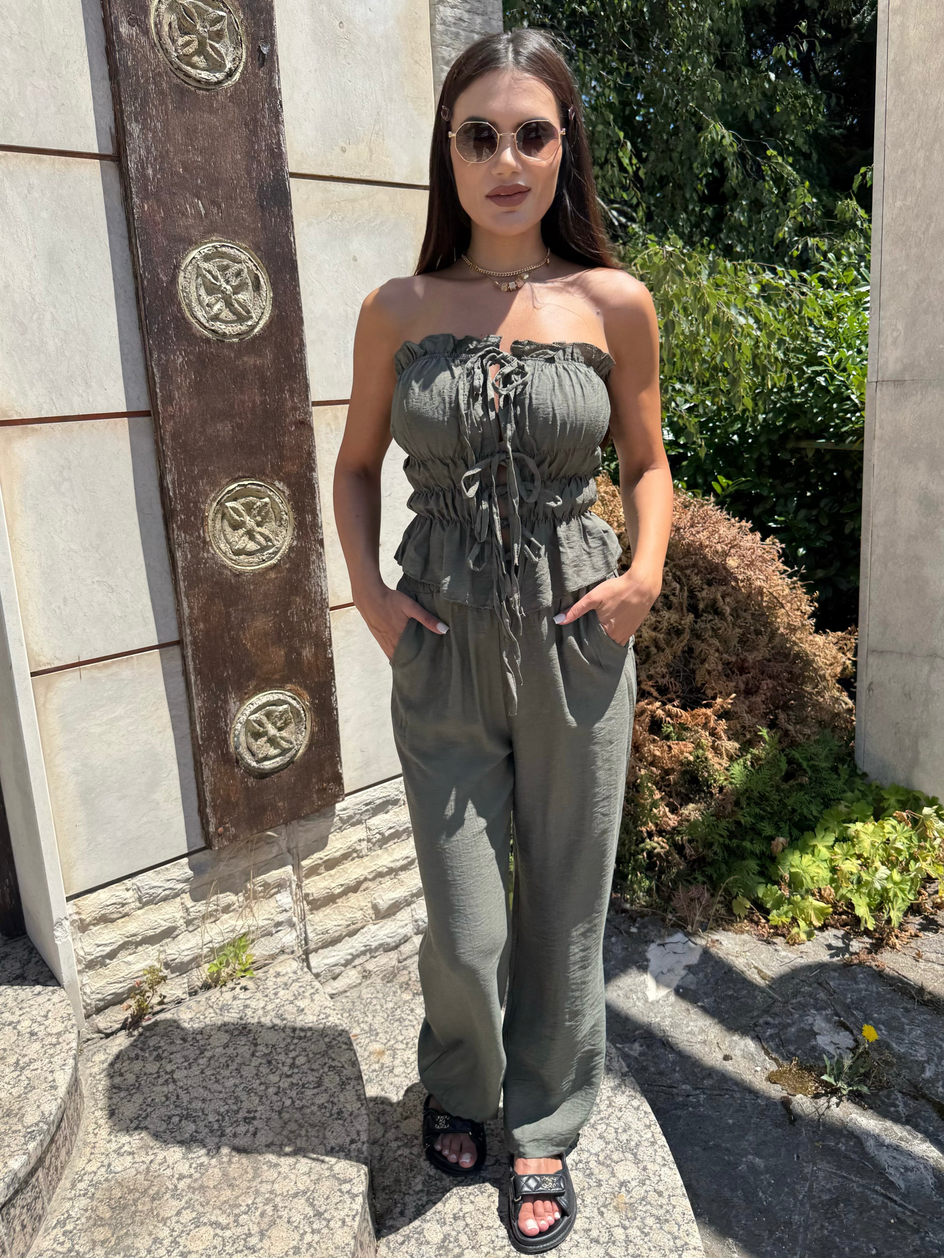 The natural tone brings a sense of relaxed elegance, and the precise cut emphasizes the figure in the most feminine way. The top with pleats and ties shapes the silhouette, while the wide, high-waisted trousers combine freedom and style.