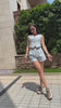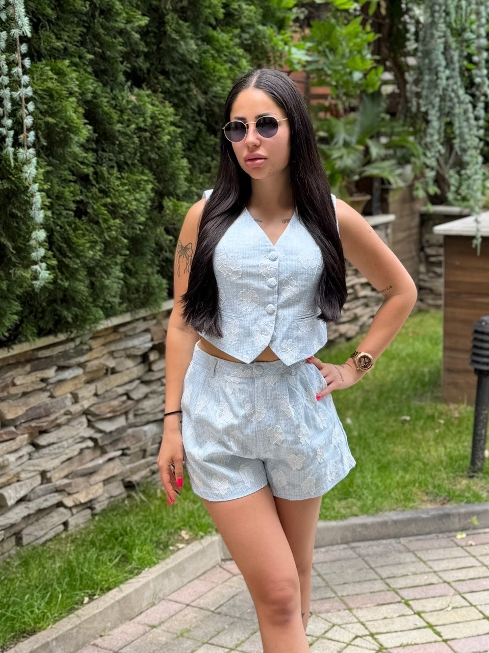 Made from a fine textured fabric with floral appliqués, this set includes a cropped vest with decorative buttons and elegant high-waisted shorts with pockets. Wear them together or combine them separately - you'll always look chic.