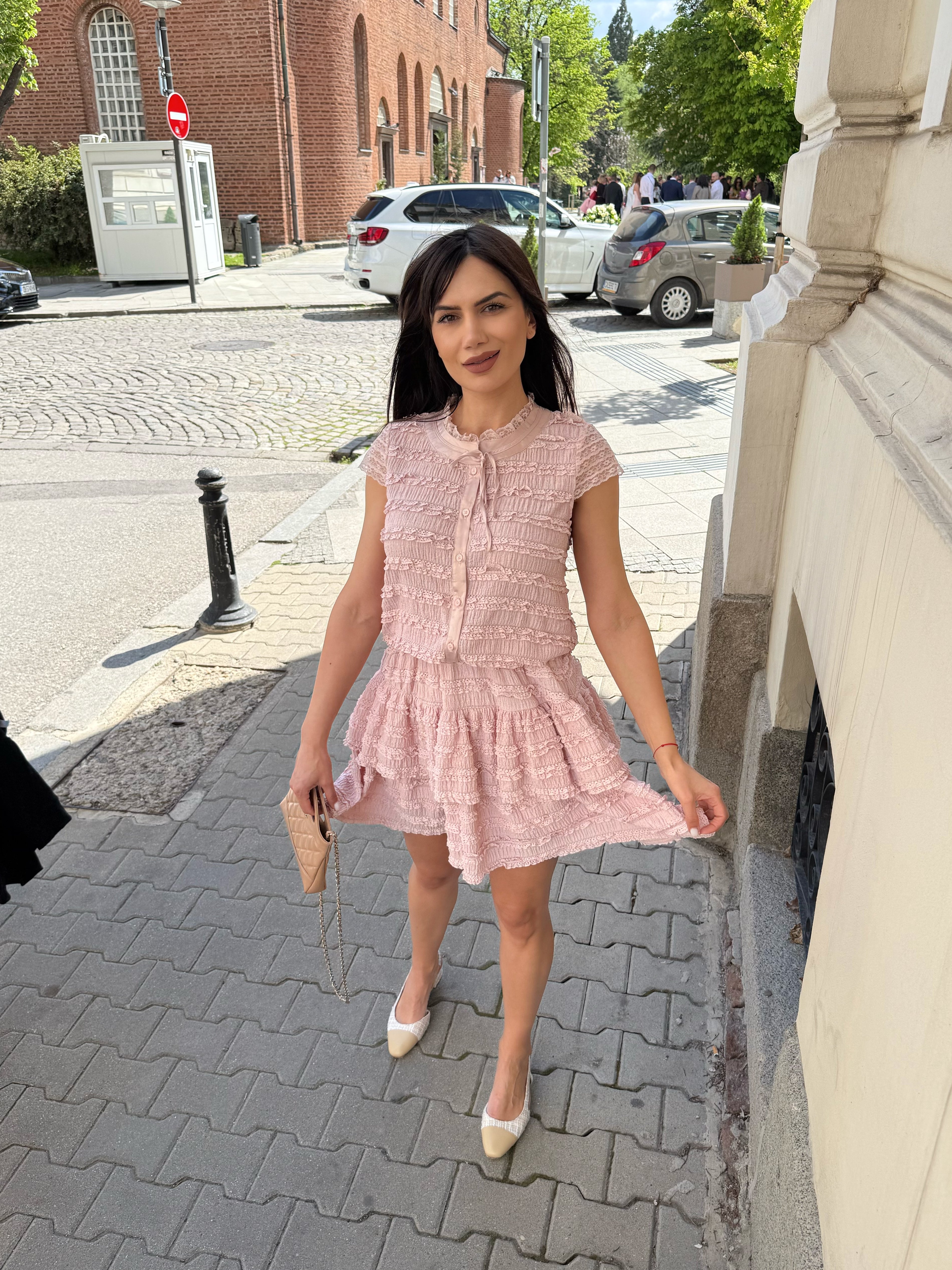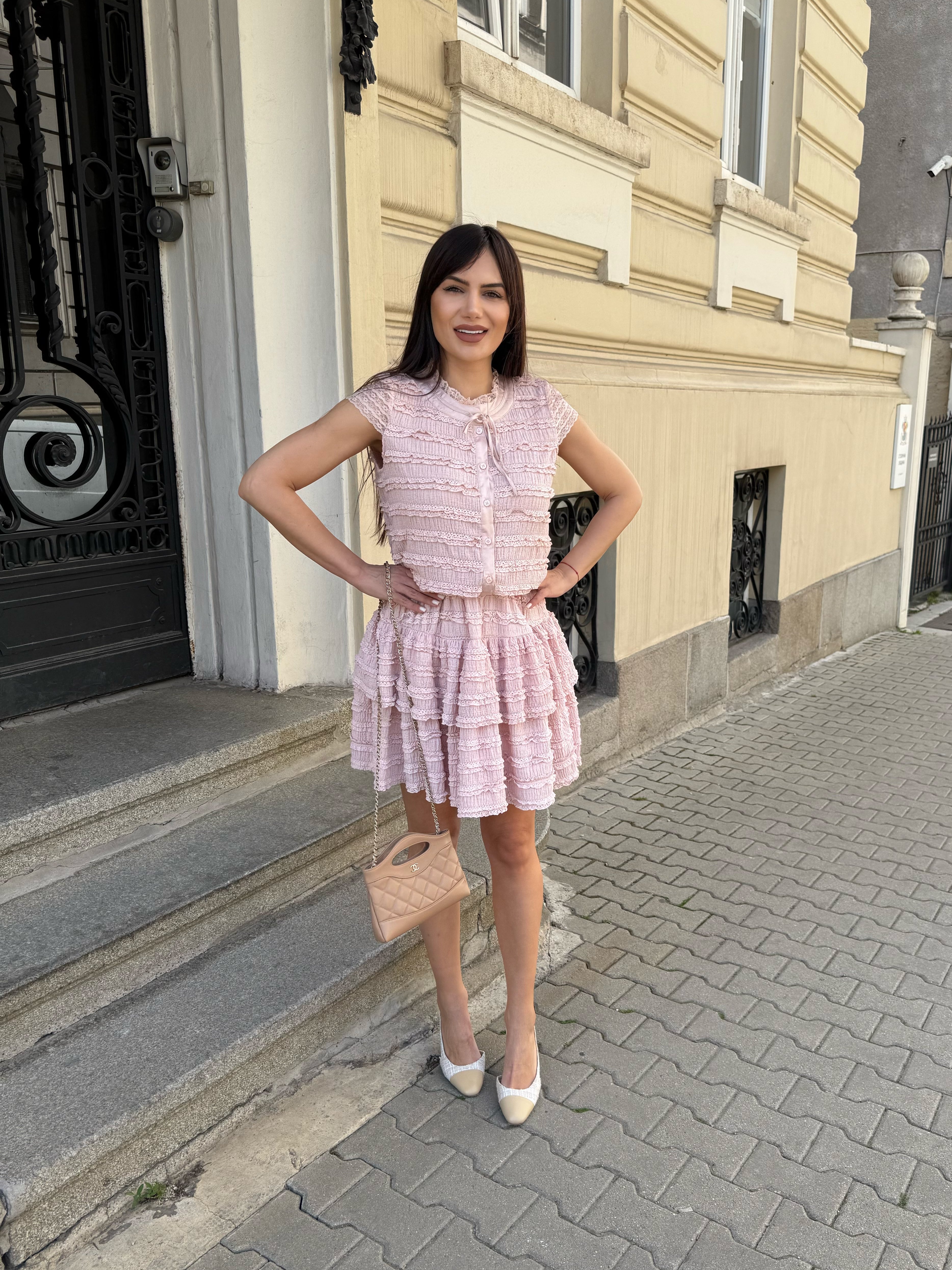 Delicate and stylish MONICA SET in two pieces, sleeveless SHIRT with front fastening and high-waisted SKIRT.