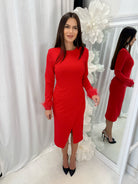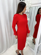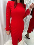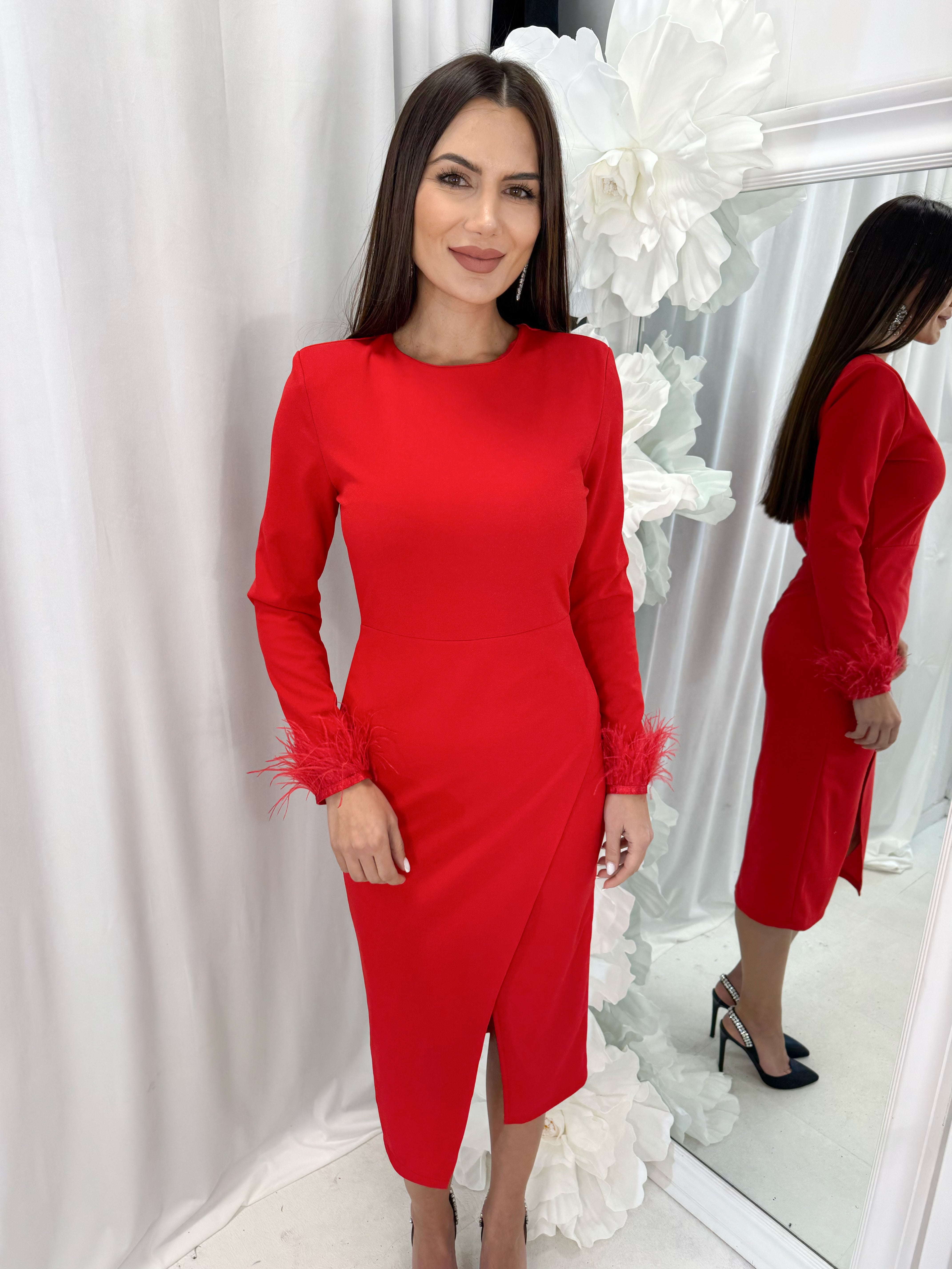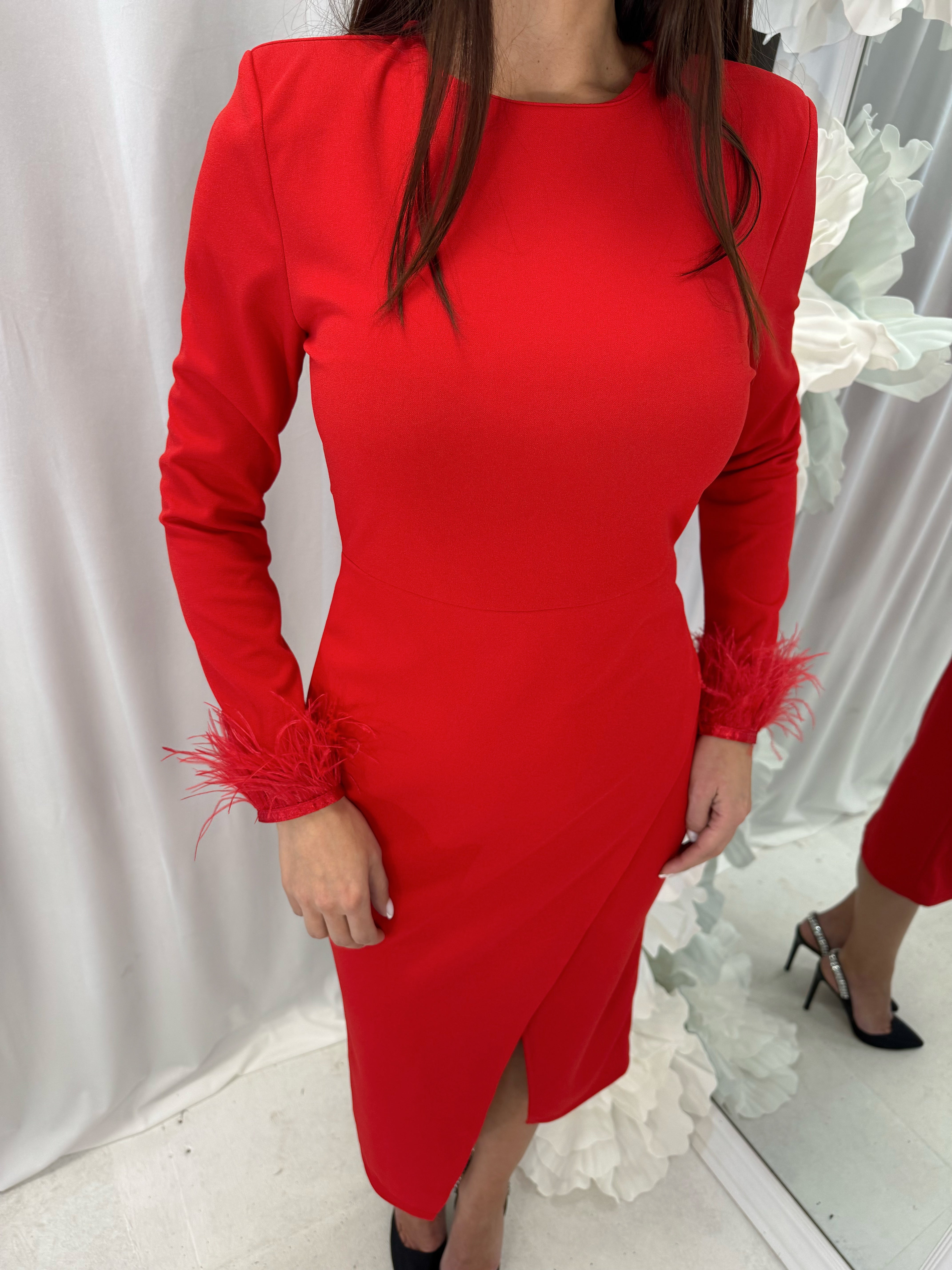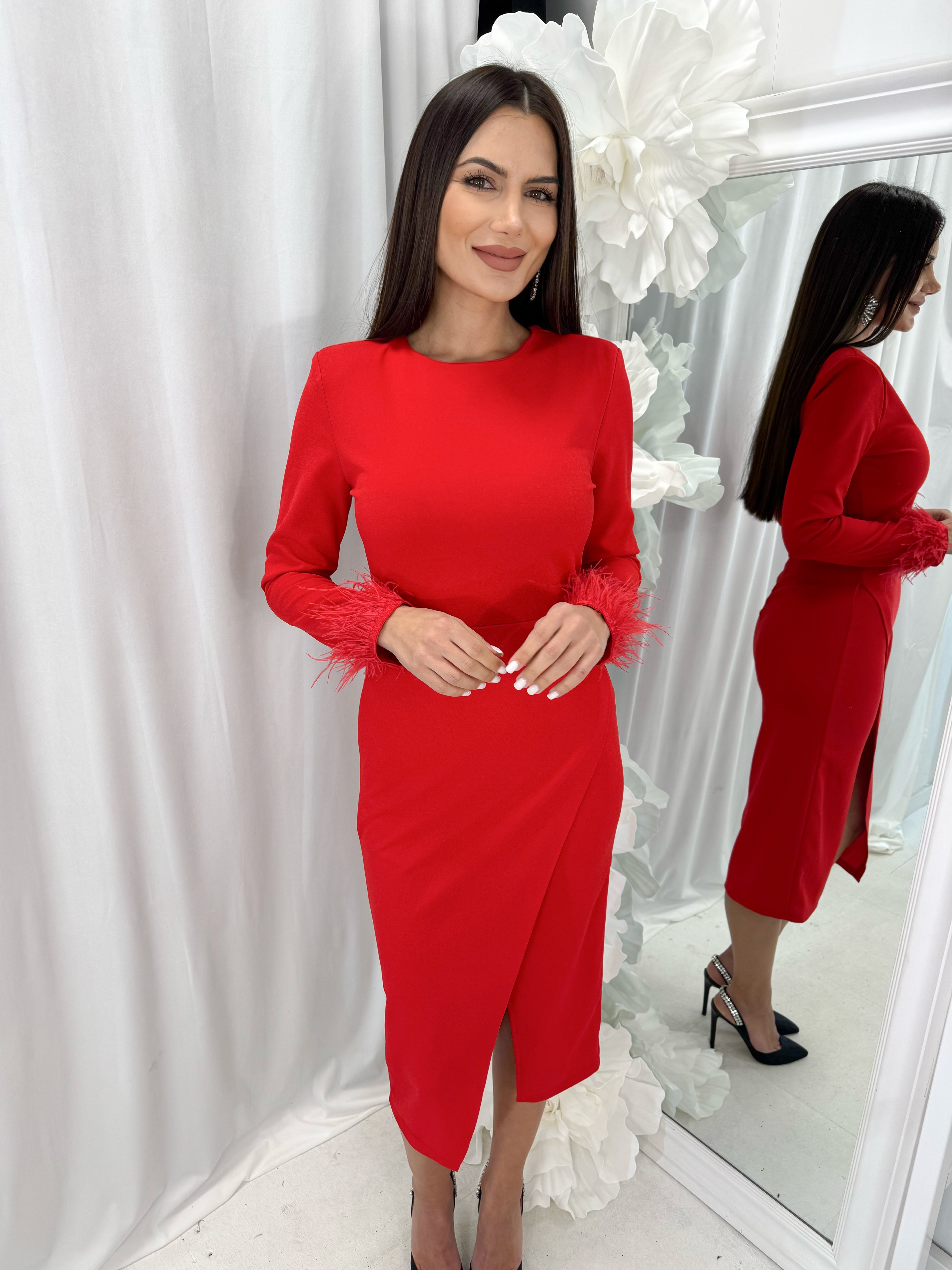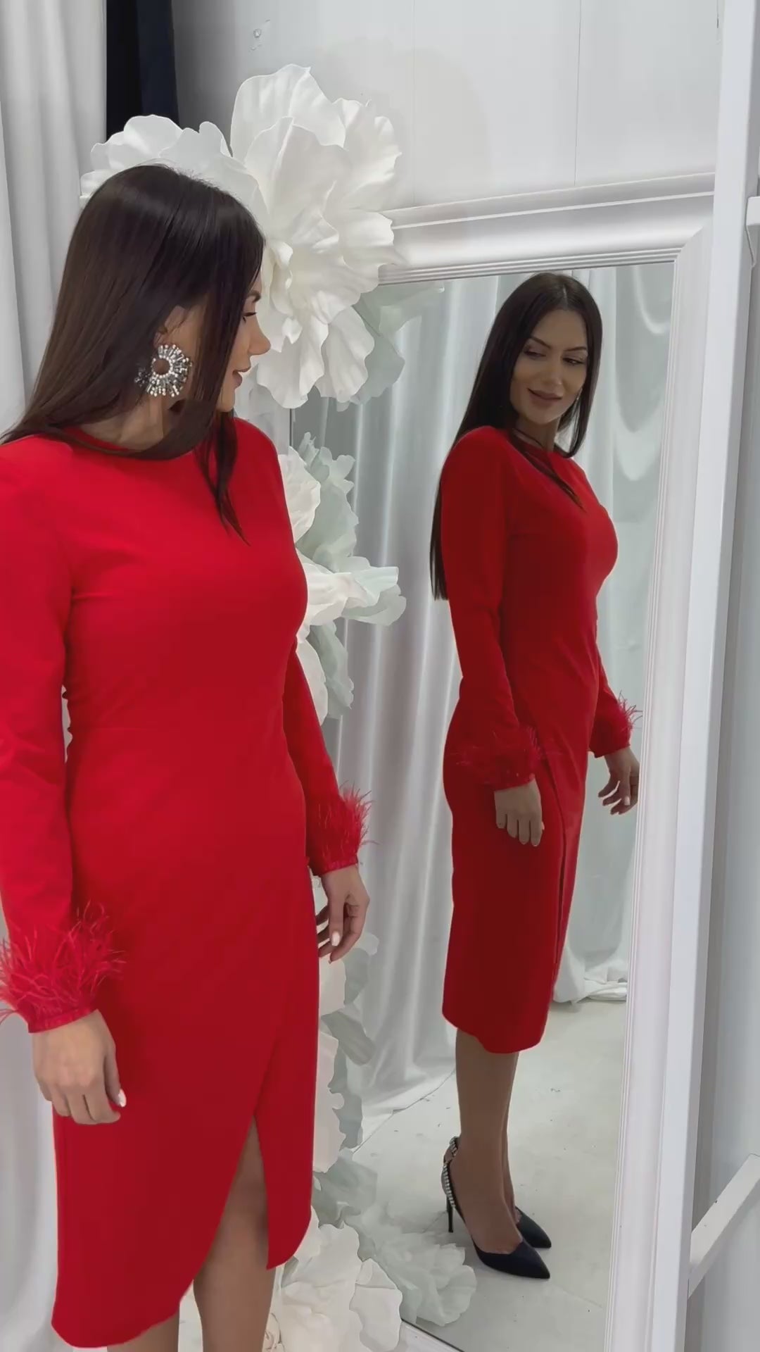 Long DRESS with a spectacular slit and feathers on the wrists.