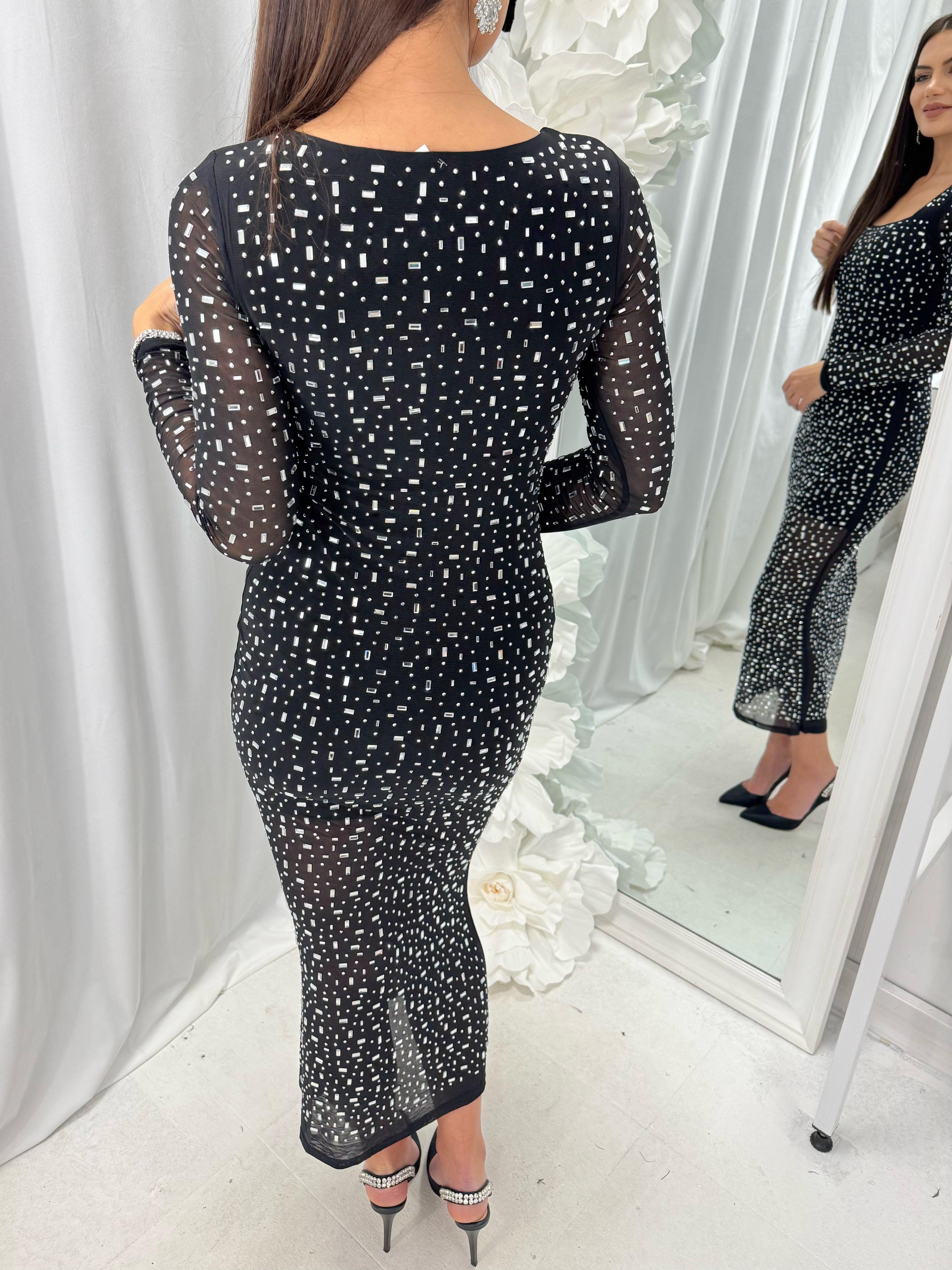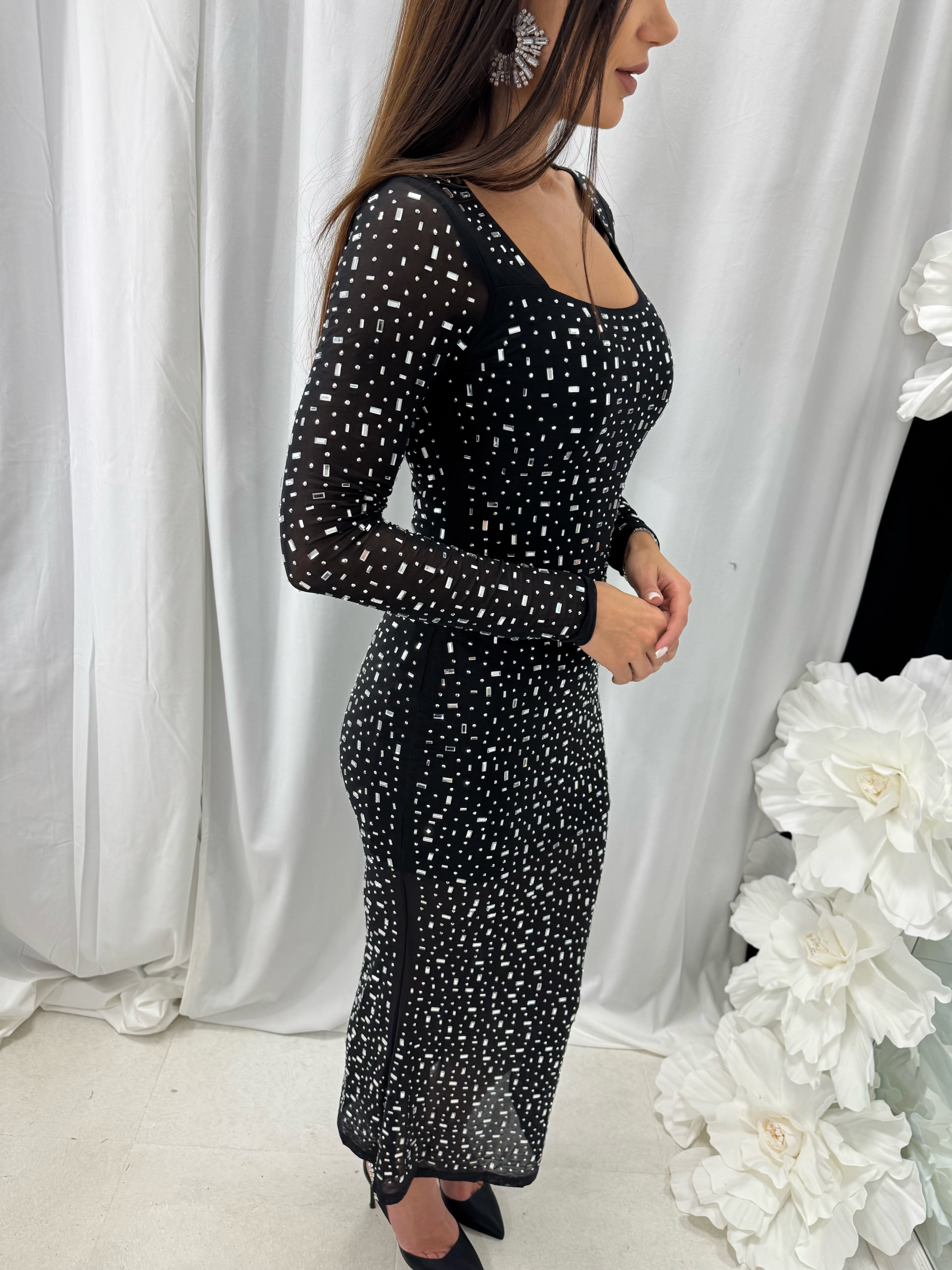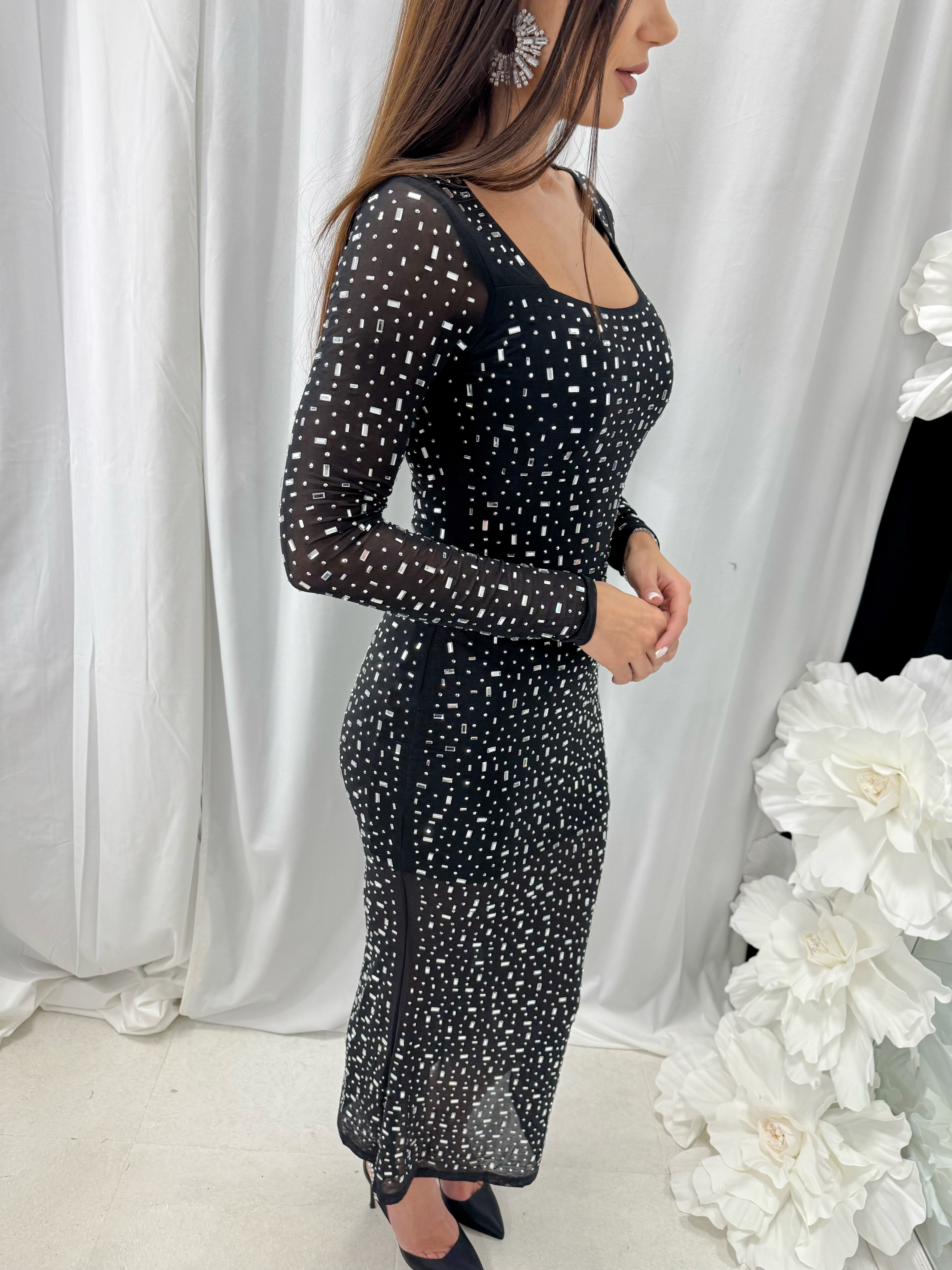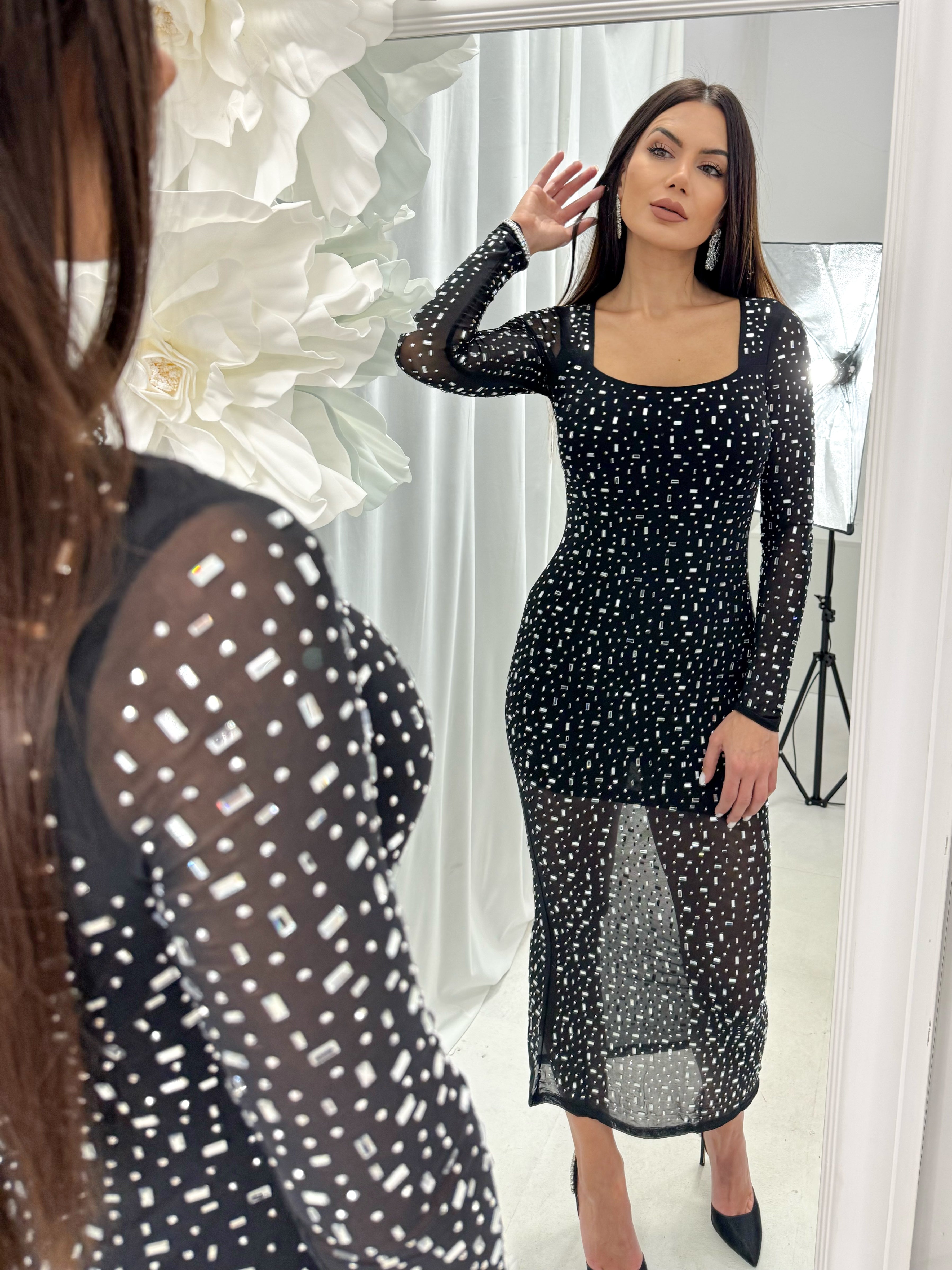 Long DIAMOND DRESS with spectacular sparkling stones in the front and back. The material is made of elastic tulle. The inner part has a short lining. The model is available in one size - S