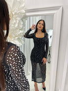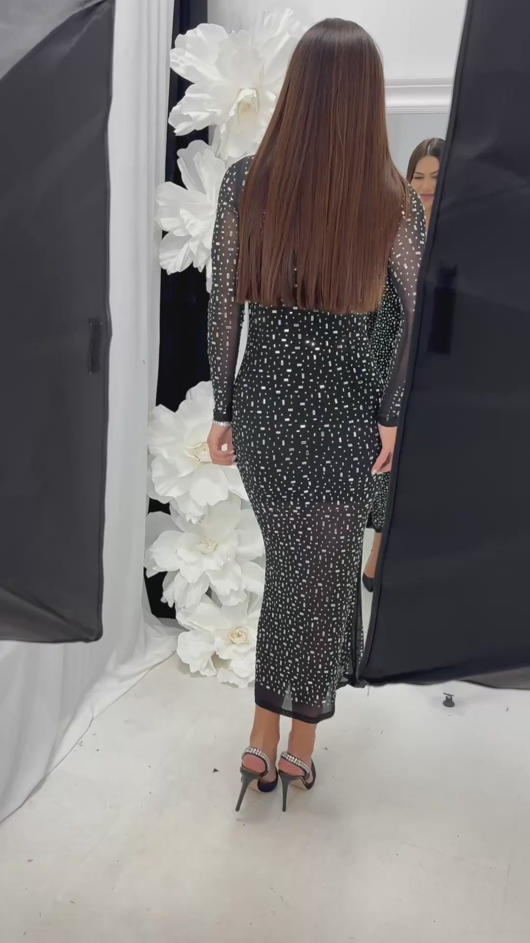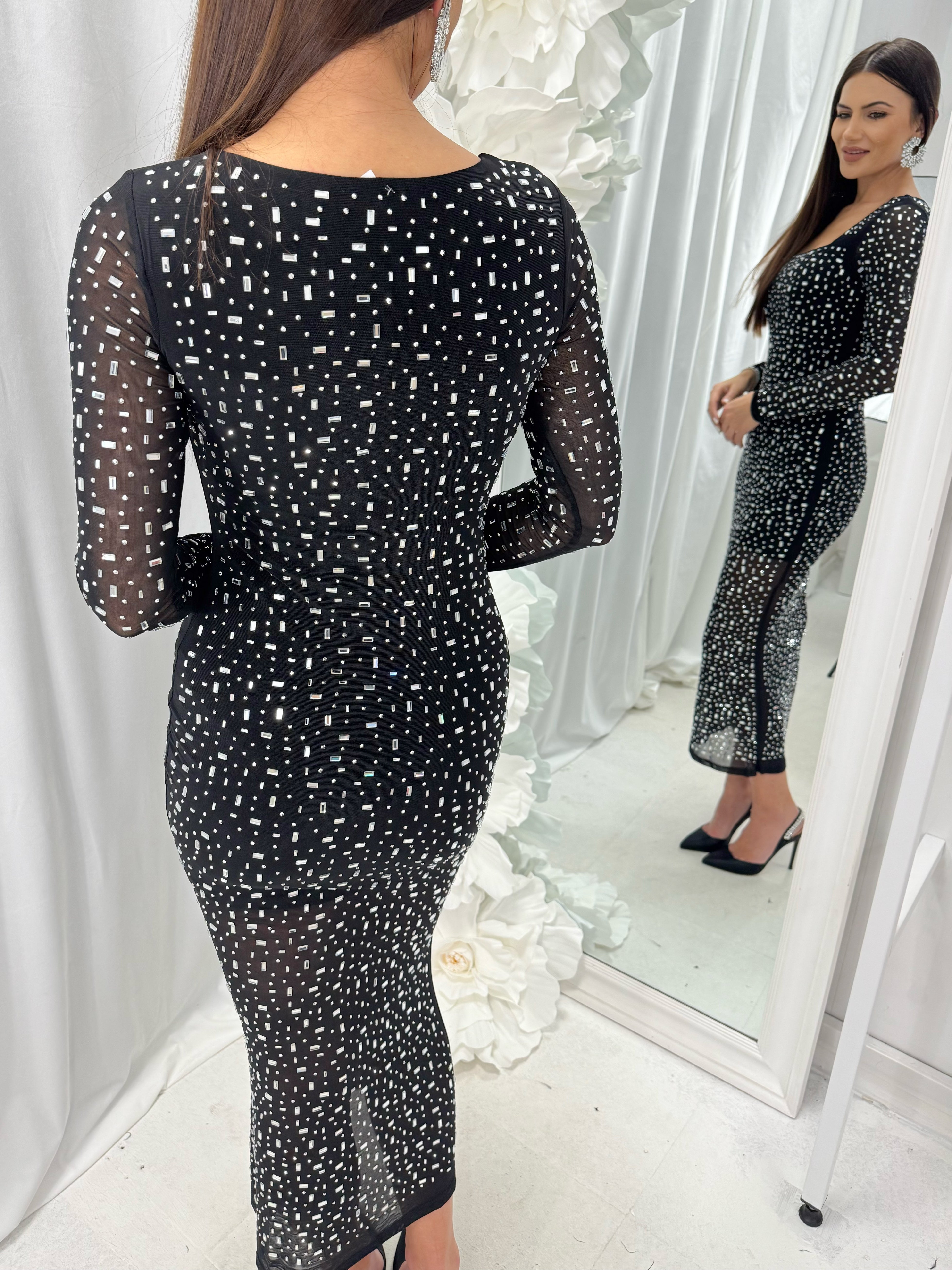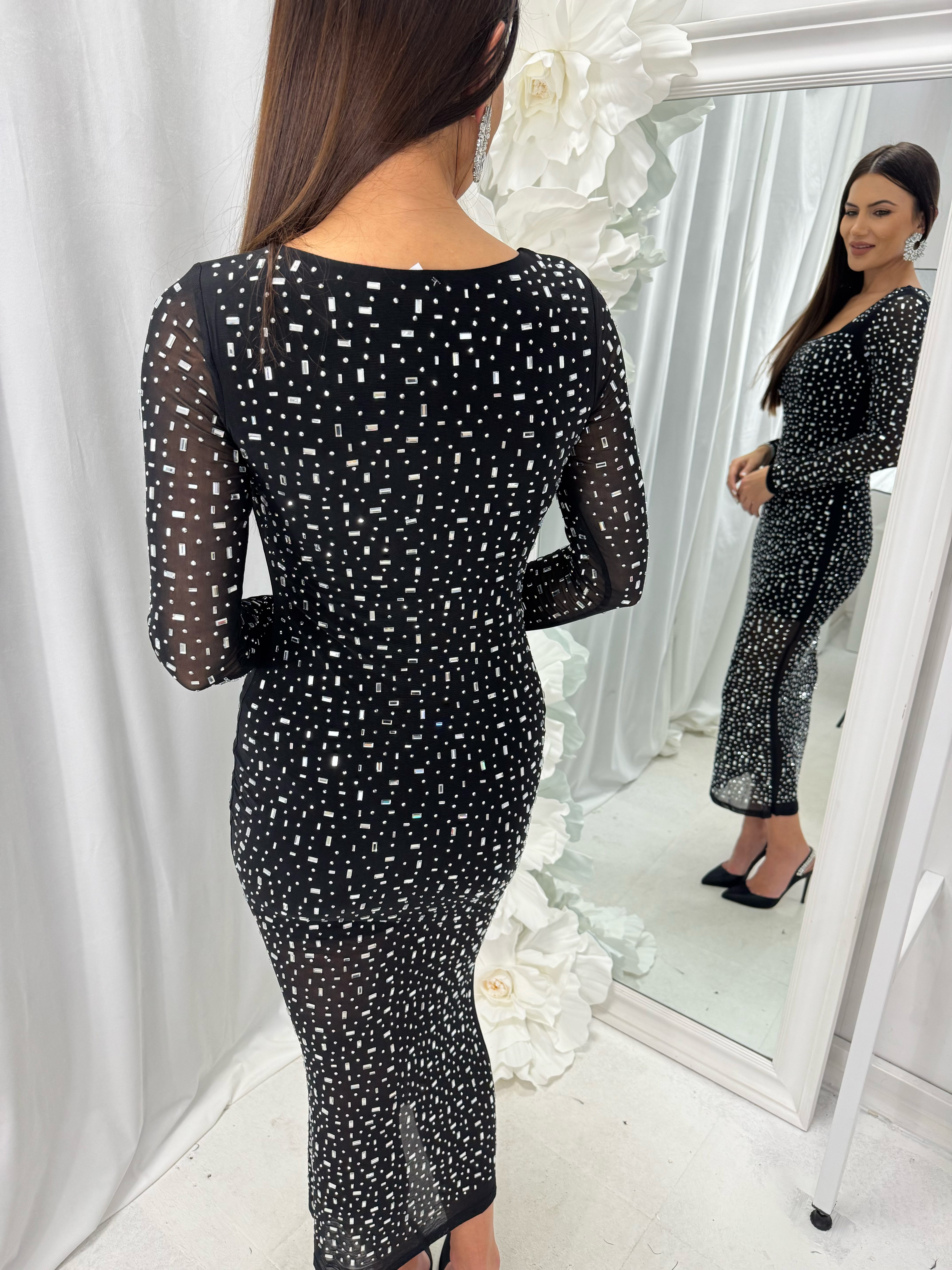 Long DIAMOND DRESS with spectacular sparkling stones in the front and back. The material is made of elastic tulle. The inner part has a short lining. The model is available in one size - S