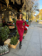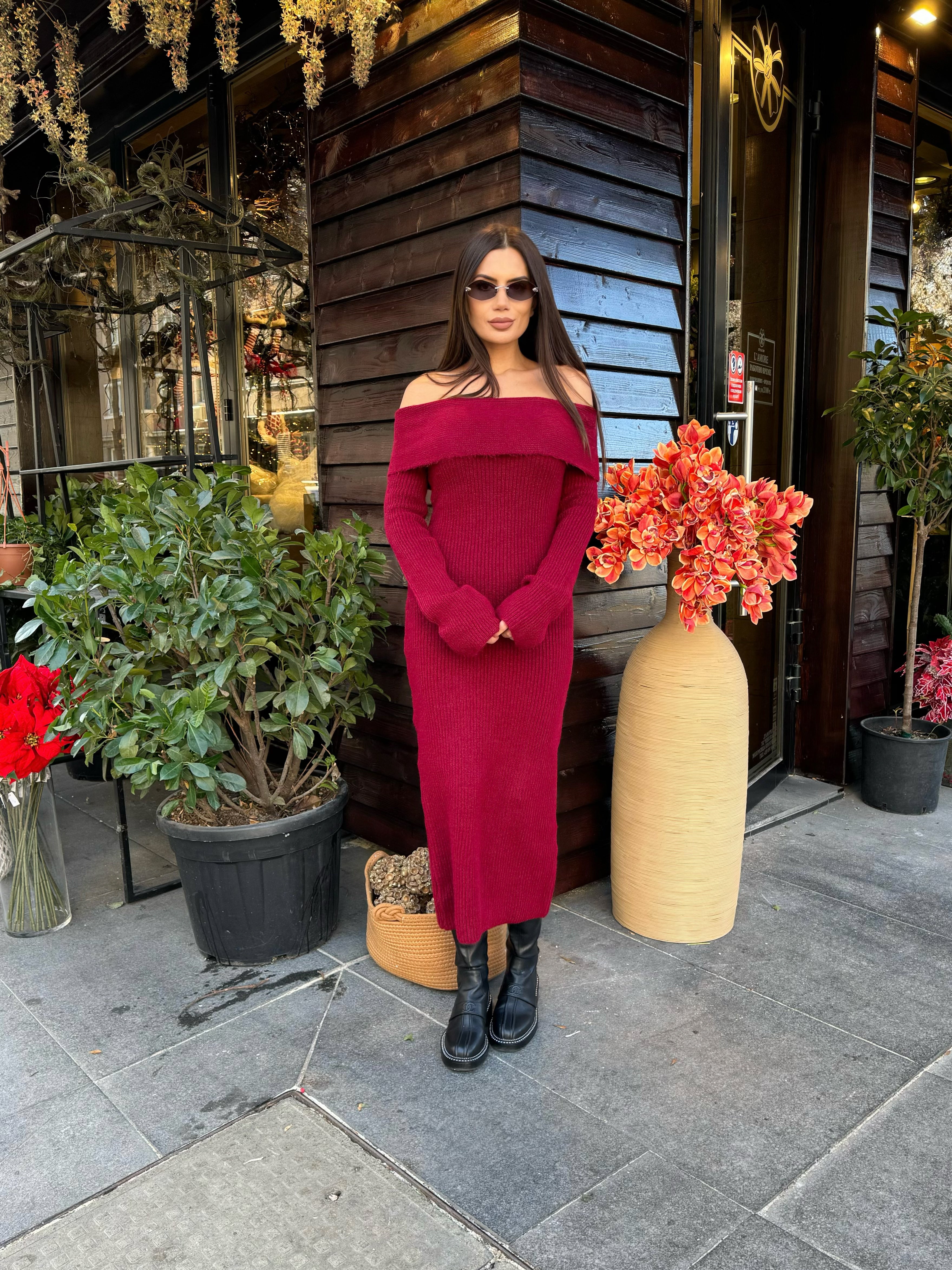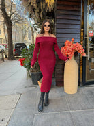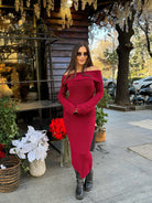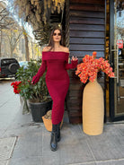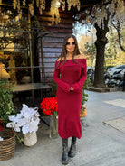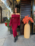 The off-shoulder neckline adds a touch of sensuality, while the elongated silhouette enhances the figure with a refined balance between comfort and glamour.