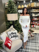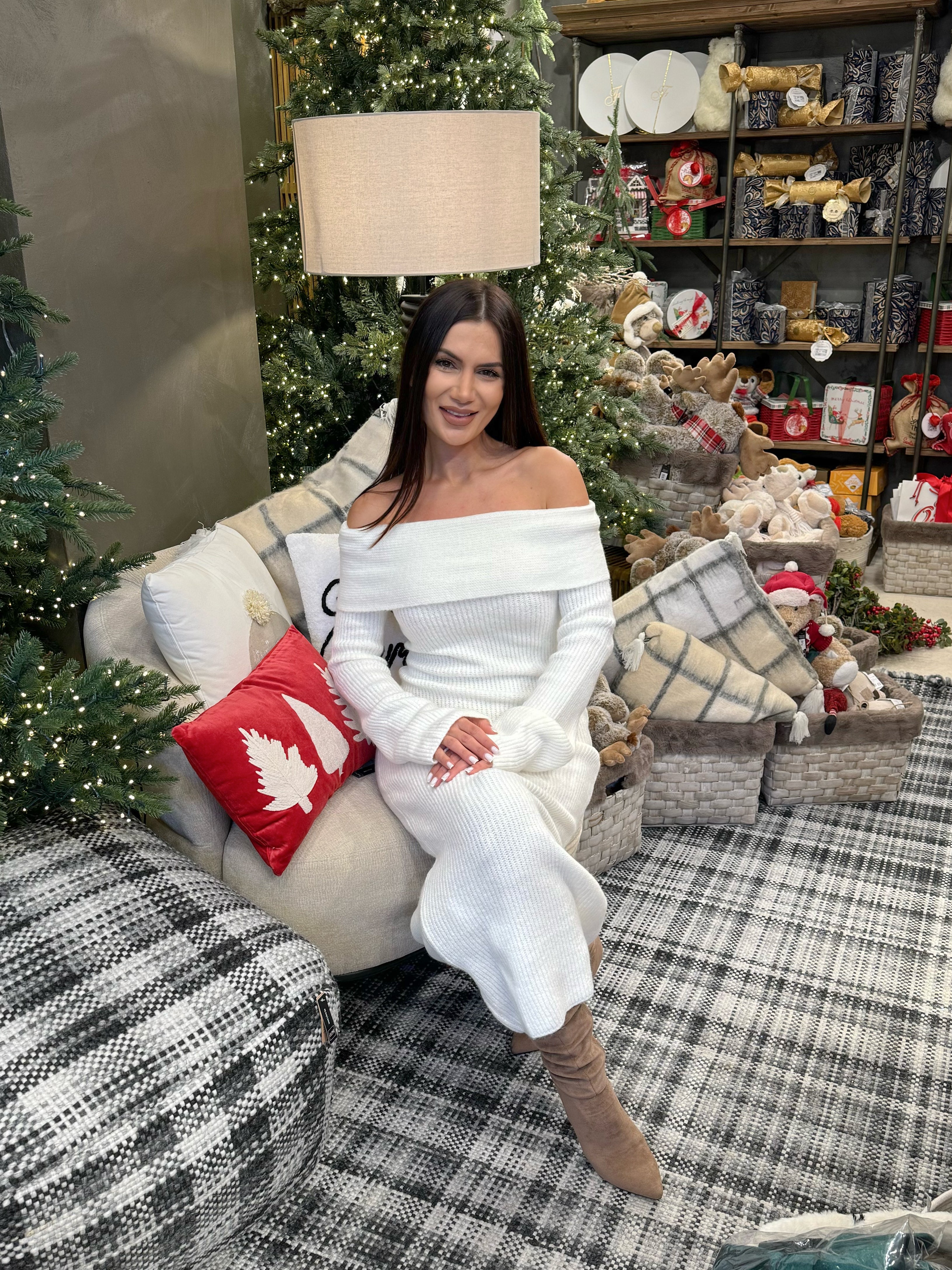 The off-shoulder neckline adds a touch of sensuality, while the elongated silhouette enhances the figure with a refined balance between comfort and glamour.