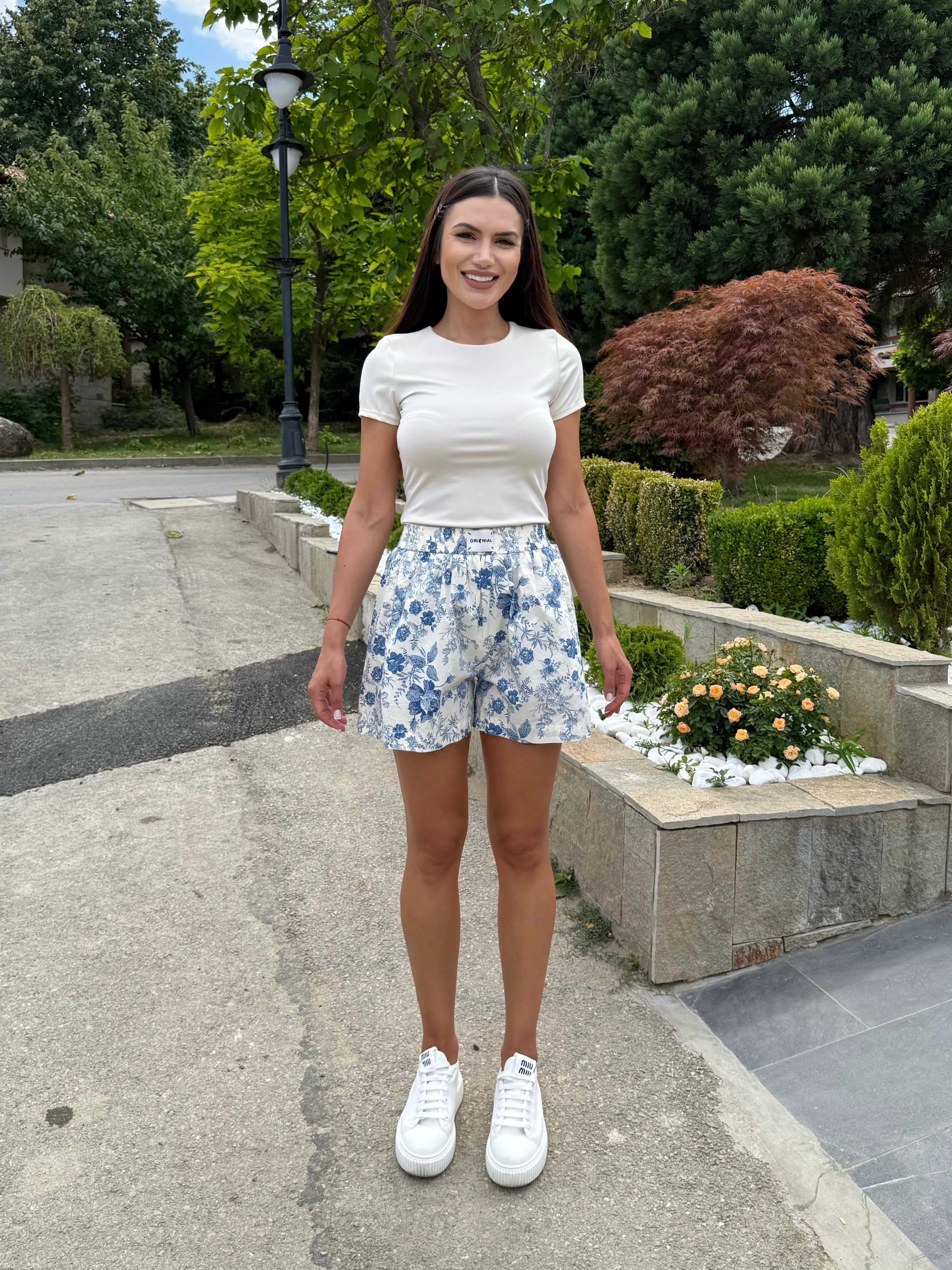 Freshness and romance in one! FLOWER BLUE is a model of shorts with a sophisticated floral print in white and blue. Made of soft cotton, they combine comfort and femininity - perfect for hot summer days.