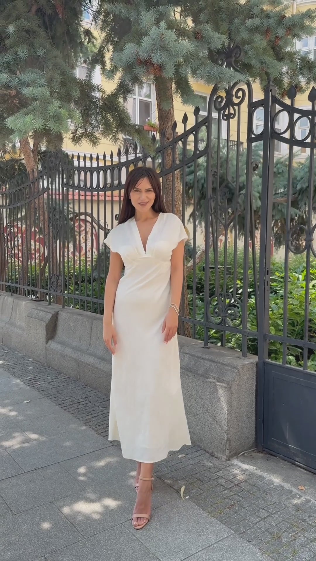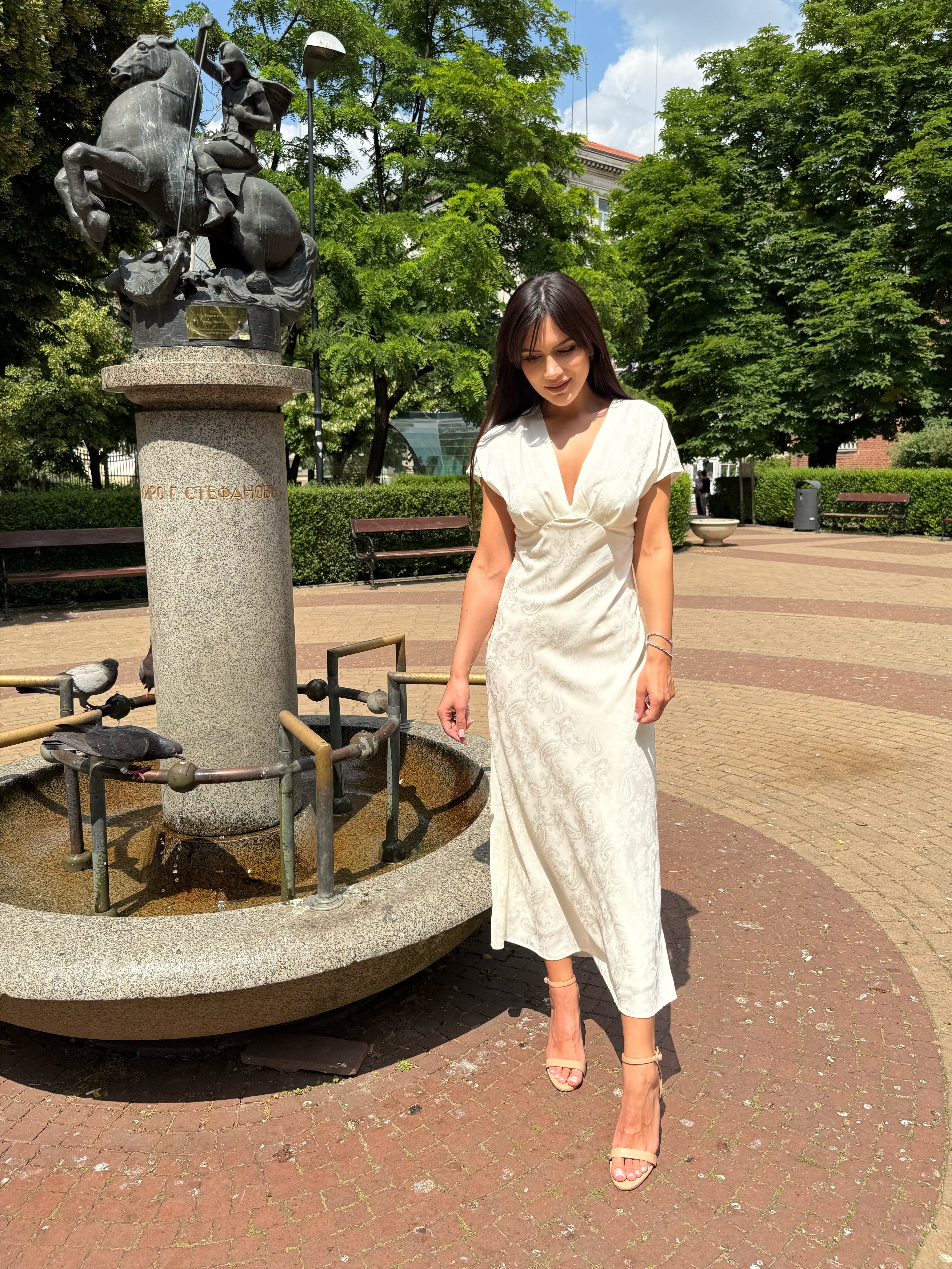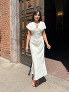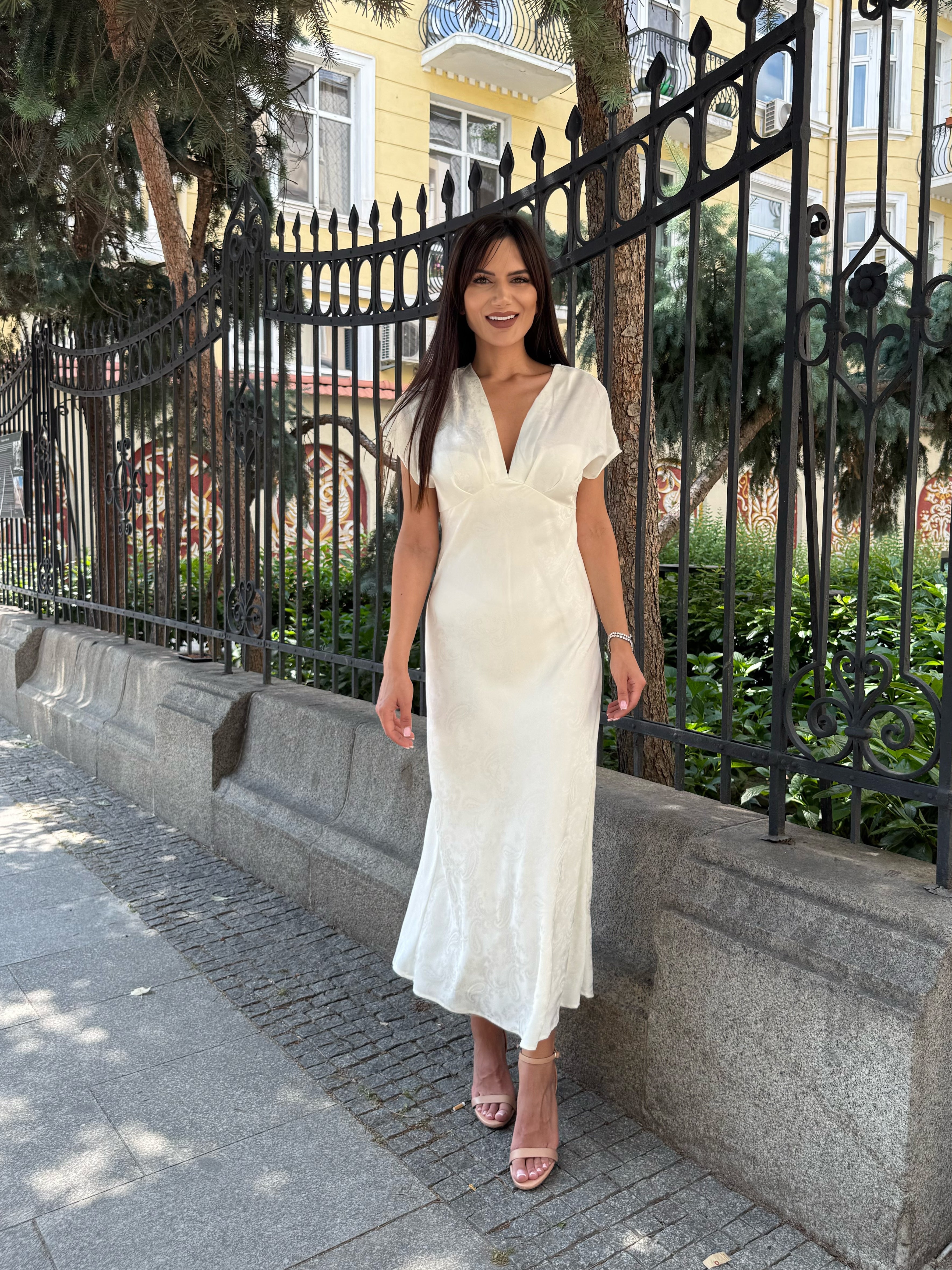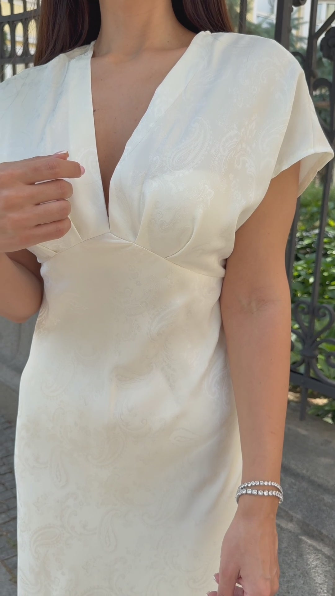 A sophisticated satin dress with a delicate embossed pattern and an elegant V-neckline. A perfect choice for formal events, evening outings or special occasions.