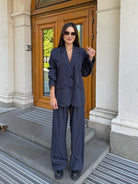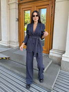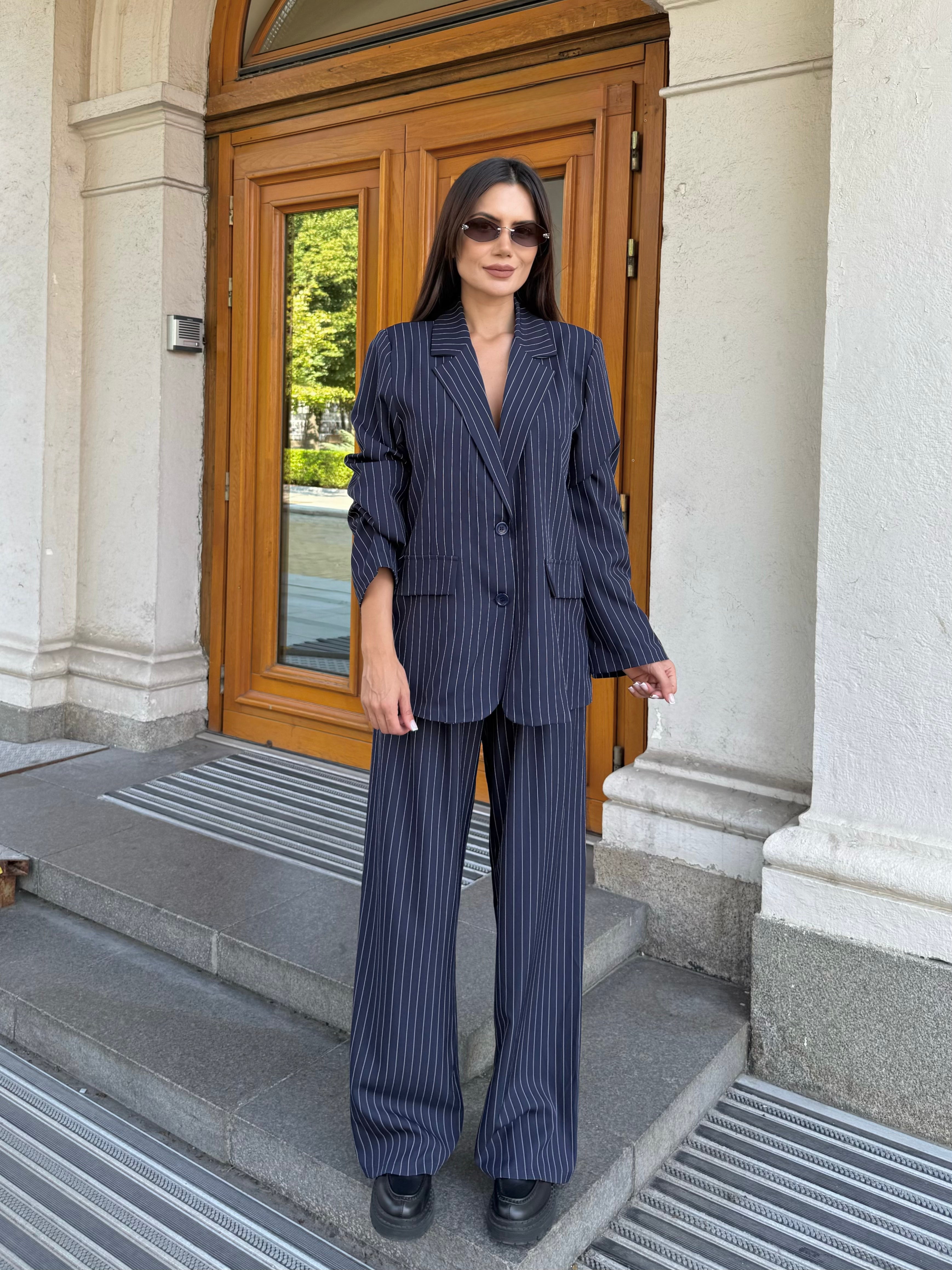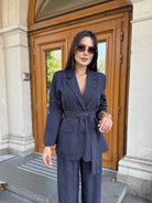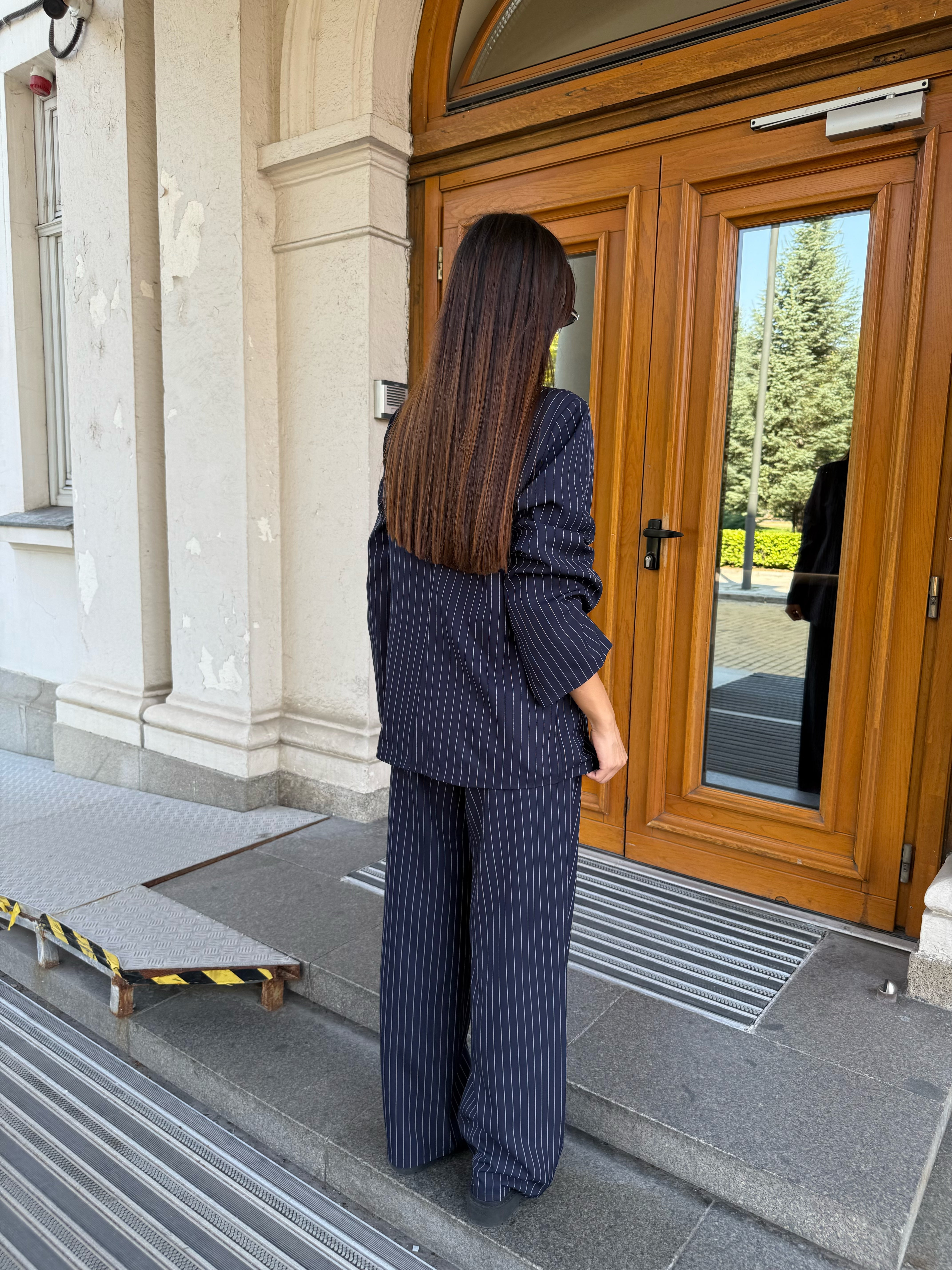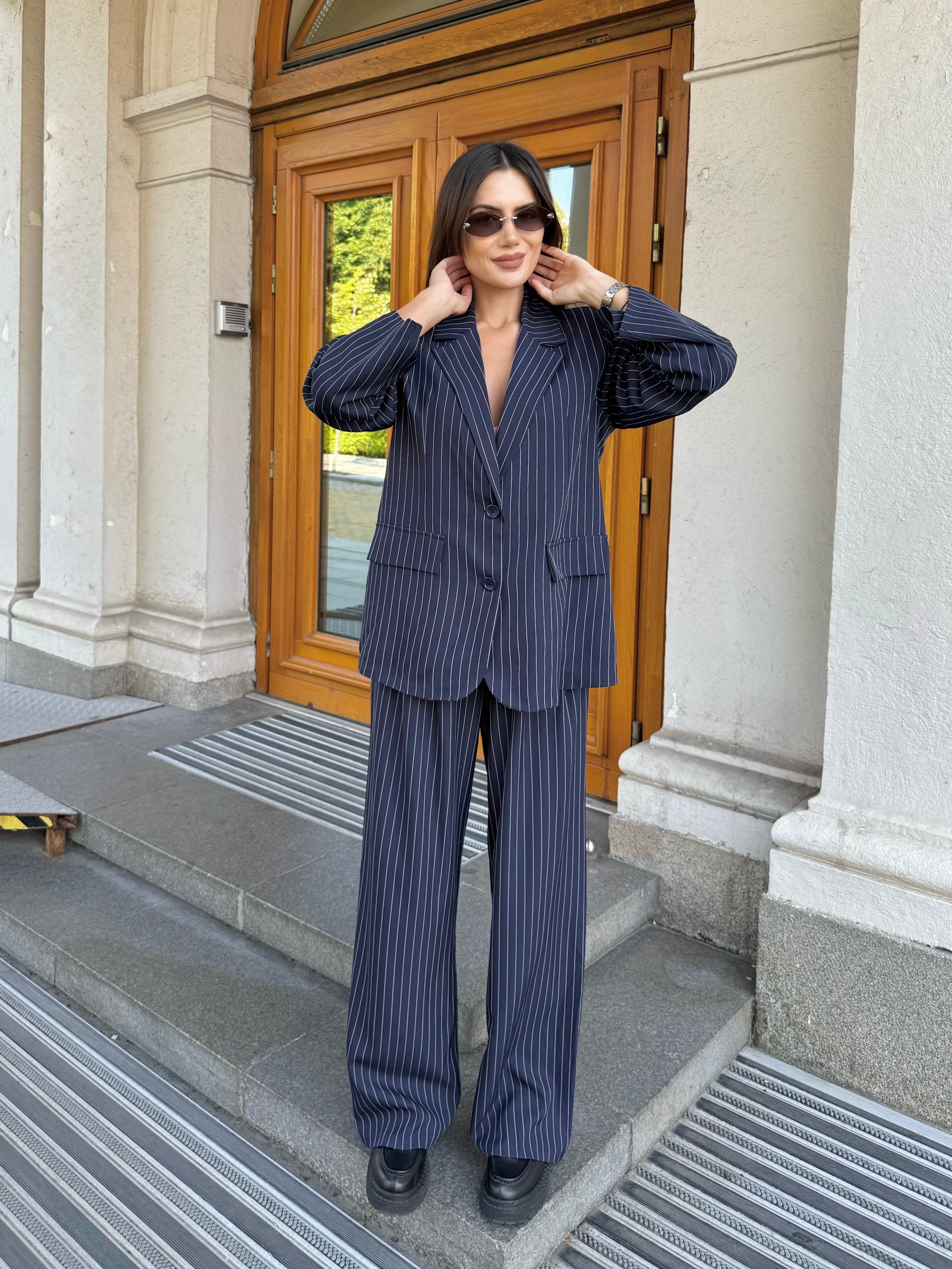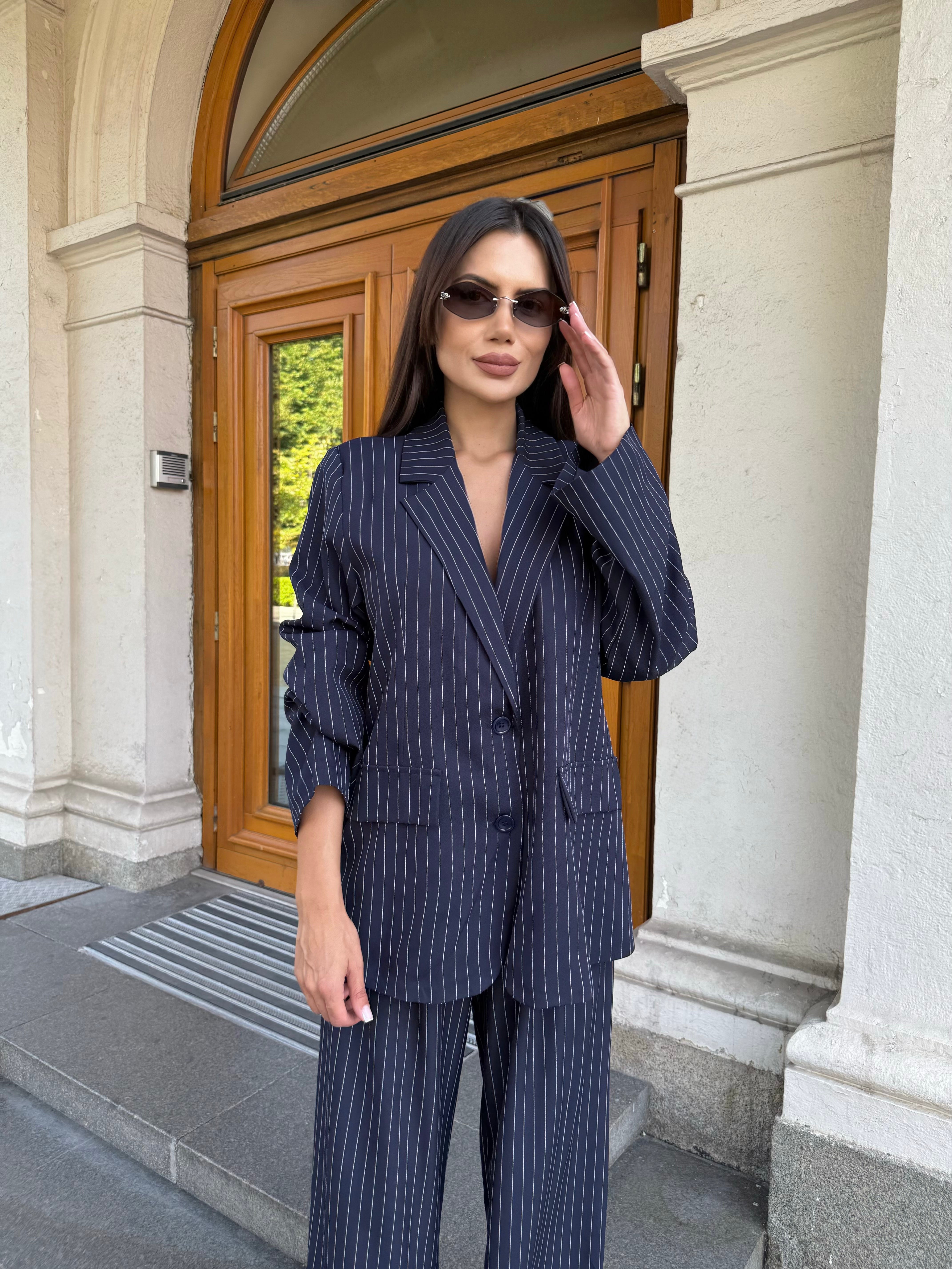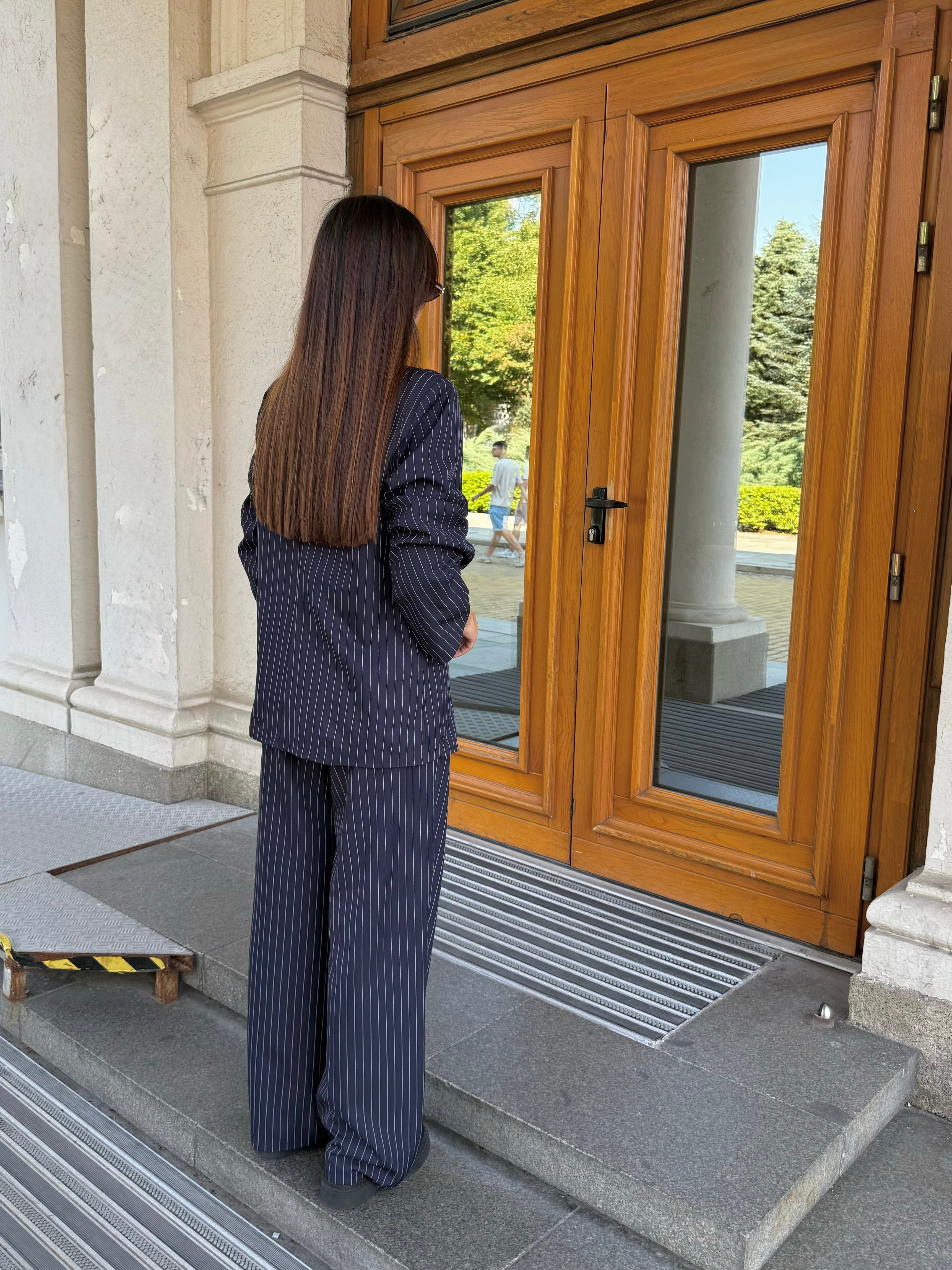 Елегантен дамски костюм в тъмносиньо райе. Сакото е издължено, с колан за подчертаване на талията, а панталонът е с удобен ластик в талията и изчистена линия. Класически модел, който придава авторитет и женственост – подходящ за бизнес срещи, специални поводи или ежедневна елегантност.