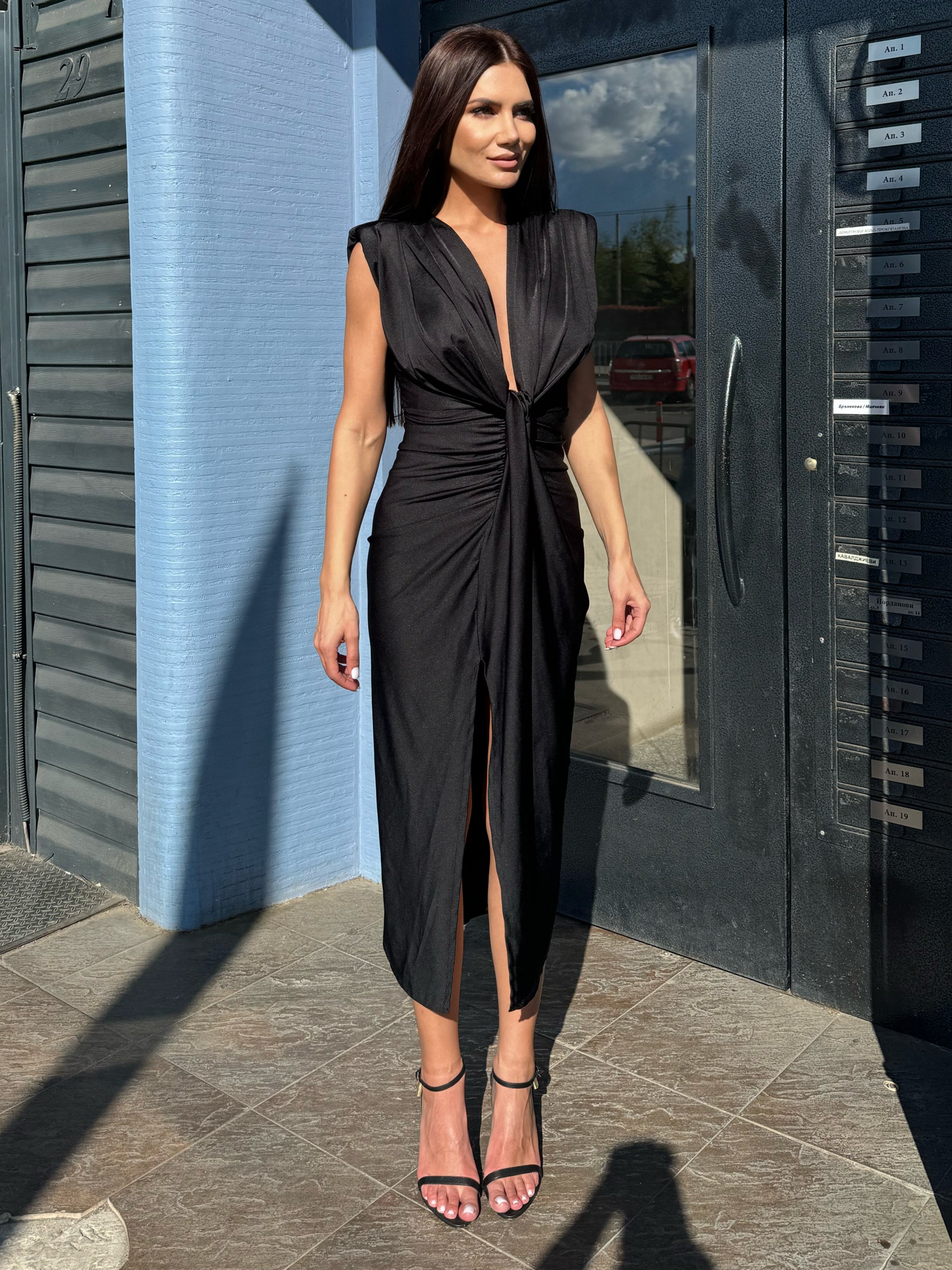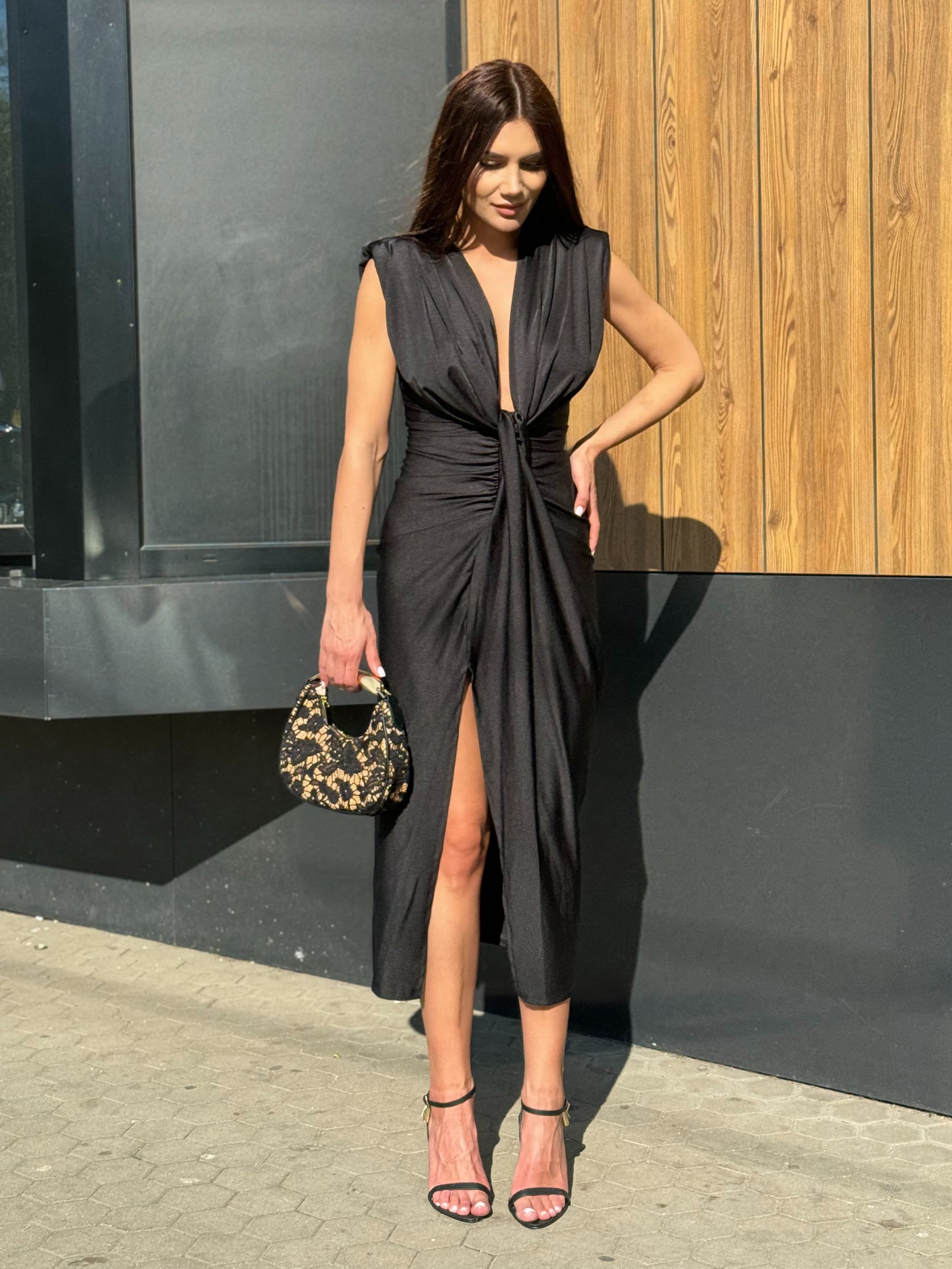 Роклята KIM е създадена за жени, които не се страхуват да бъдат забелязани. С елегантна драпировка, подчертана талия и дълбоко V-деколте, този модел комбинира сексапил с изисканост. Изработена от лека, еластична материя с луксозен сатениран финиш, роклята подчертава силуета и се адаптира към тялото благодарение на универсалния си размер.